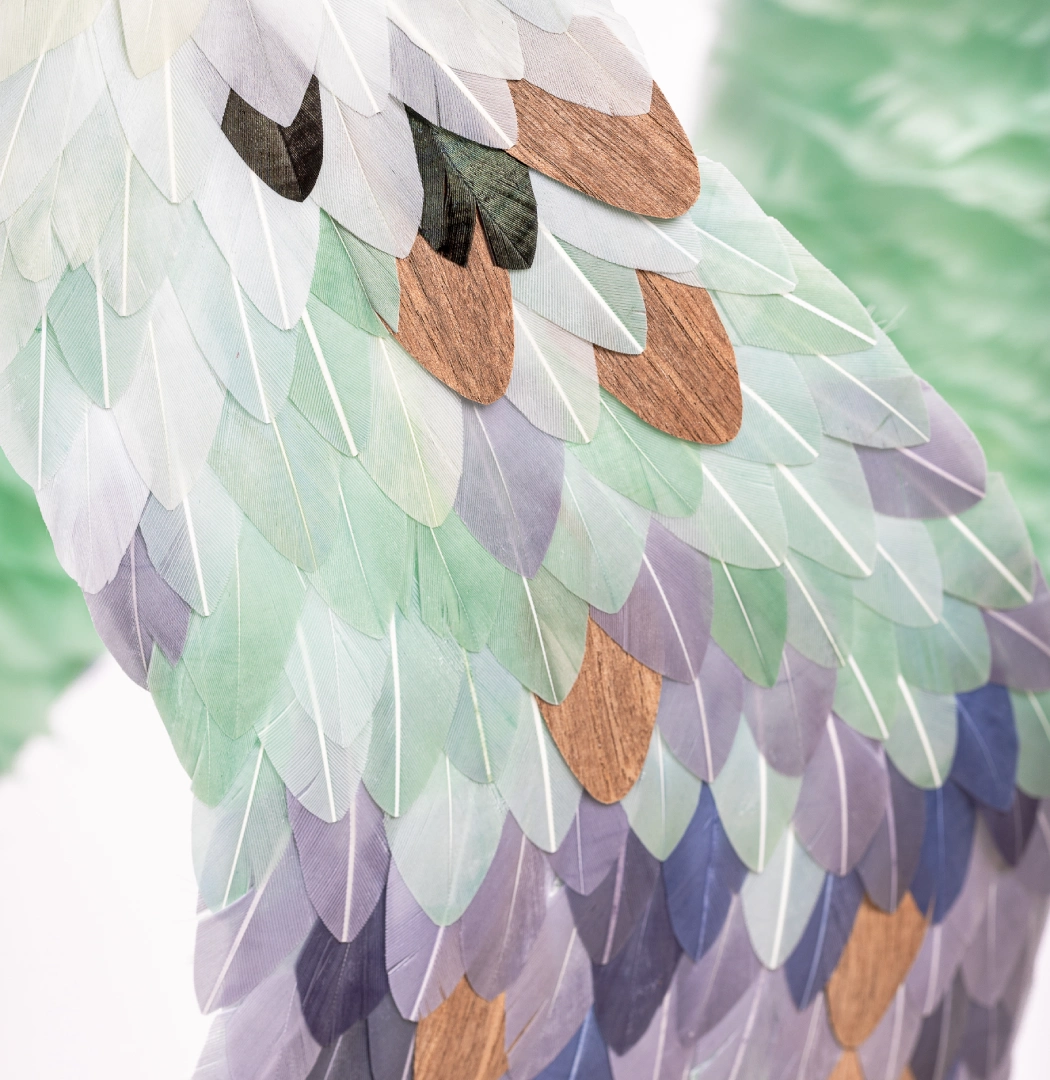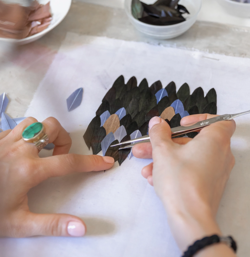 By choosing feathers as her medium of expression, Maud Ruby has taken flight. Her Parisian workshop is pervaded by a romantic atmosphere: that of an artist who transforms Nature’s daintiest gifts into bold statements. In her hands, goose feathers become airy marquetry, while ostrich feathers turn into a rippling fresco. These feathers interact with mother-of-pearl, intertwine with wood, defy gravity, but most importantly, they endure – contrary to common belief. The magic worked by Maud lies precisely in endowing an inherently ephemeral material with unexpected longevity.