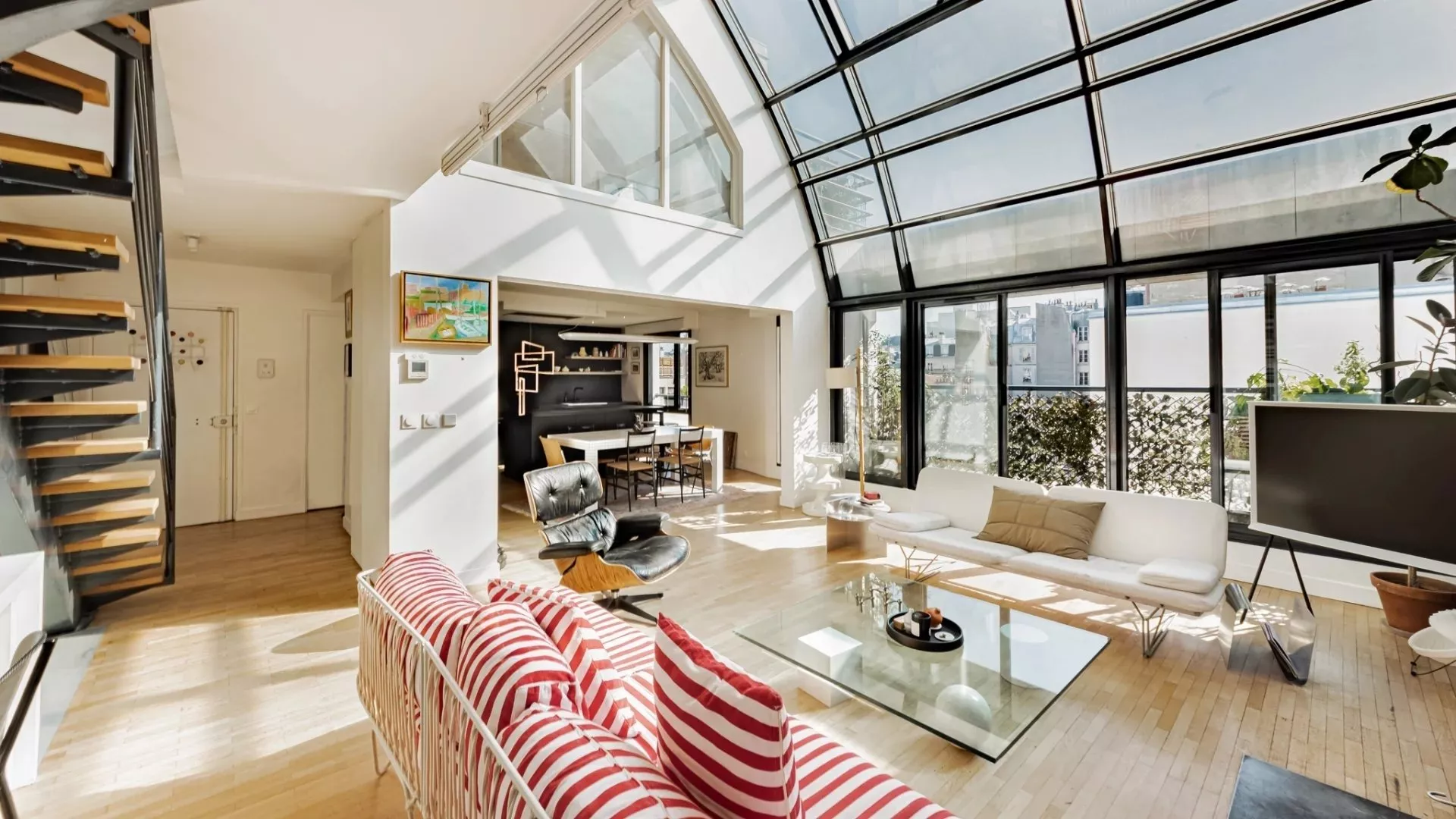 4-room duplex apartment on the top floor with elevator, in a 1990s architect-designed building. Designed in a studio style, bright, with a cathedral ceiling in the living room, a glass roof, and a balcony. Sold: €18,200/sqm.