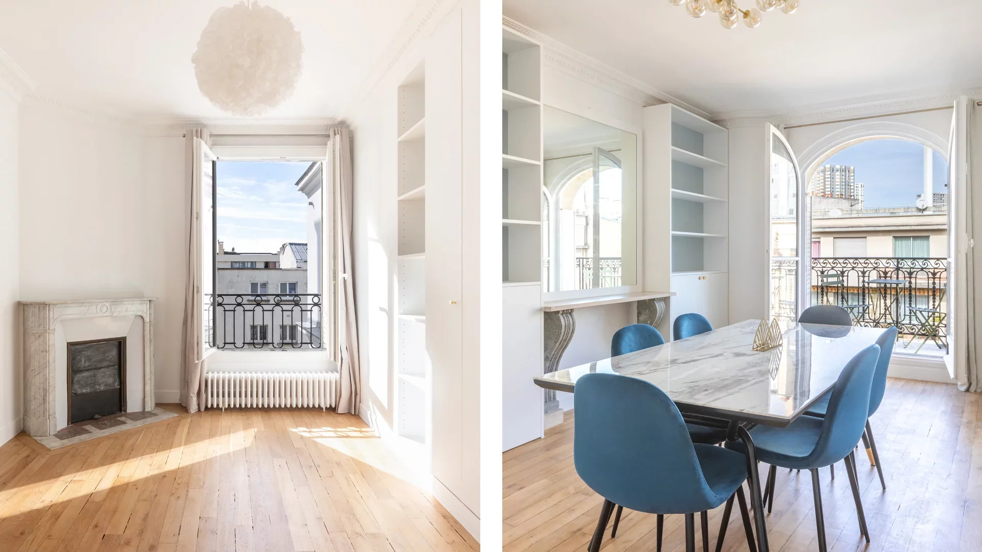 The optimized layout comprises, on the sixth floor, an entrance hall, a double living room opening onto a balcony, a separate fitted and equipped kitchen, two bedrooms, a bathroom, a shower room and a toilet.