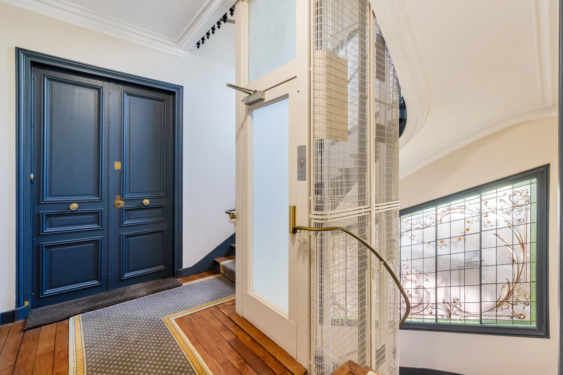 The fourth floor comprises an entrance hall, a vast double living room opening onto a full-length balcony, two spacious bedrooms, a separate kitchen opposite the reception room, a shower room, a dressing room, and a separate toilet.