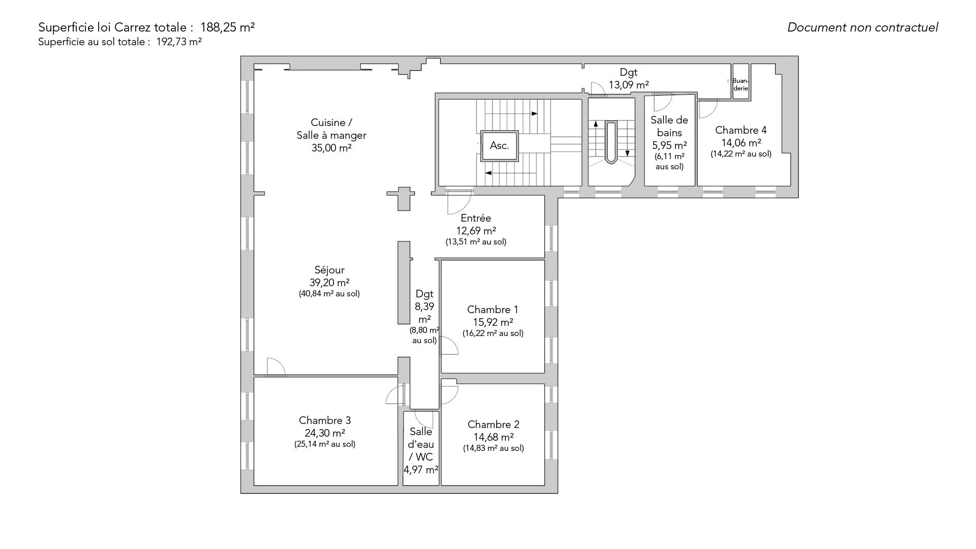 With a surface area of 188.25sqm Carrez, it is located on the third floor of a beautiful stone building accessible by elevator.