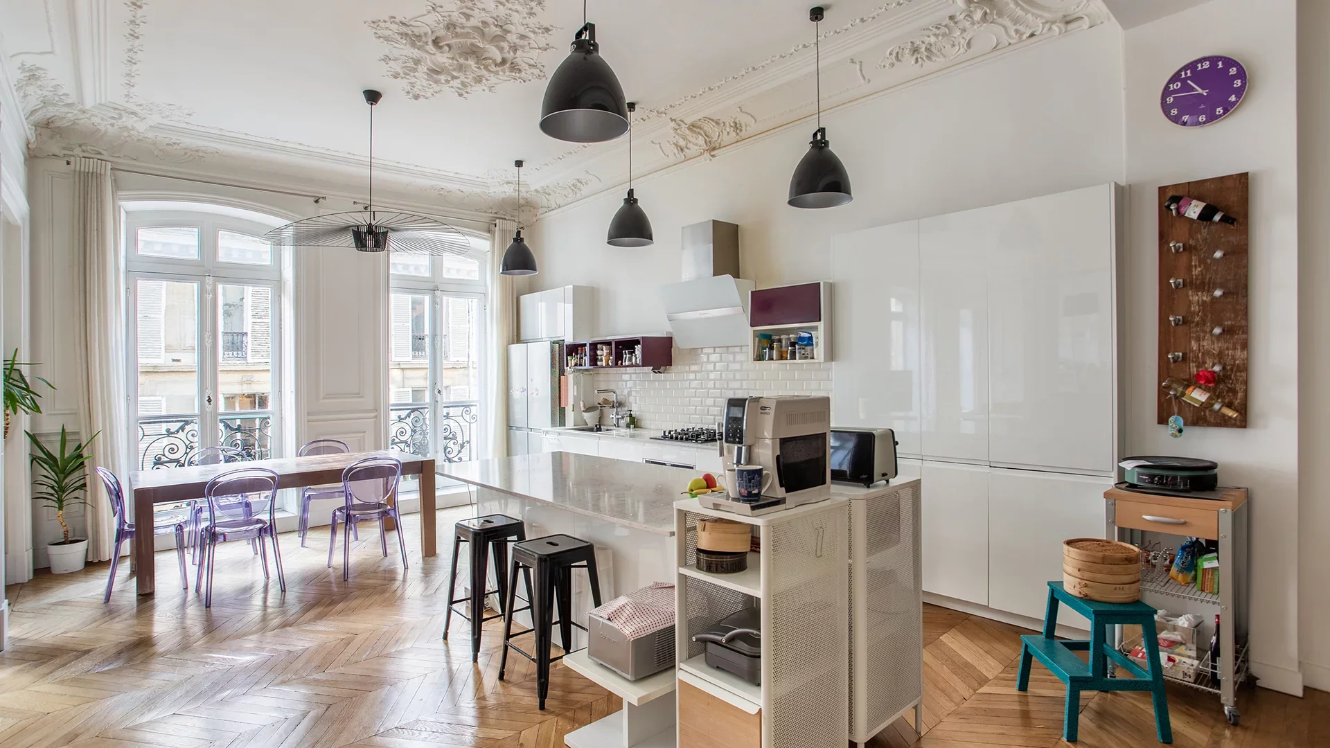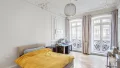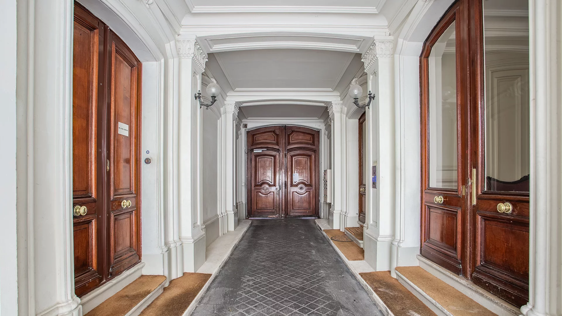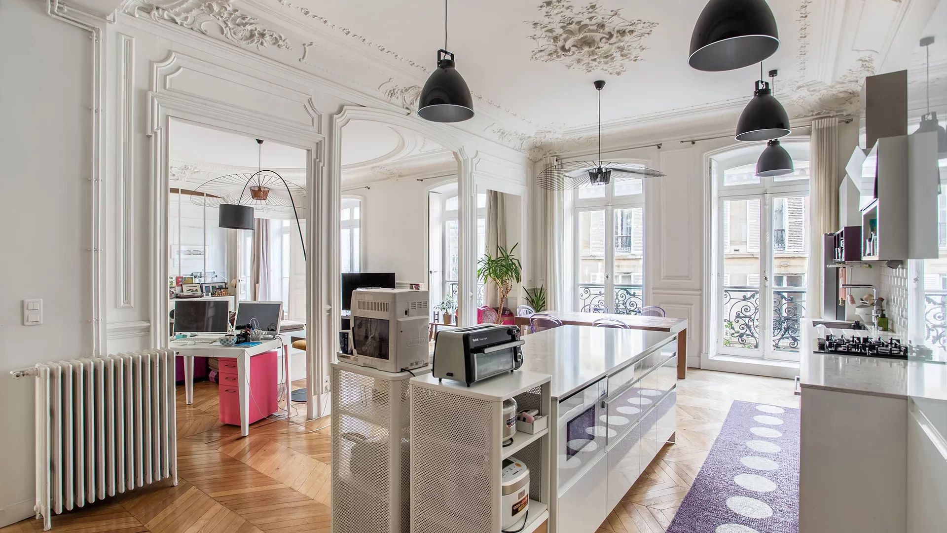 The old-world charm has been preserved, with herringbone parquet flooring, sumptuous moldings and a period fireplace, and the apartment boasts 3.50m high ceilings.