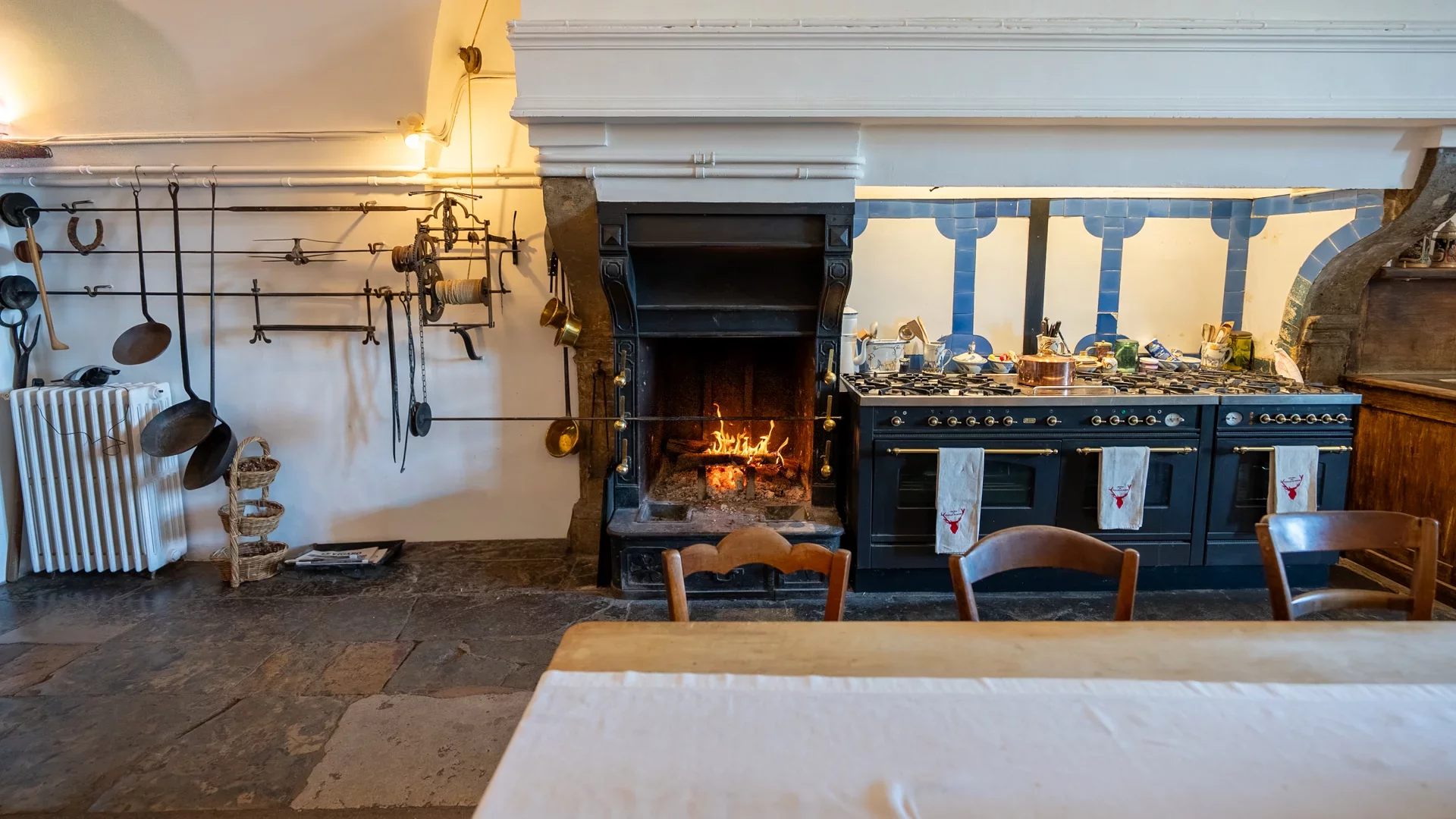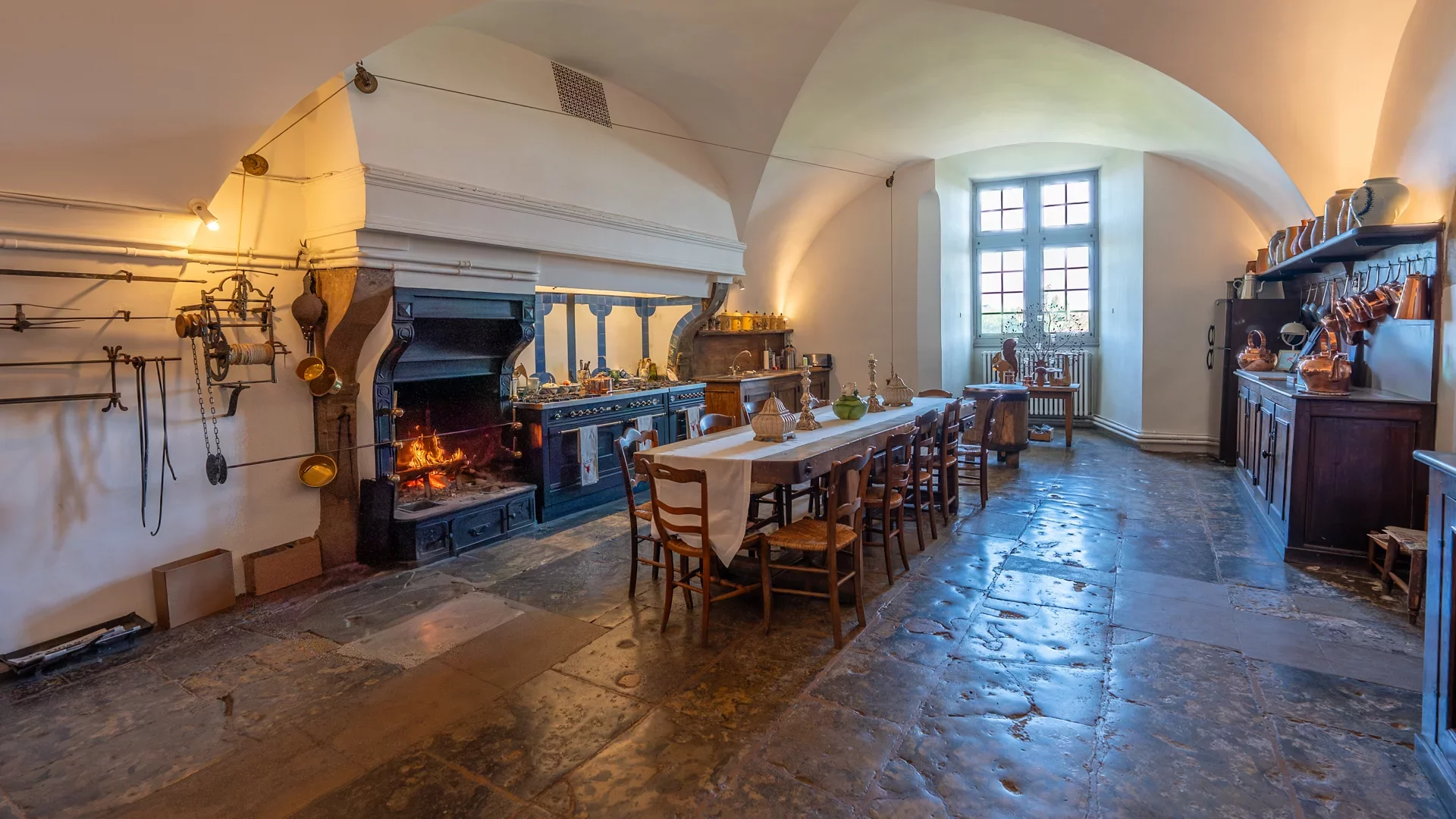 The ground floor of the castle features a hunting room, a large living room, a dining room, and a 13th-century cellar. The kitchen, dating from the 15th century, is equipped with a fireplace, a 17th-century spit, and a cold room, with decoration inspired by Renaissance aesthetic codes. A professional kitchen is also present.
