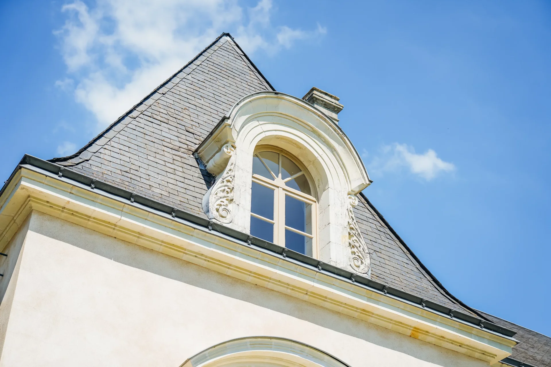 Sheltered from view, this neo-classical residence comprises a central body flanked by two symmetrical side wings. Each facade is enhanced by a monumental staircase, while the tufa stone panels are topped by alternating triangular and curved pediments. Numerous ashlar dormers adorned with fins complete the architectural elegance of the ensemble.