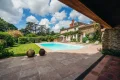 The latter living areas have direct access to the stone-walled pool area. It includes a large terrace, a summer kitchen with a barbecue fireplace under a covered area, and a checkroom with shower and toilet. A spacious games room is located in the wing of the property adjoining the pool area.