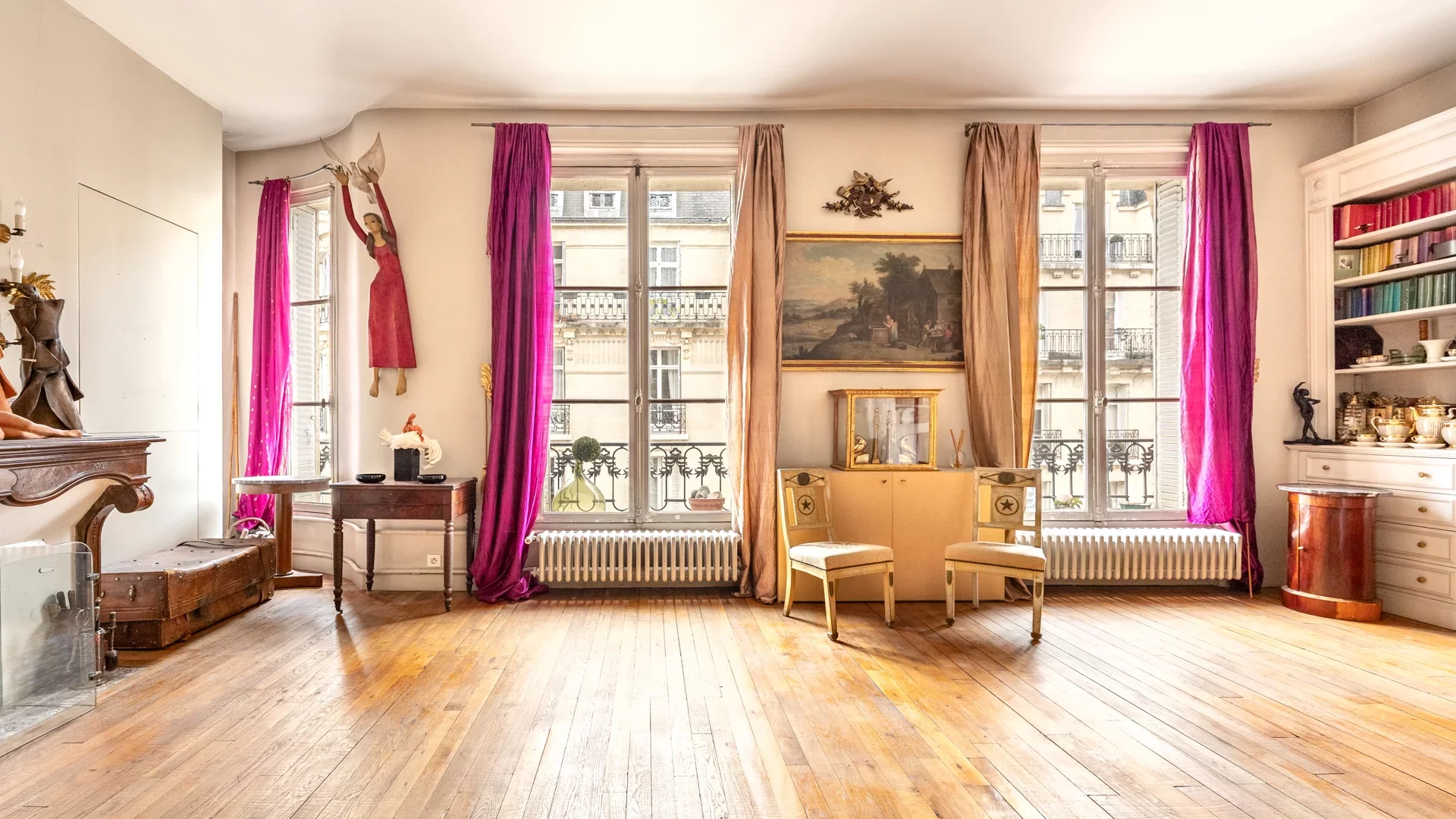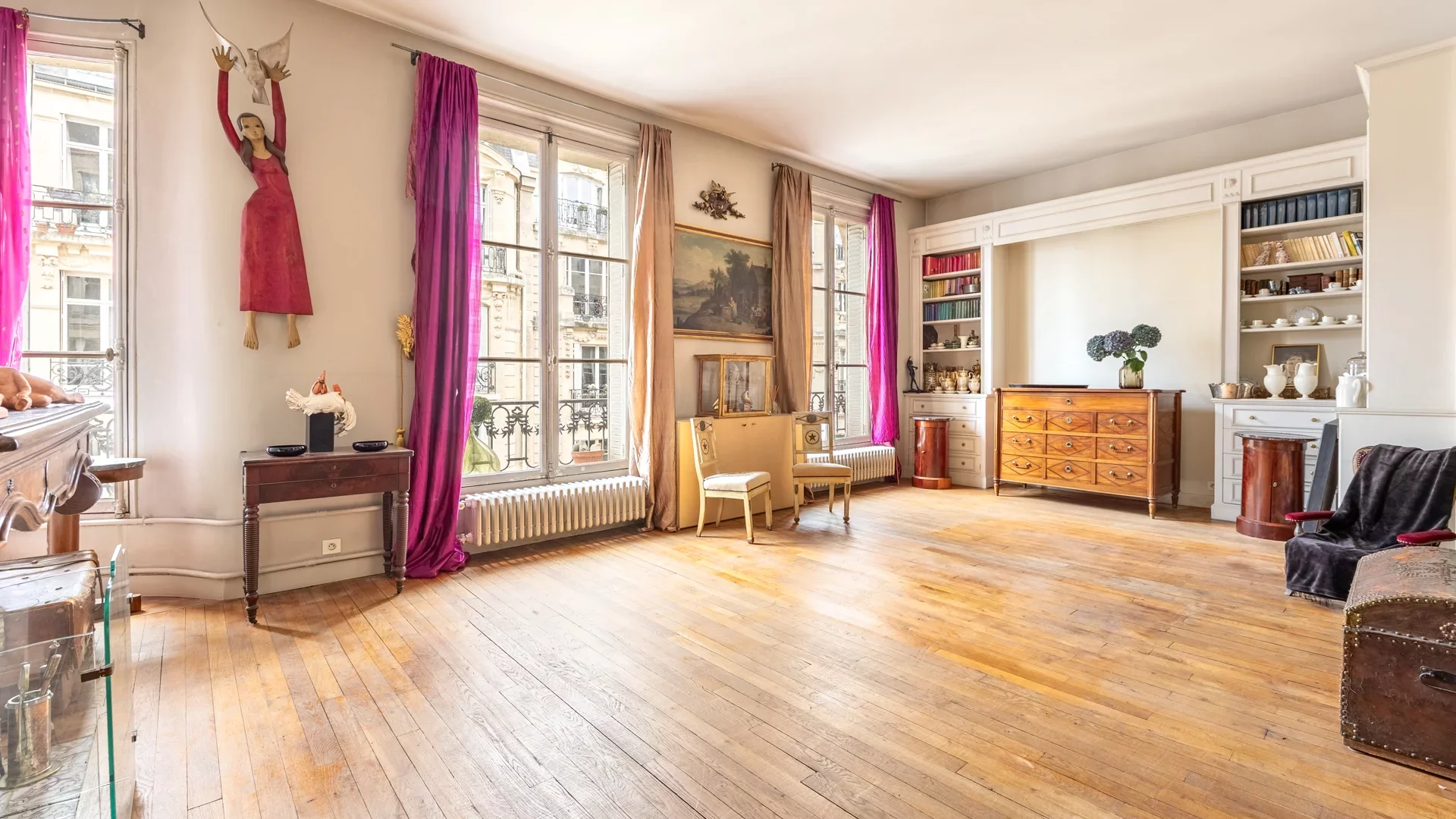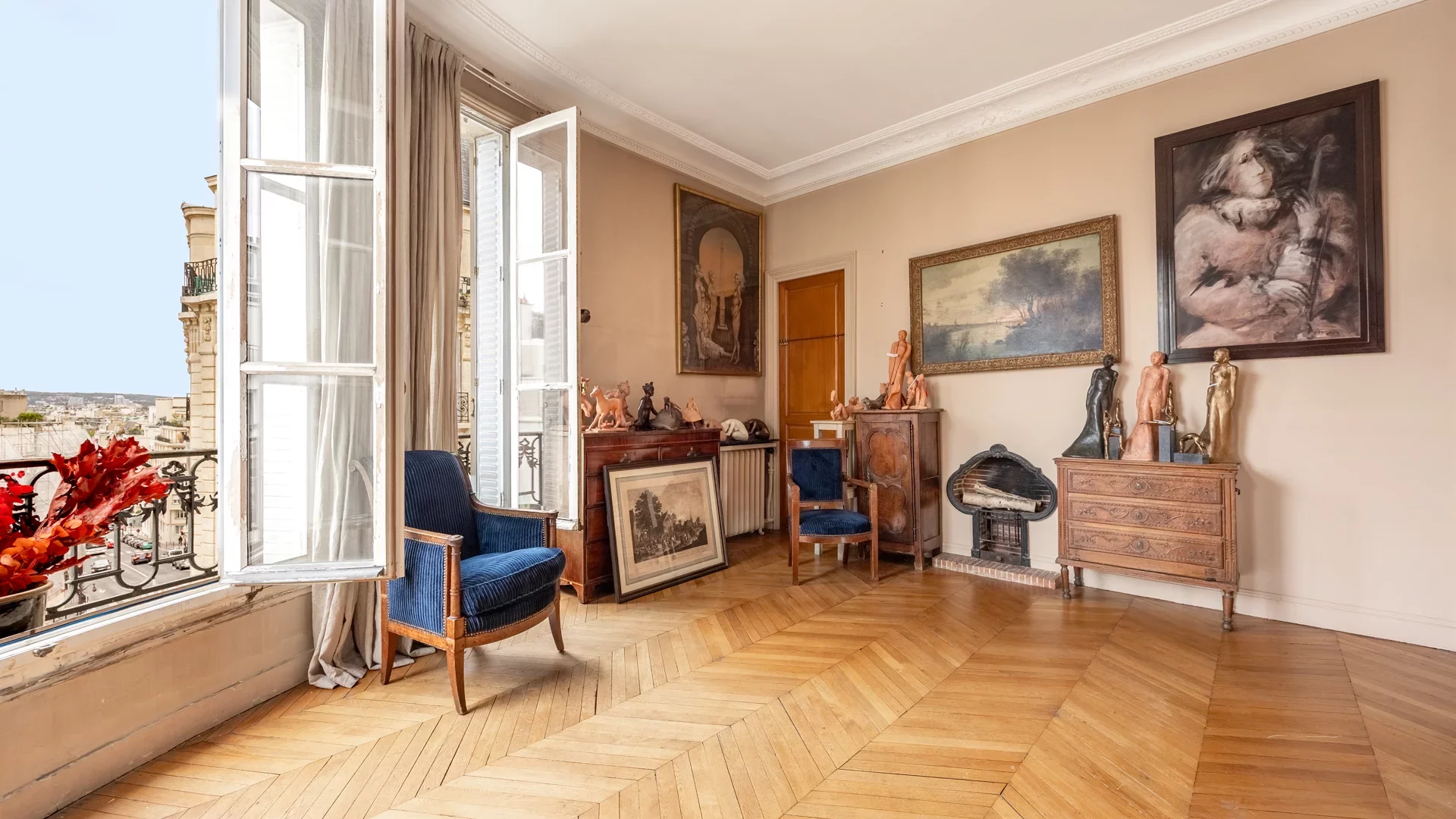 The beautiful period features have been preserved, with herringbone parquet flooring, moldings, elegant fireplaces and high ceilings. Quiet, bright and sunny, this modular property offers superb renovation potential.