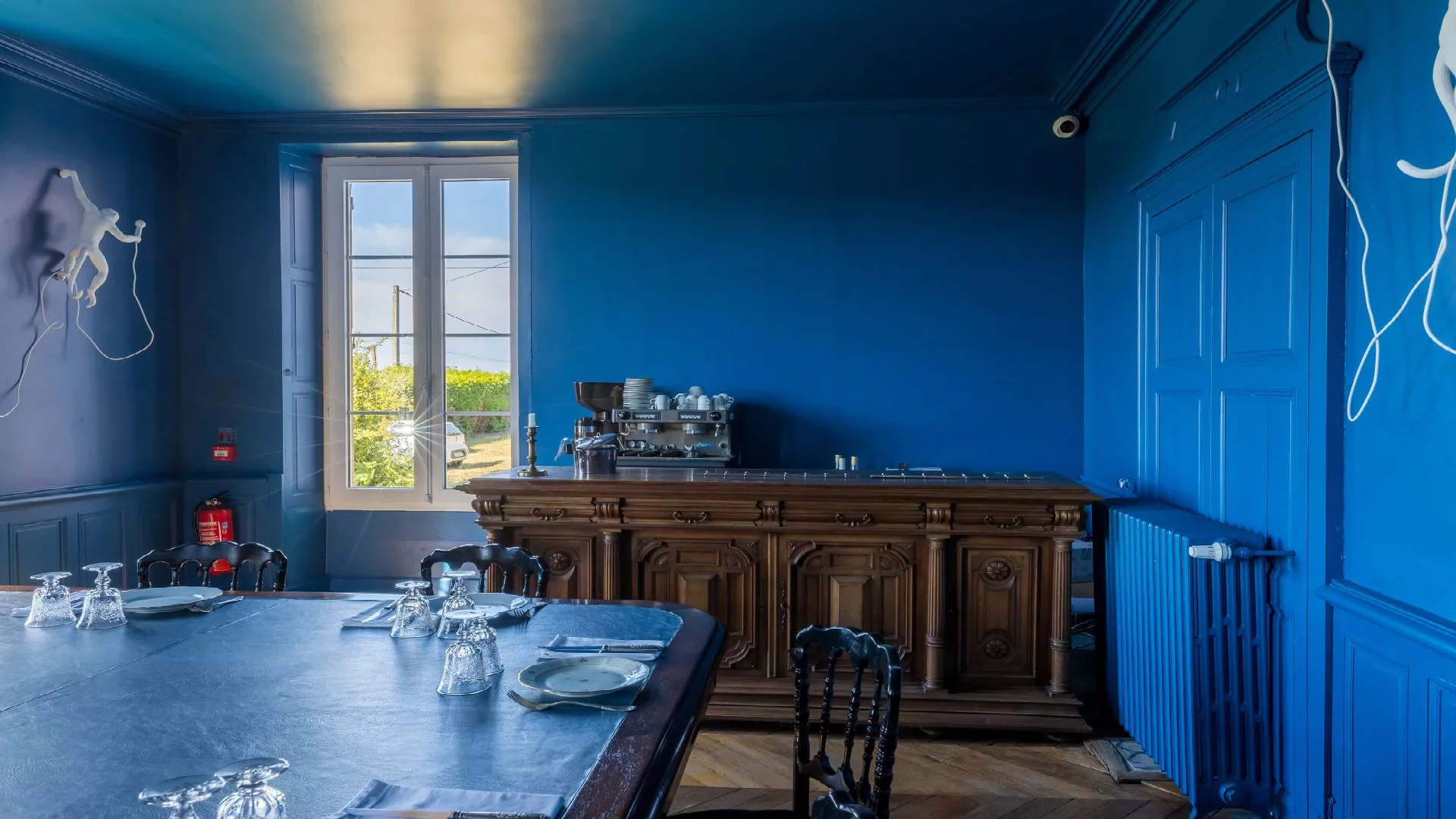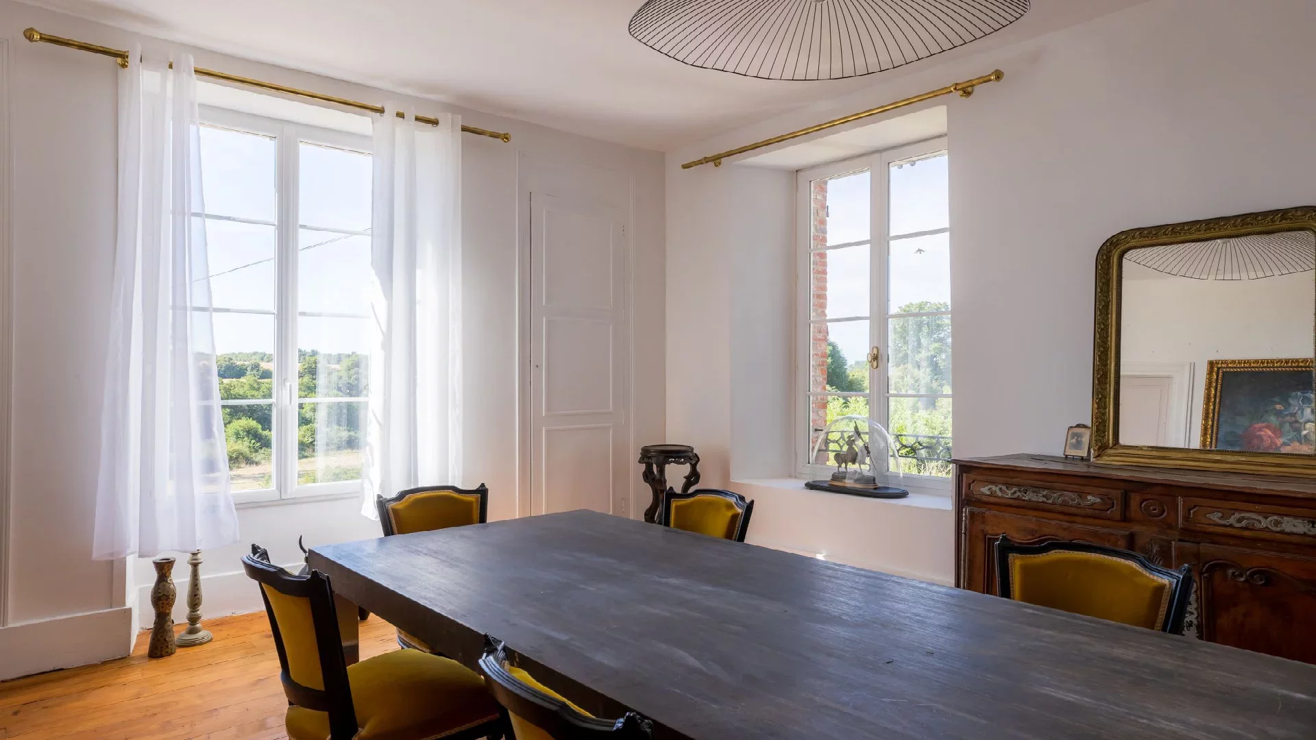 Inside, the ground floor comprises two reception rooms, a welcoming lounge, a professional kitchen, a cloakroom, an office, and a cellar. The floors are accessible via a double-flight staircase and a service staircase, both made of oak.