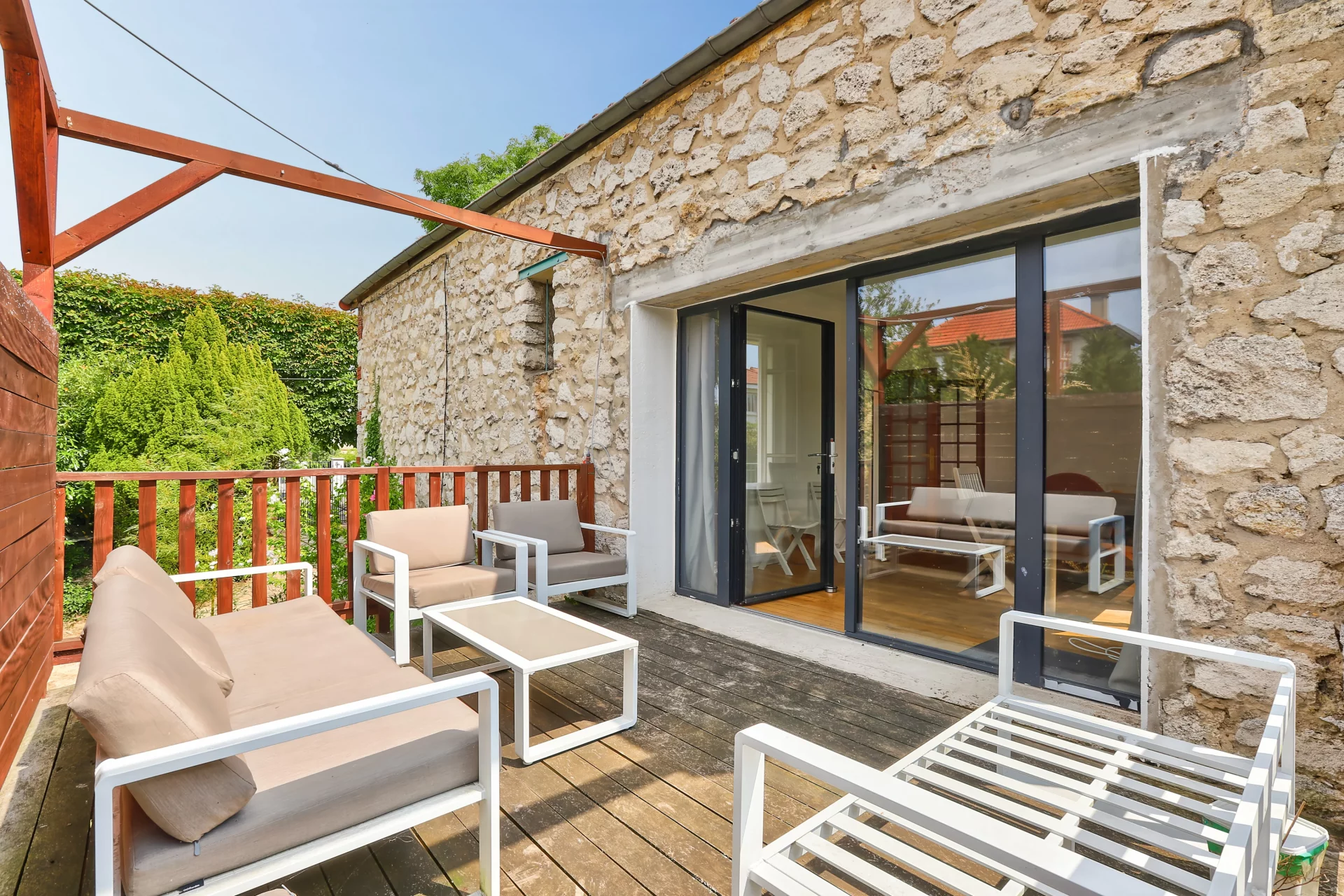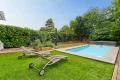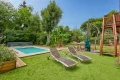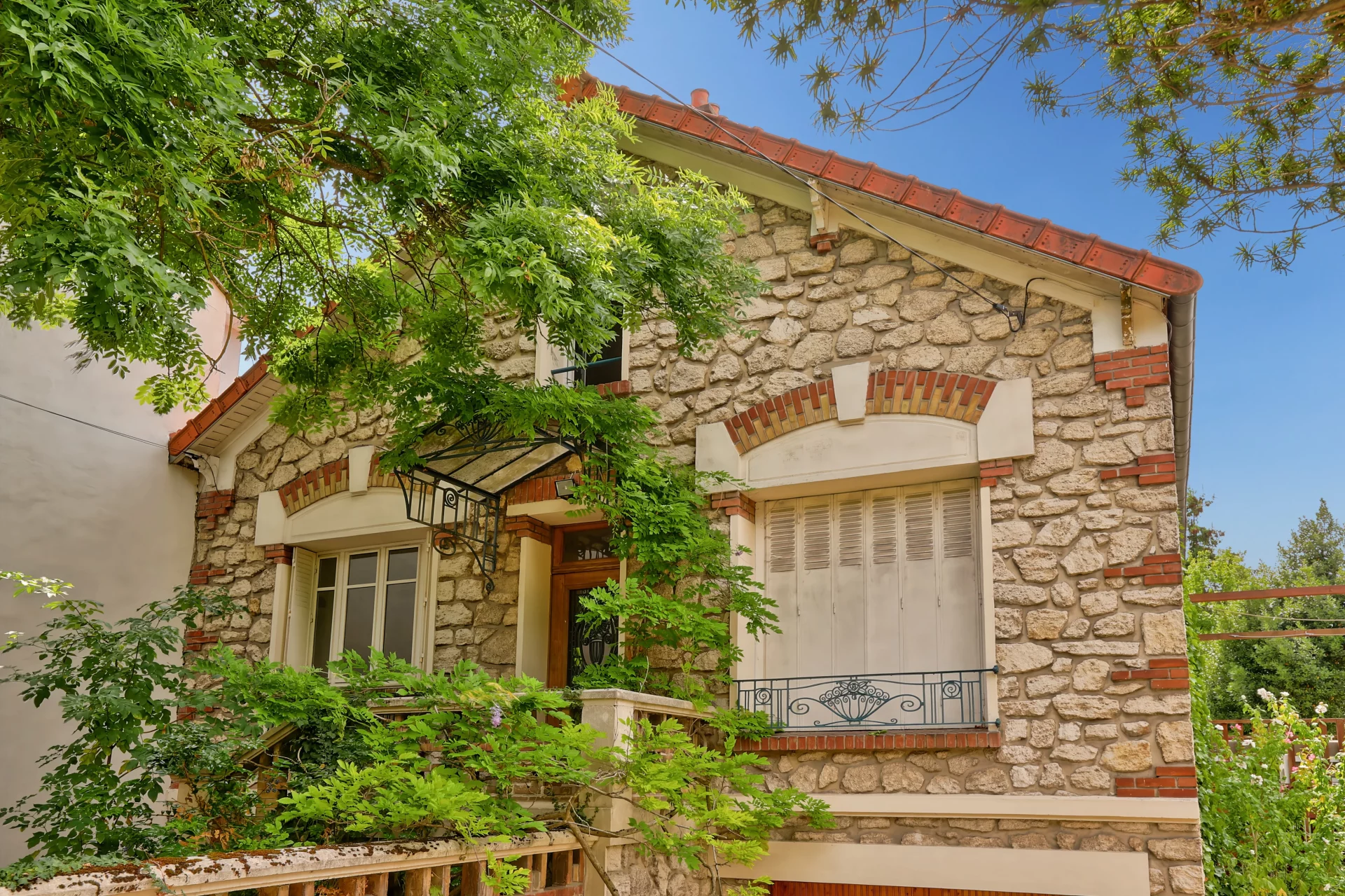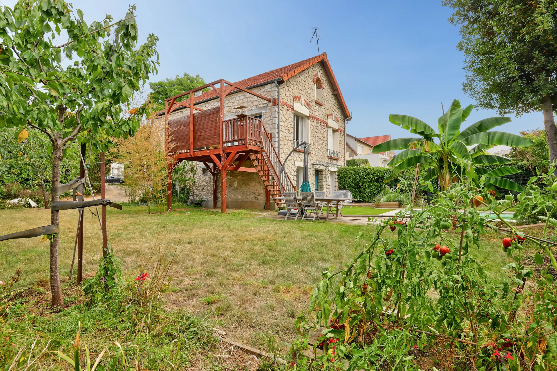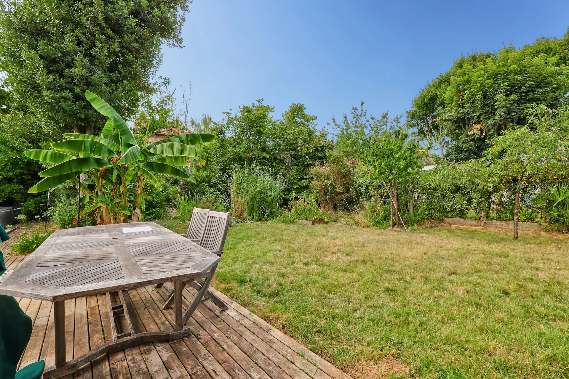 In the heart of the Golden Triangle, this elegant 1930s house, built on an 824sqm plot, features a first floor entrance hall leading to a kitchen, dining room, vast double living room opening onto a wooden terrace, bathroom and toilet.