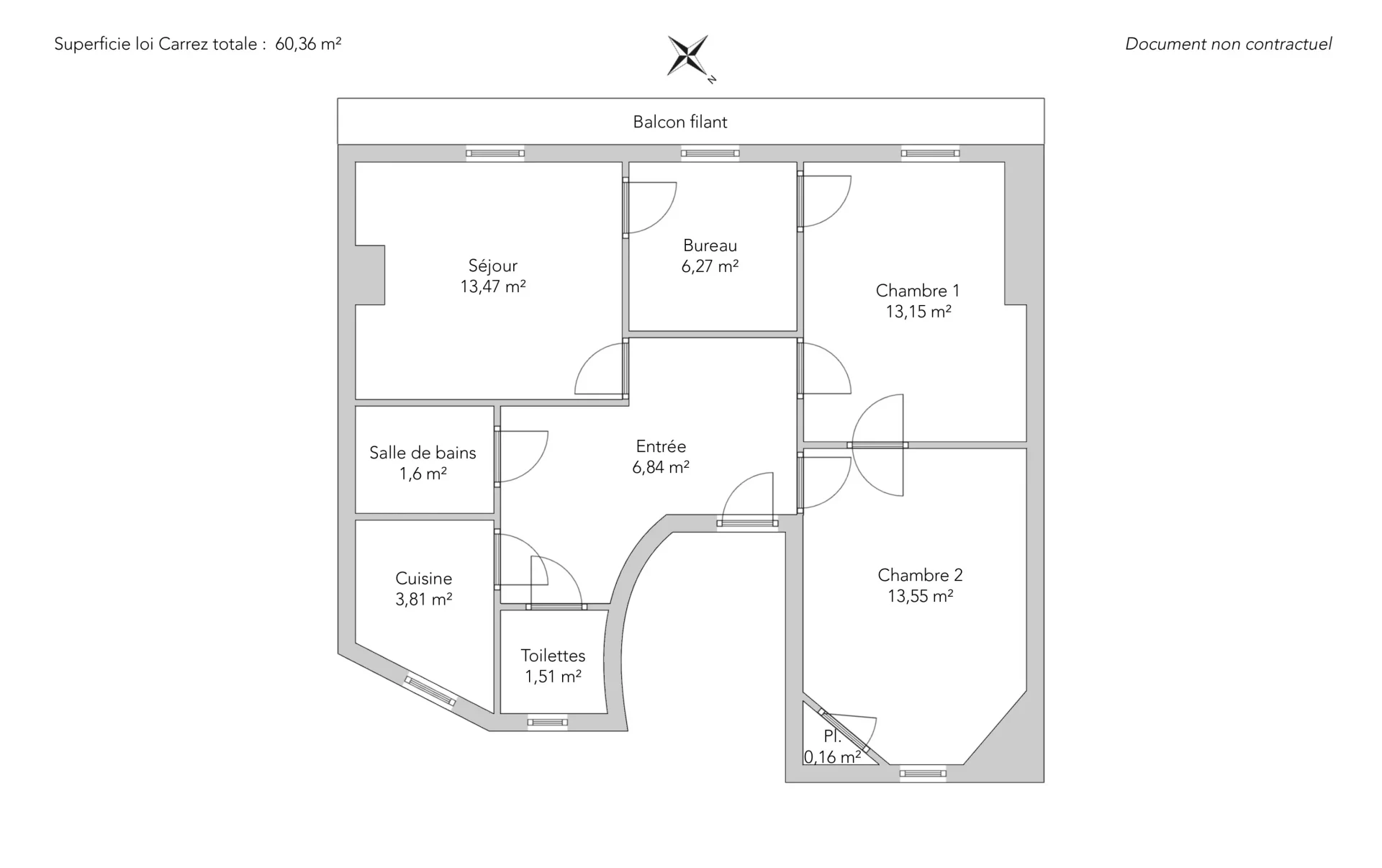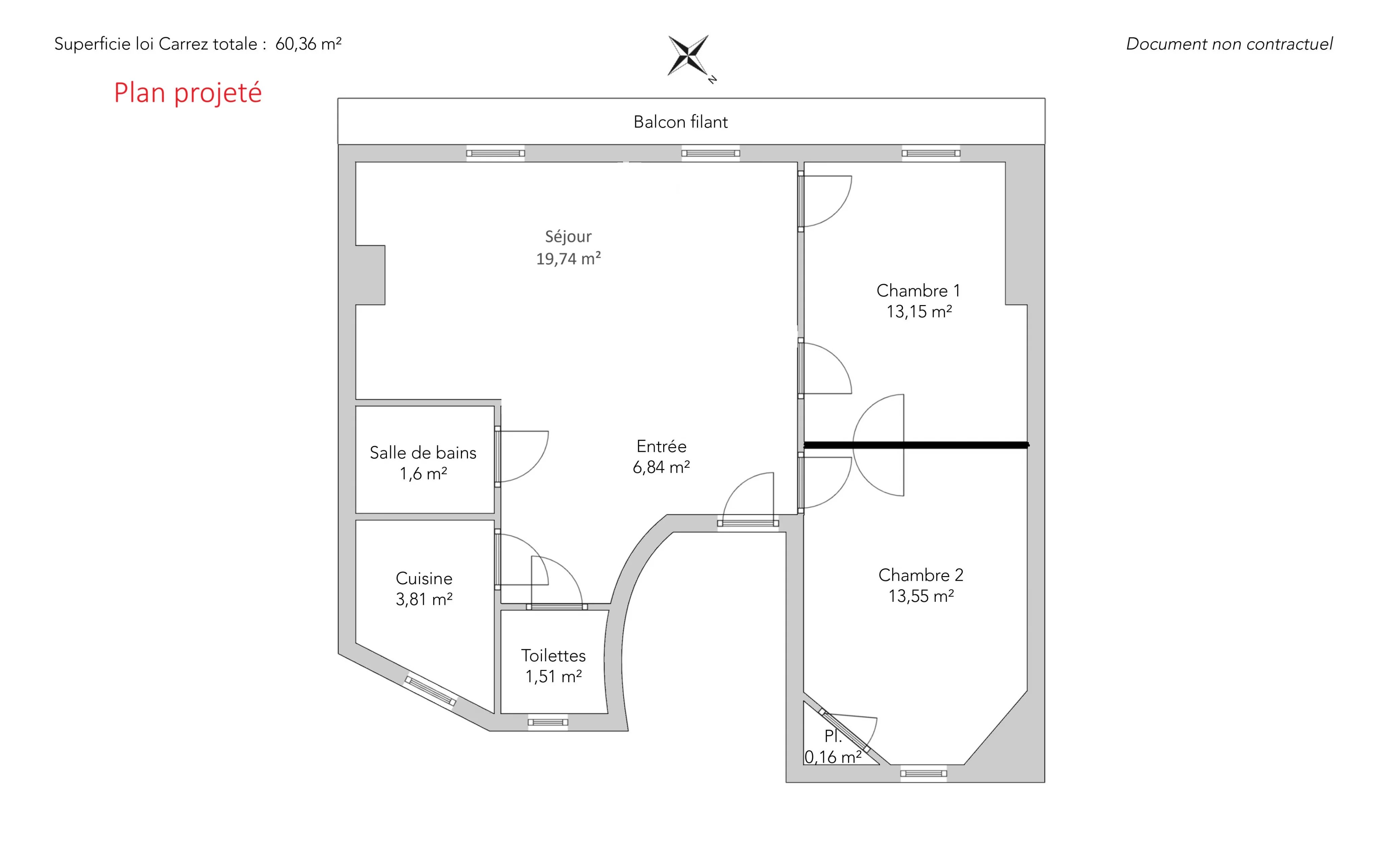 In a quiet area and benefiting from a star-shaped layout, it consists of an entrance, a living room opening onto a pleasant continuous balcony, an independent kitchen, as well as a sleeping area including two bedrooms and an office.