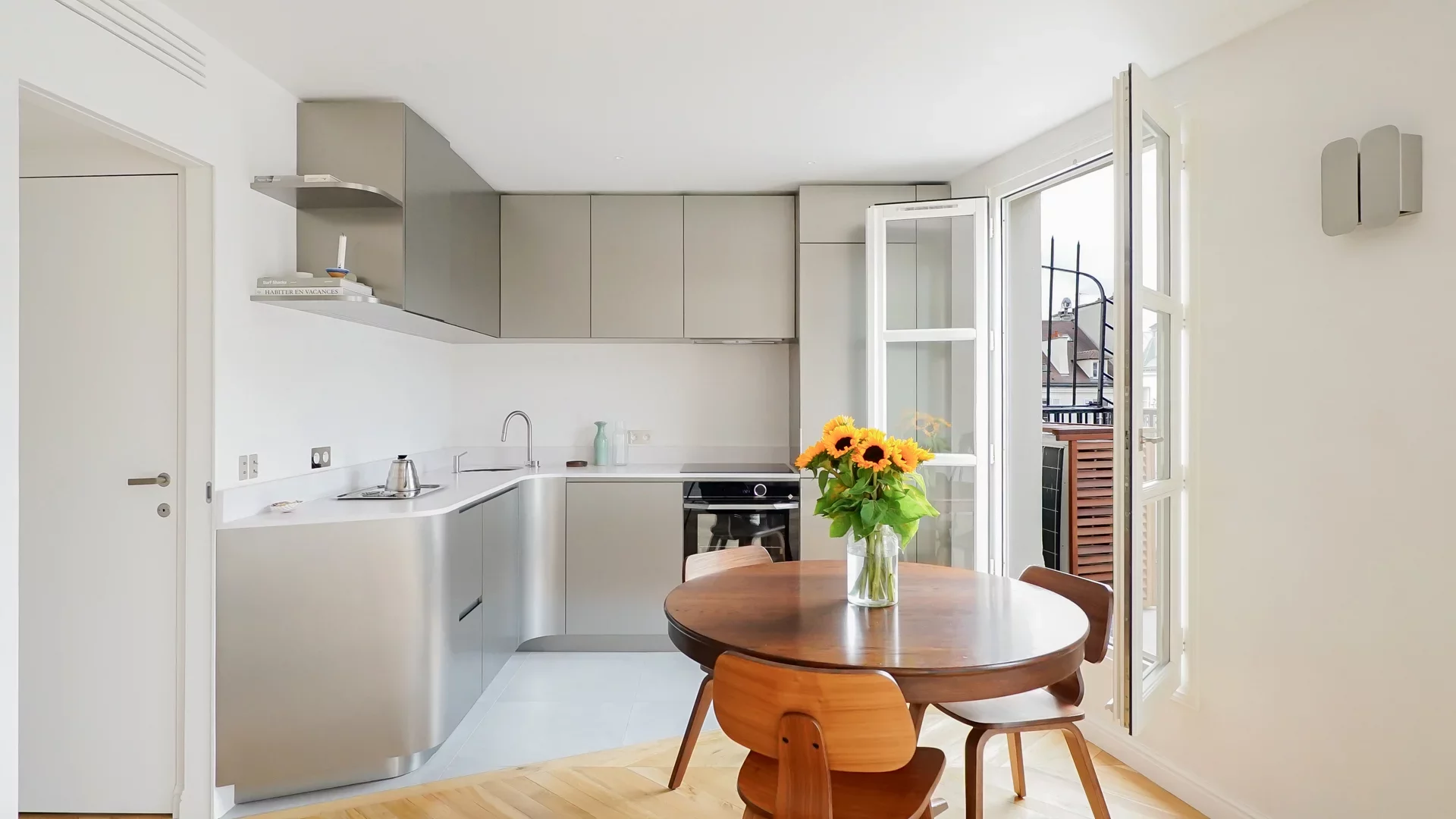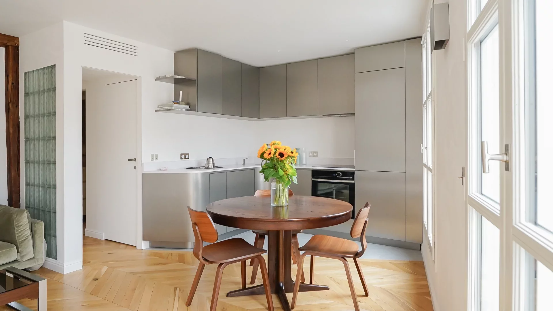 Highly sought-after address for this property in a fully renovated building (street and courtyard facade refurbished and windows changed, roof, stairwell and elevator voted paid for and installed in October), on the fifth floor by elevator a sumptuous 67sqm loi Carrez apartment. Entirely renovated by an architect, it comprises a lovely, sunny west-facing living room with three windows opening onto a 15sqm terrace, an open kitchen with quality materials, two bedrooms with storage space, a bathroom, a laundry room and separate toilet. A cellar completes this offer.