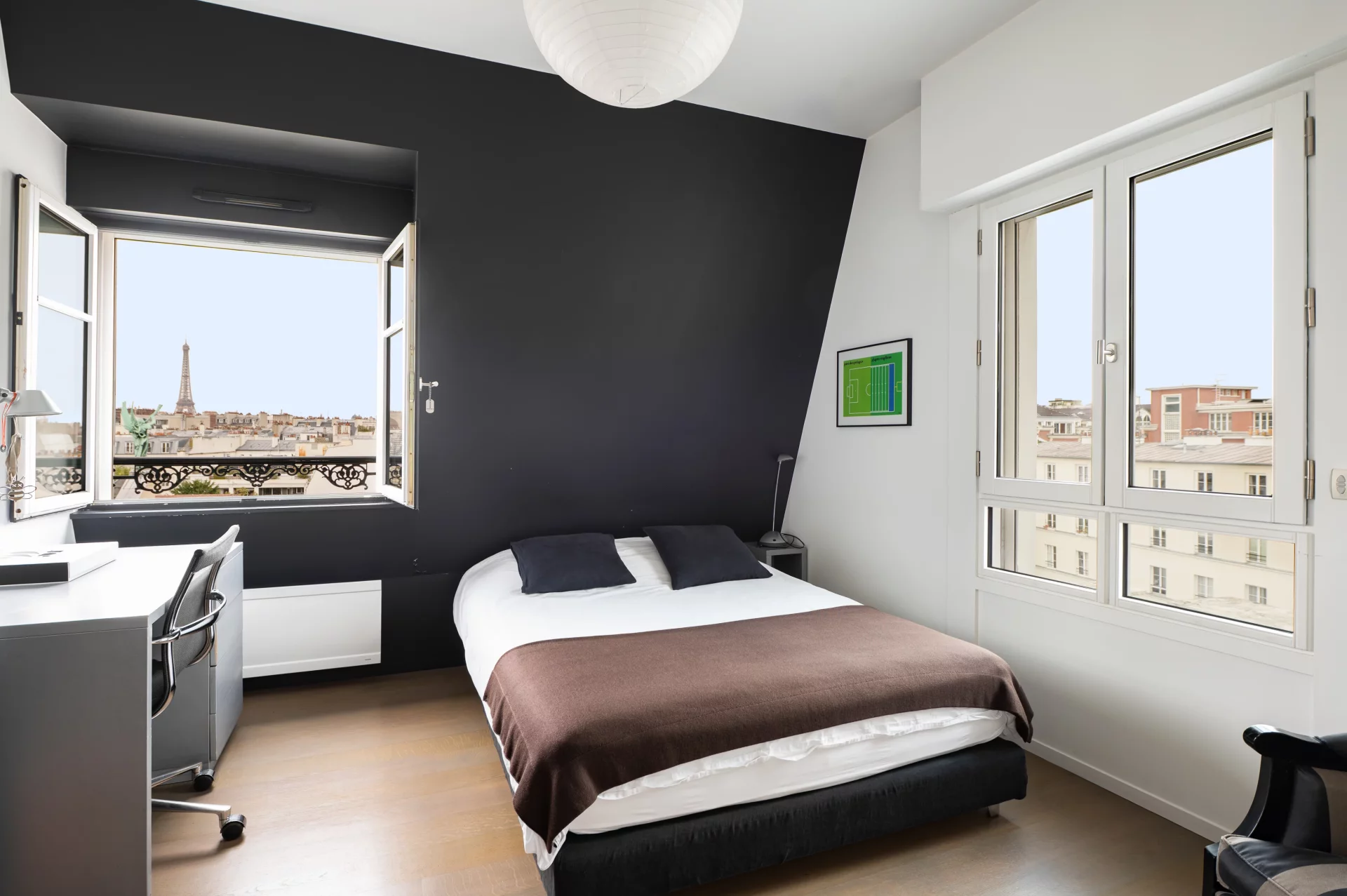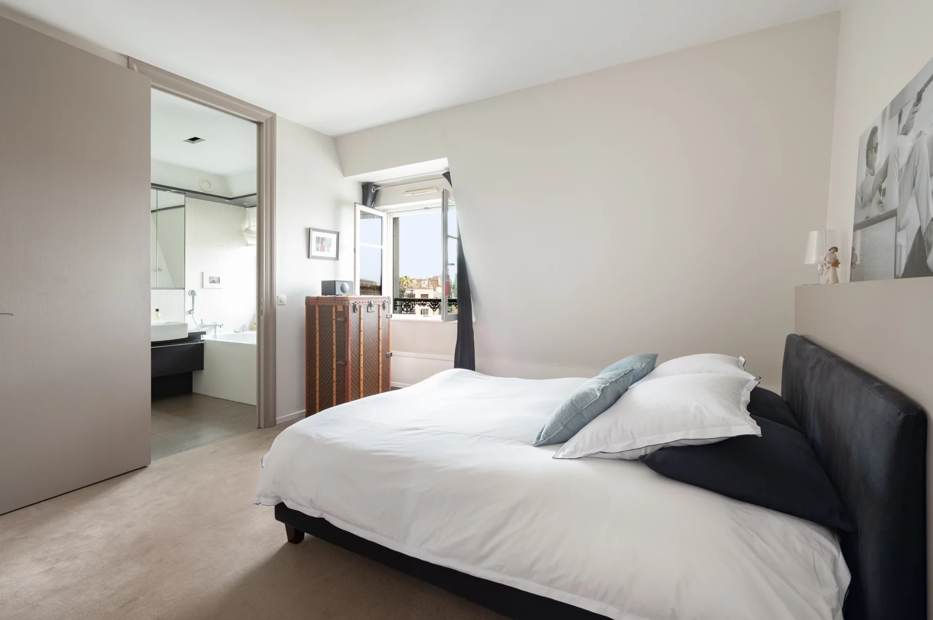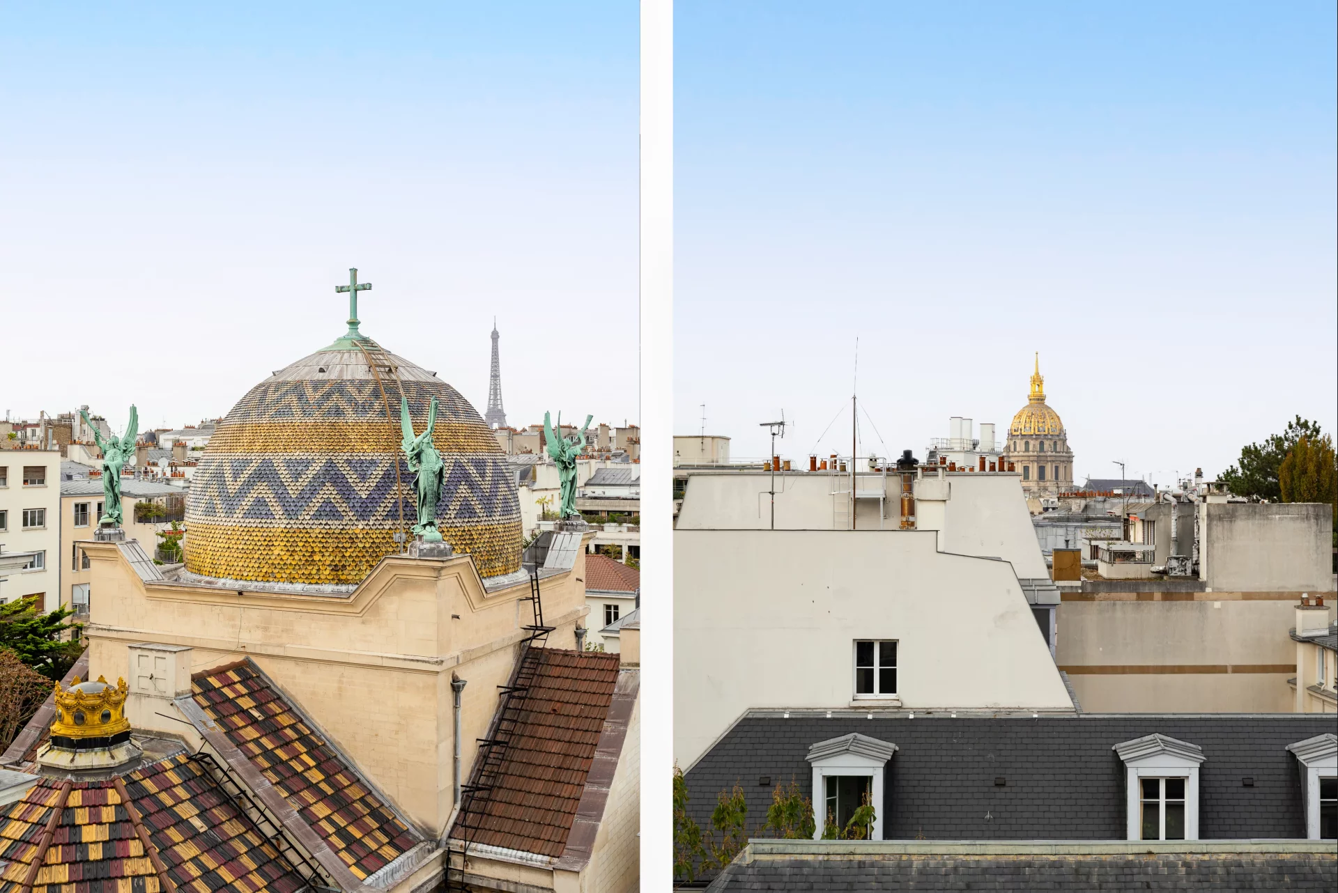 On the sixth and top floor by elevator of an elegant building built in 2002, this beautiful family apartment of 128.81sqm loi Carrez and 135.20sqm on the ground floor benefits from triple exposure and magnificent views of monuments.