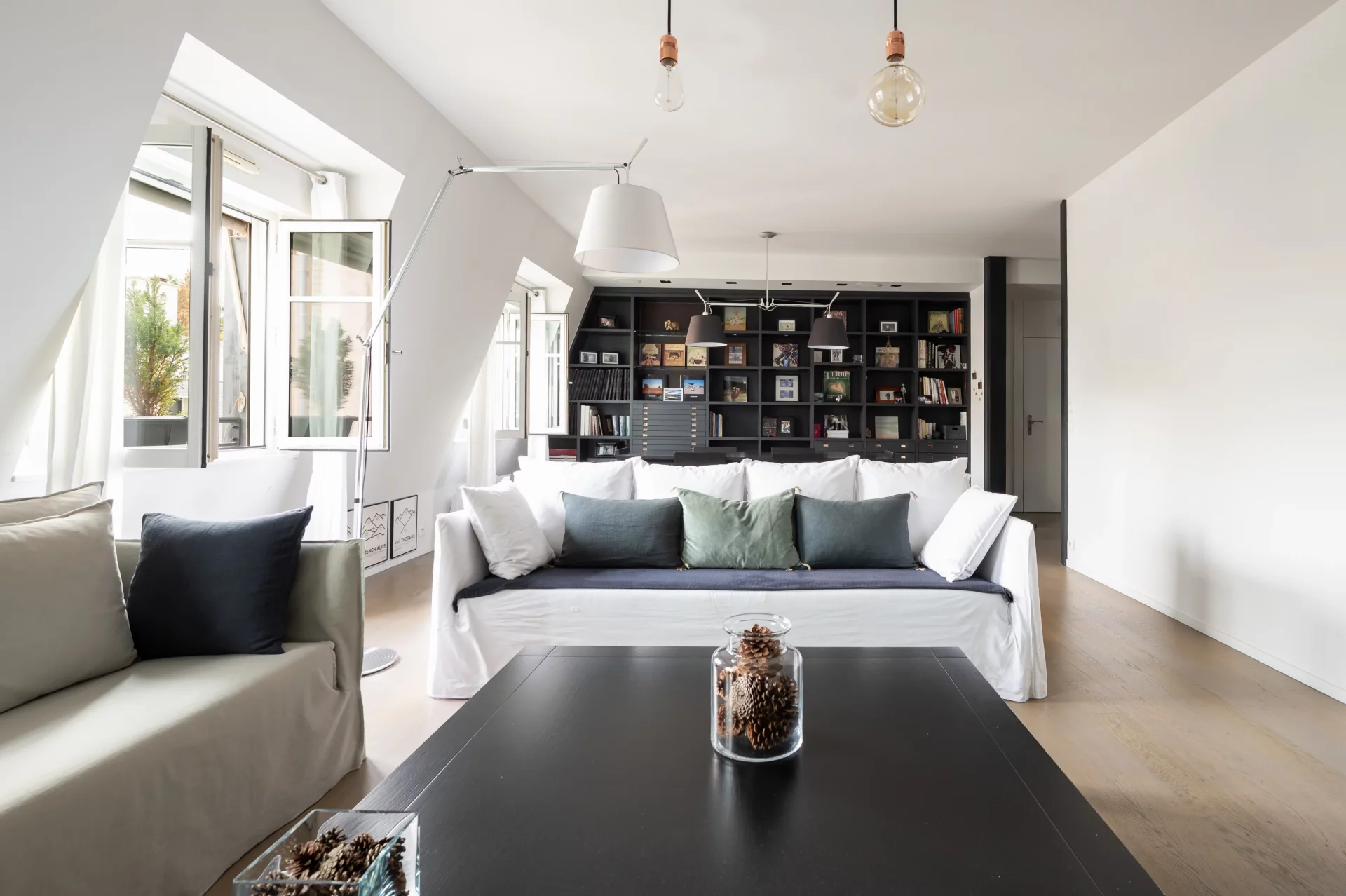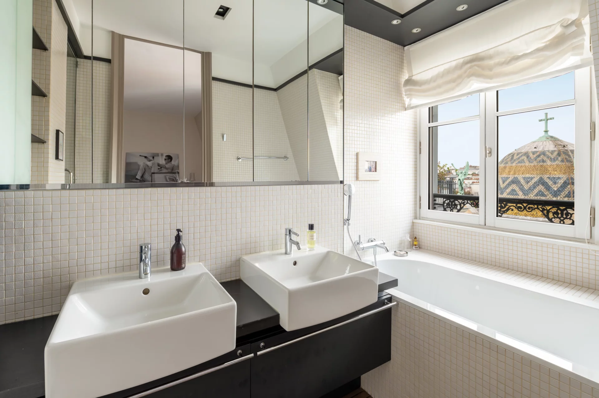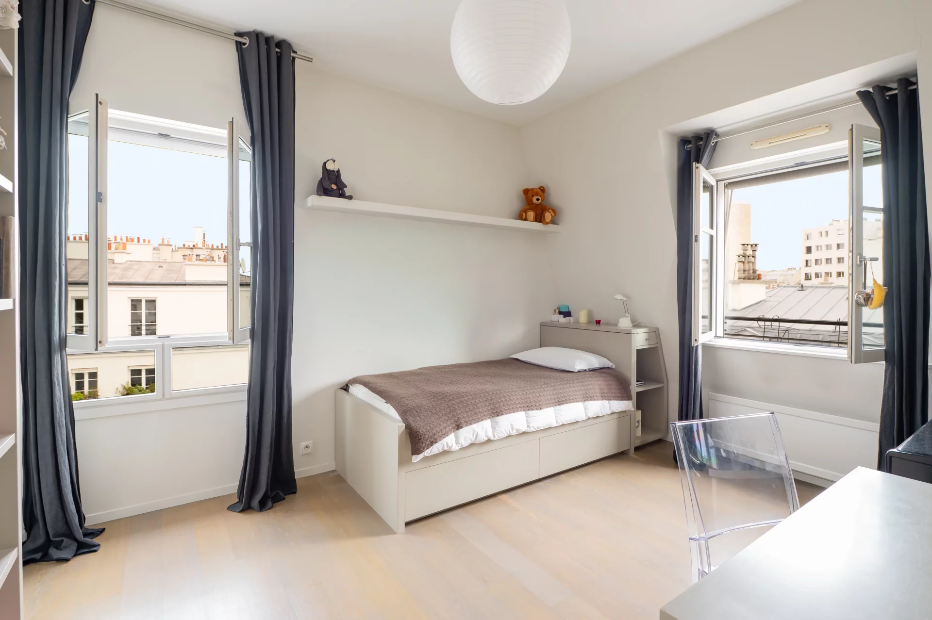 Its perfect layout separates the day and night areas. The entrance opens onto a beautiful double reception room with three windows overlooking the rue du Cherche-Midi. Opposite, a large fitted kitchen offers a dining area. The night space comprises two angled bedrooms sharing a shower room and dressing room, and a master suite with a full bathroom. Two separate toilets complete the layout.