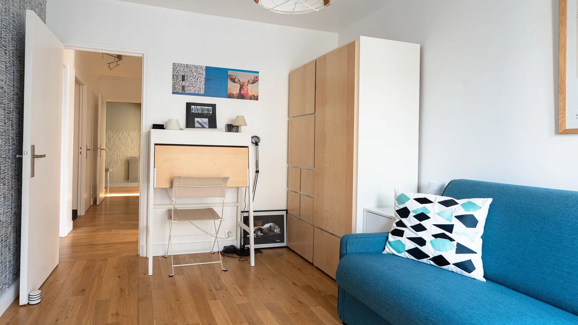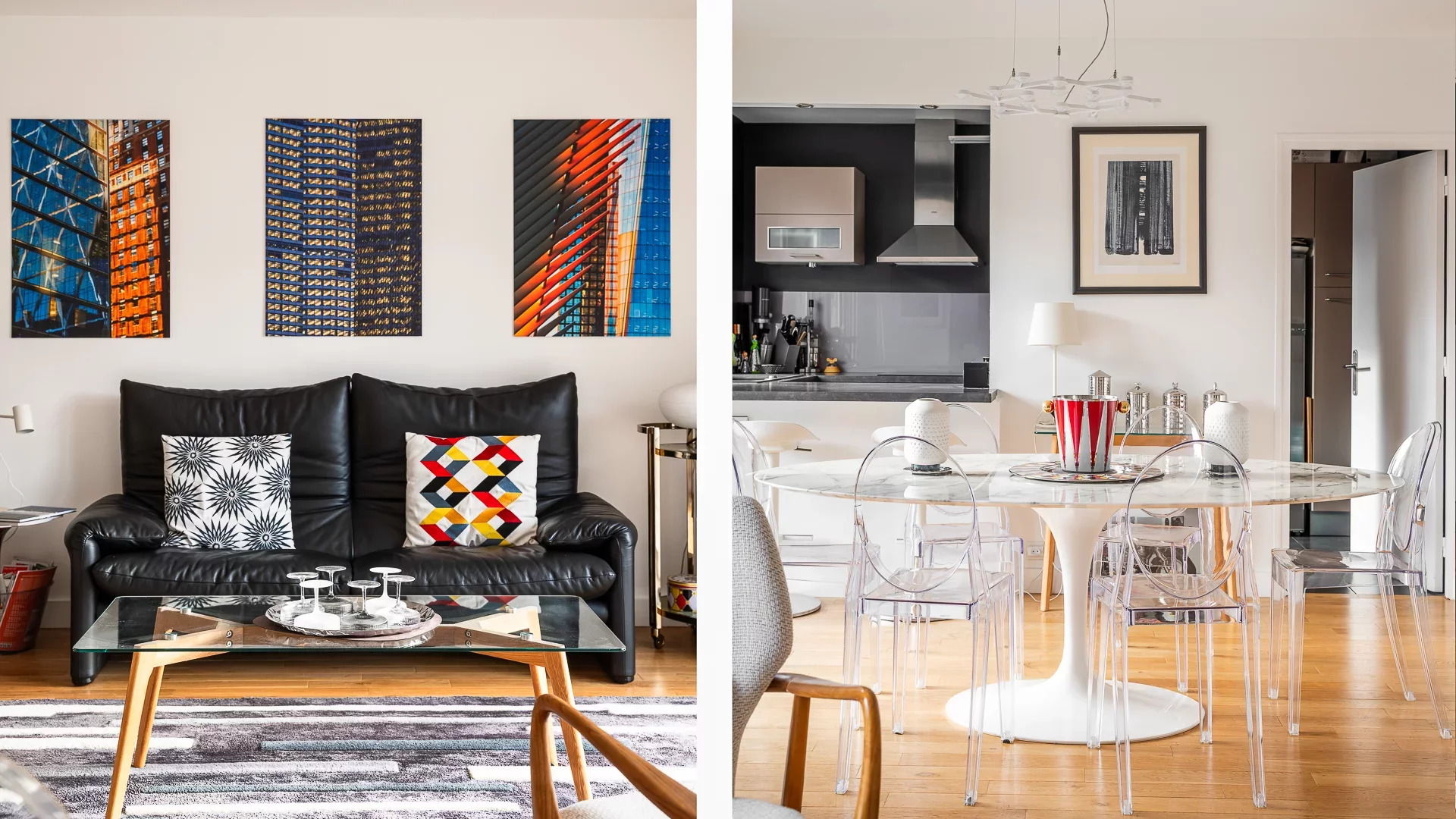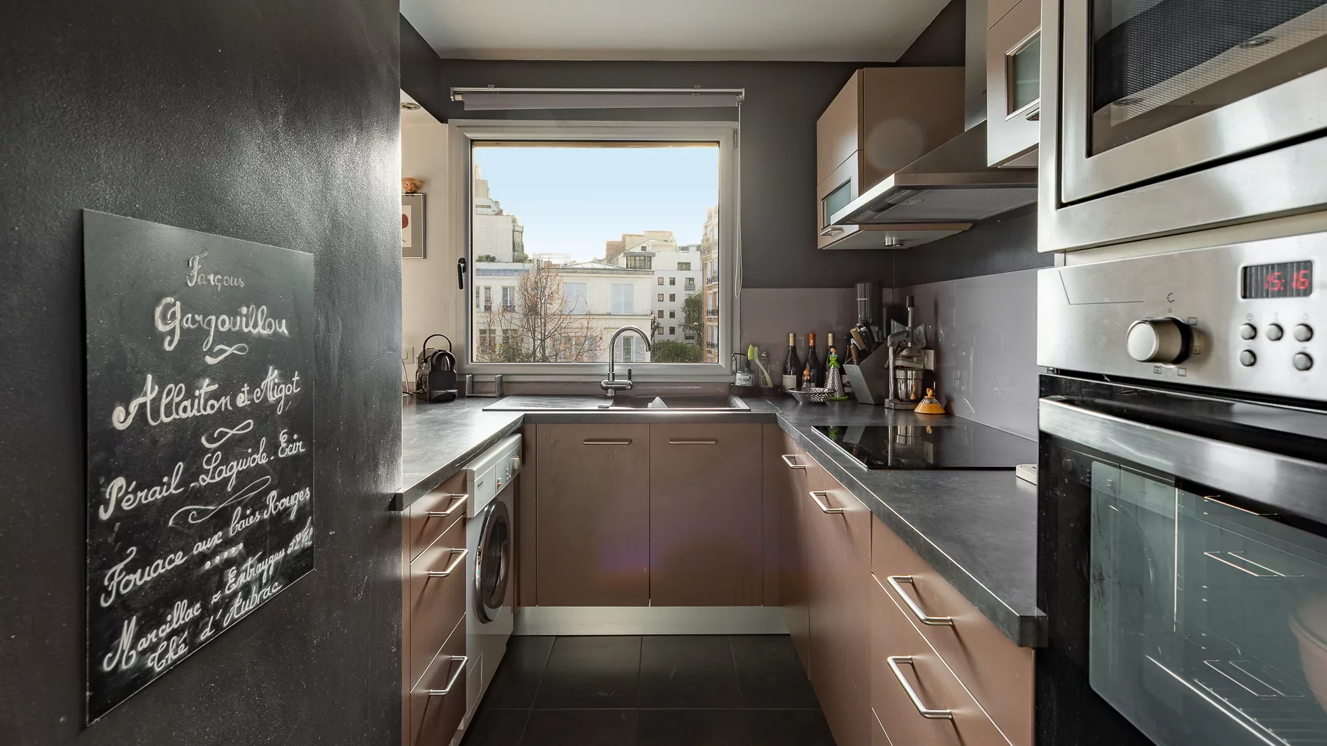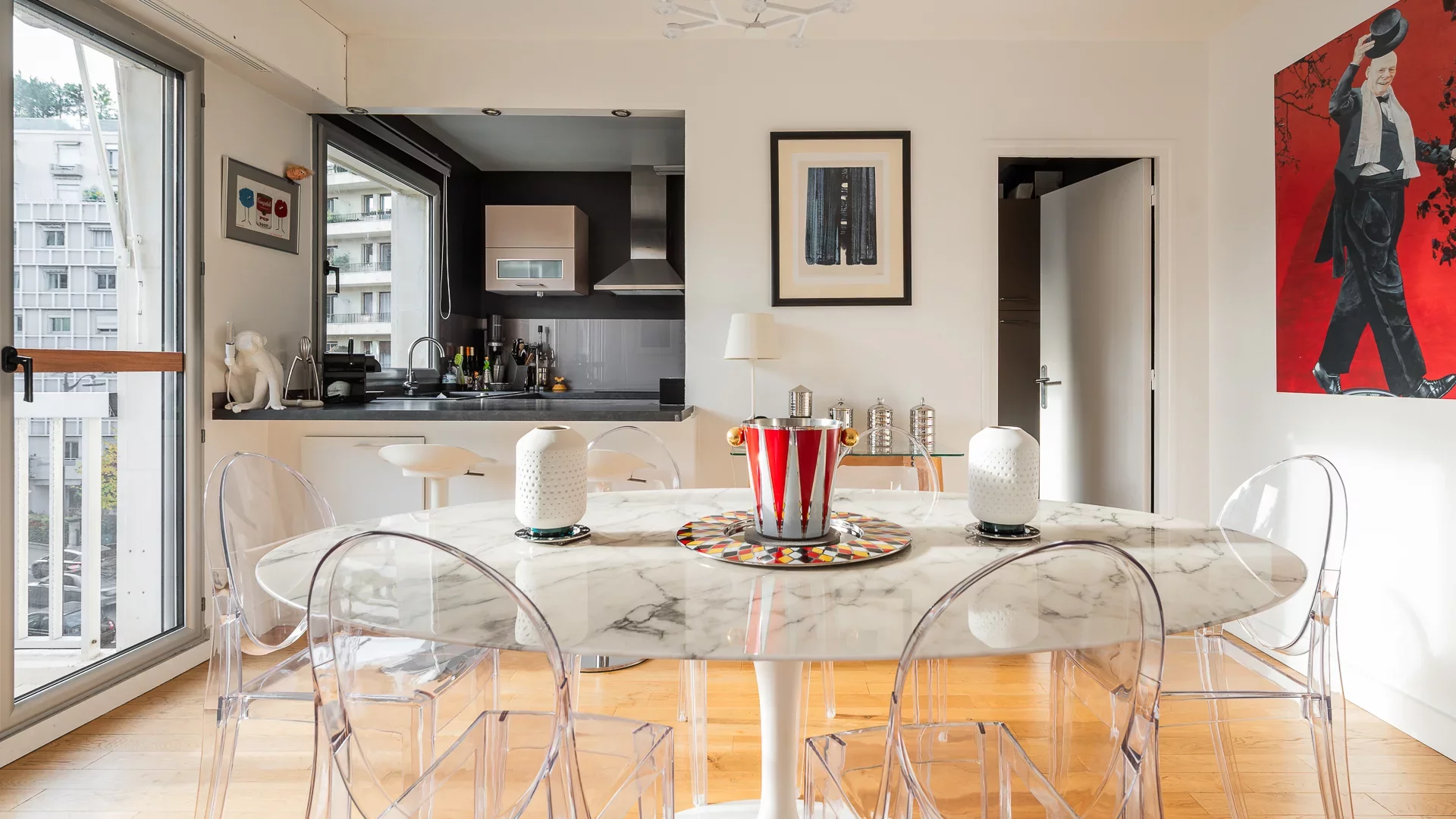 It comprises an entrance hall leading to a vast living room, a dining room and an open-plan kitchen, all opening onto a balcony.