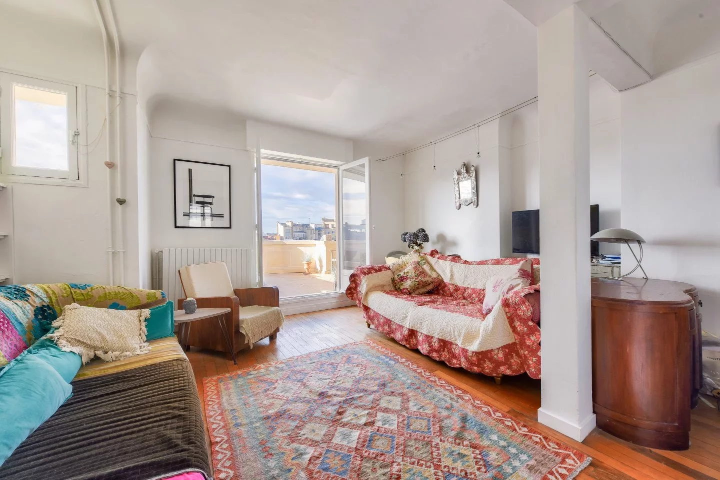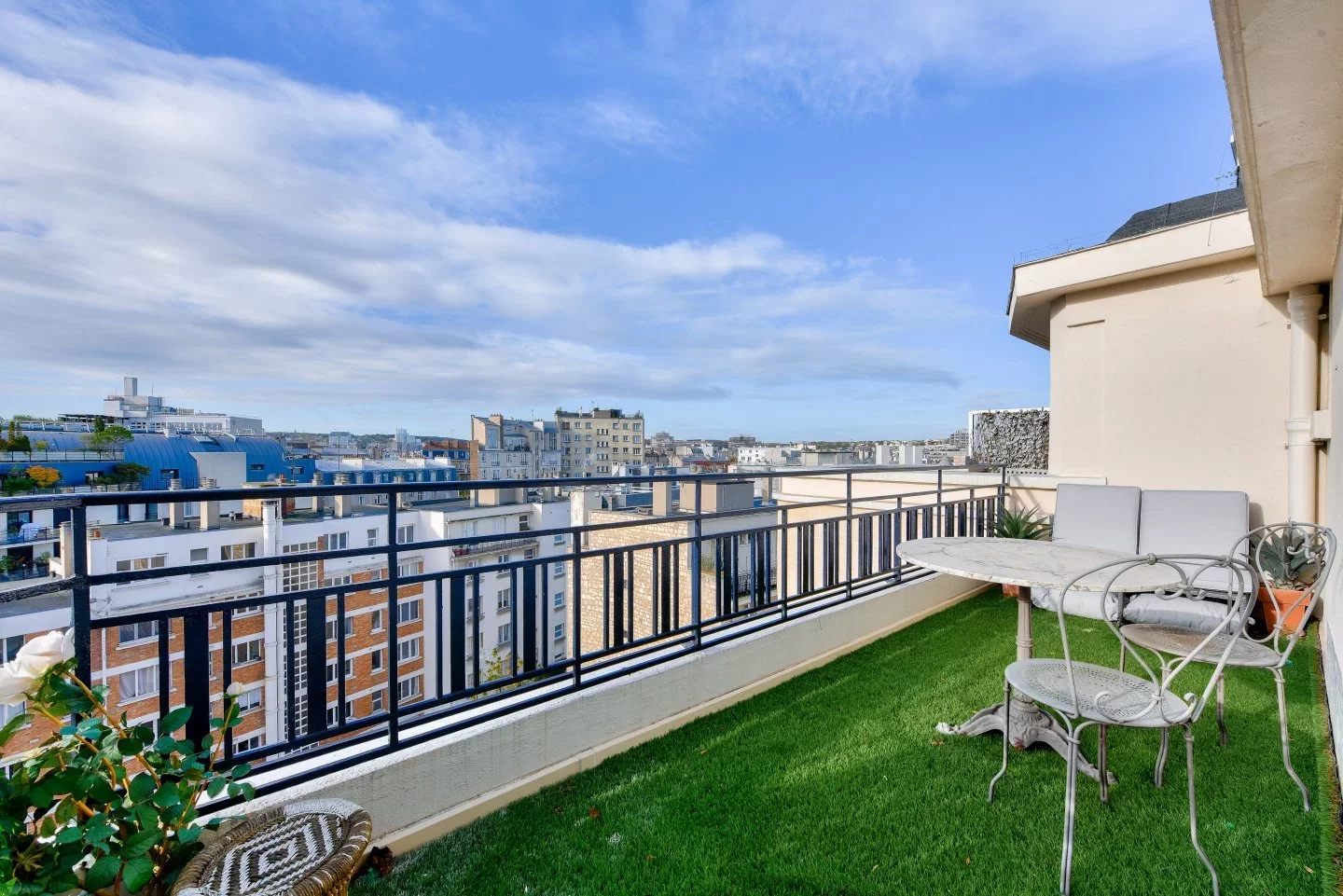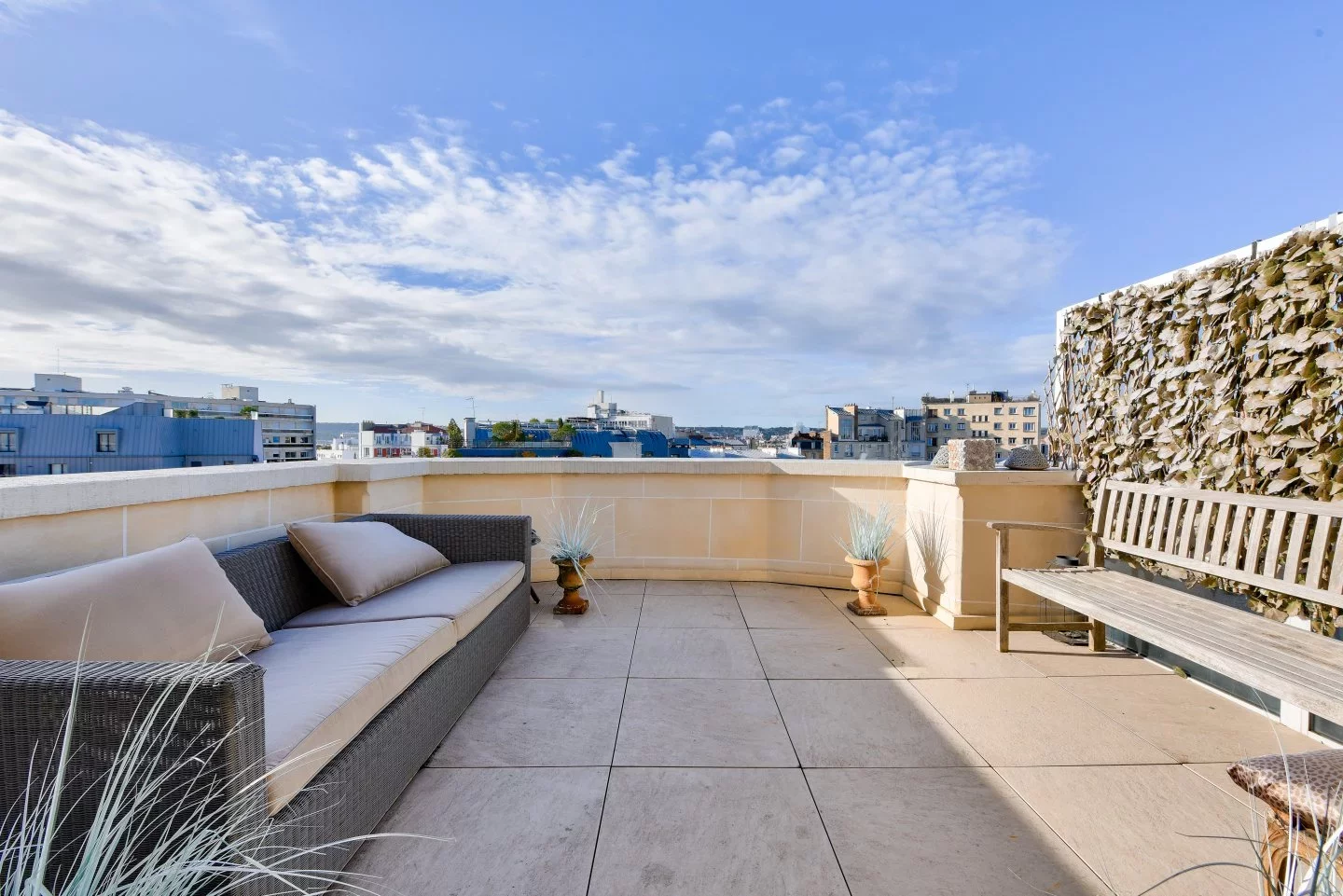 Baigné de lumière, il séduit par sa vue dégagée et ses deux superbes terrasses totalisant près de 23 m². Il se compose d’un séjour de 19,67 m² ouvrant sur une terrasse plein ciel de 12 m², de deux chambres dont l’une bénéficie de son extérieur privatif d’environ 11 m², d’une cuisine indépendante, d’une salle de bains et de toilettes séparées.