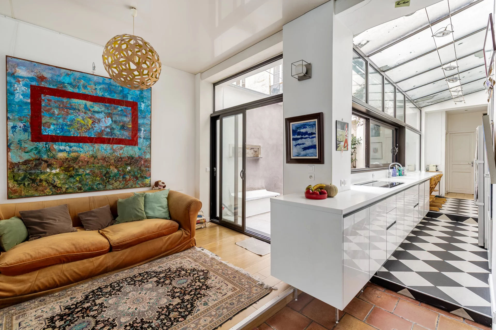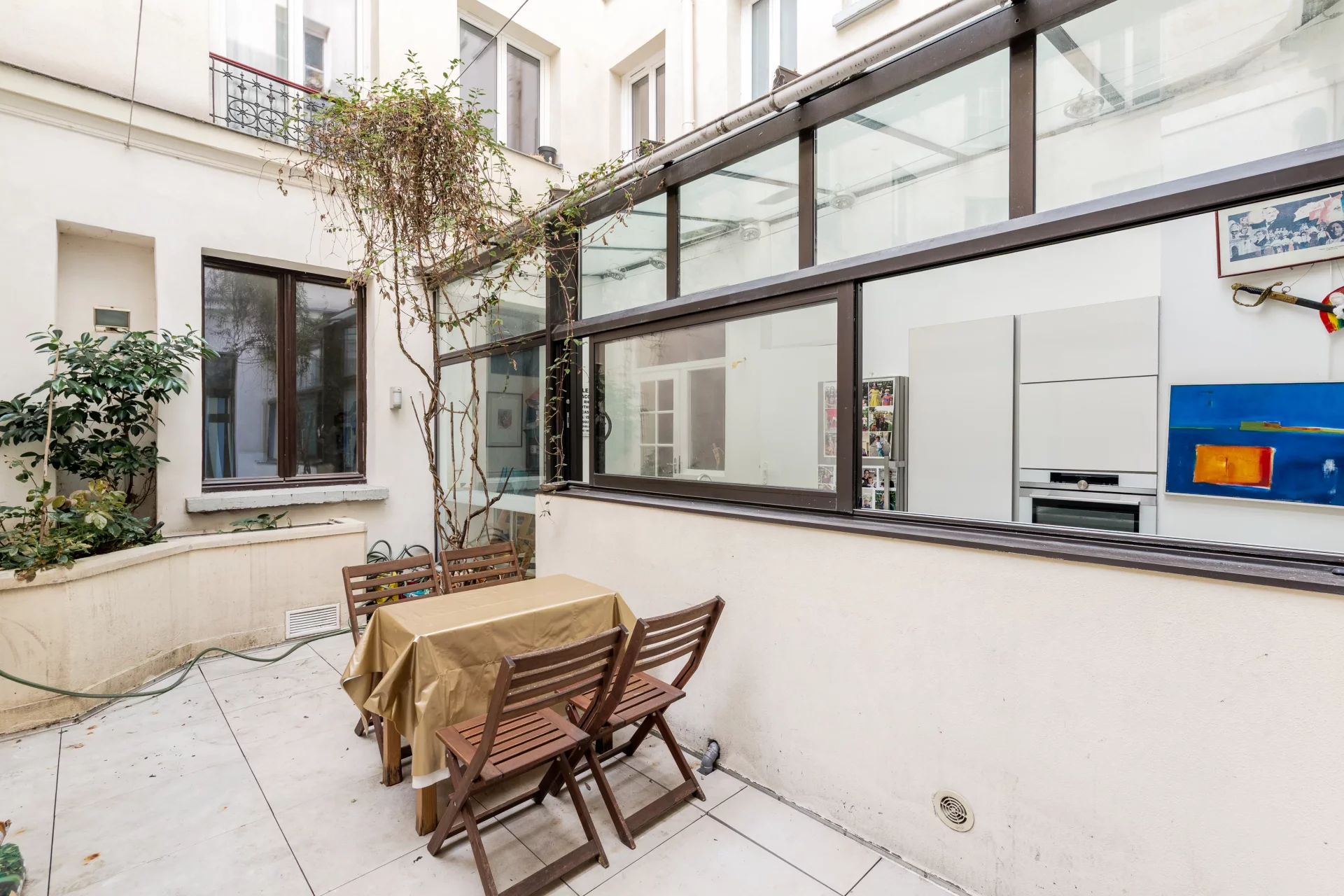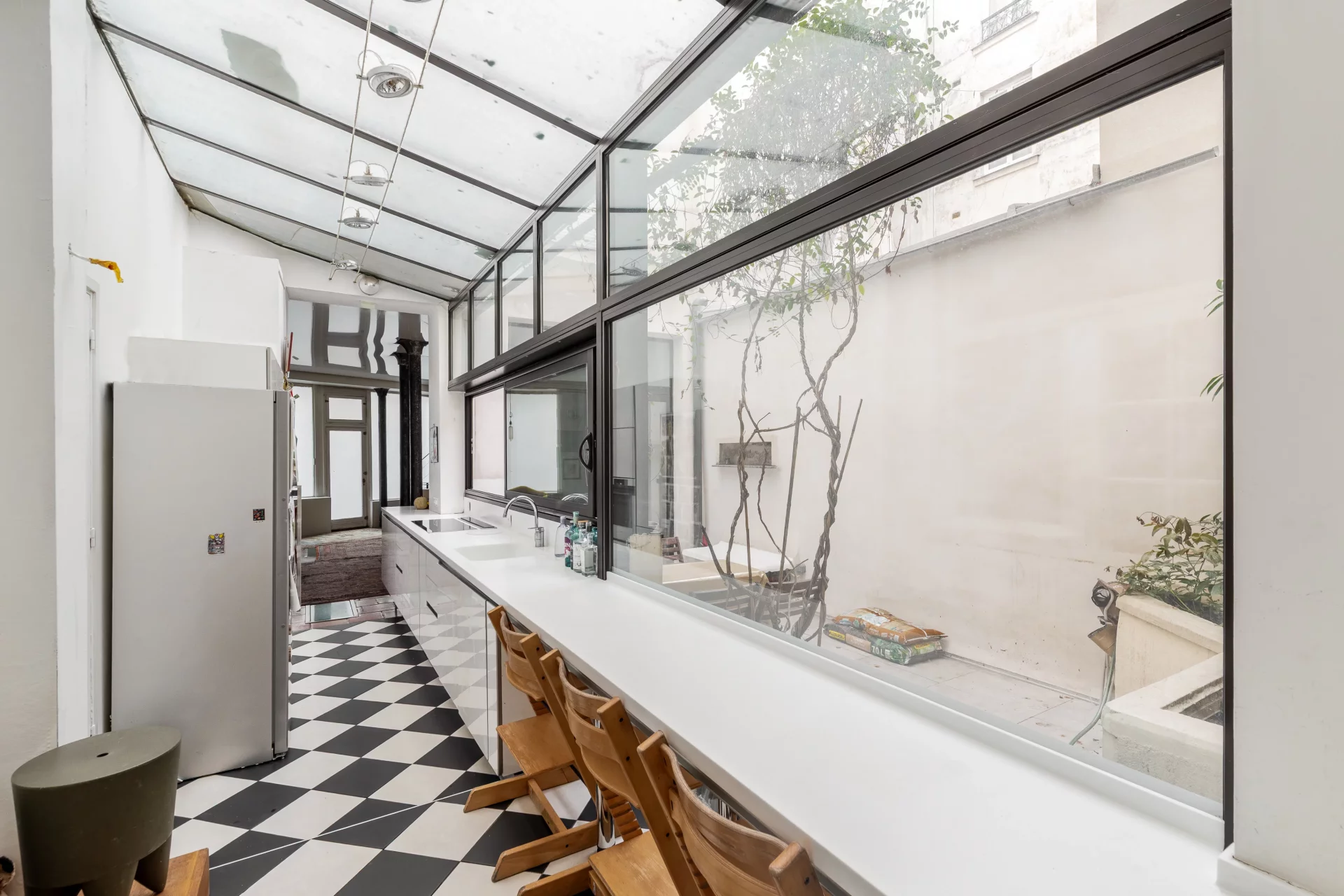 With a total floor area of 155sqm and a Carrez law area of 138.91sqm, it comprises a very large living room on the ground floor, offering generous volumes, a fully equipped kitchen, and a glass roof opening onto a beautiful 15.5sqm terrace. It also features two quiet bedrooms overlooking the courtyard, a bathroom, and a separate toilet.