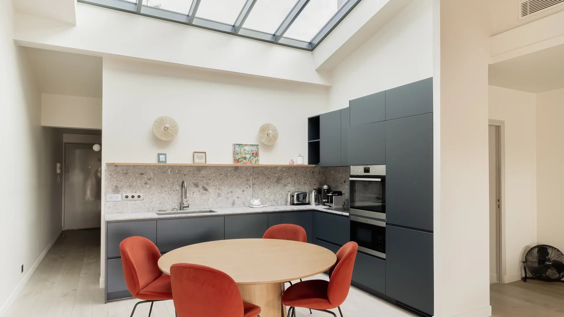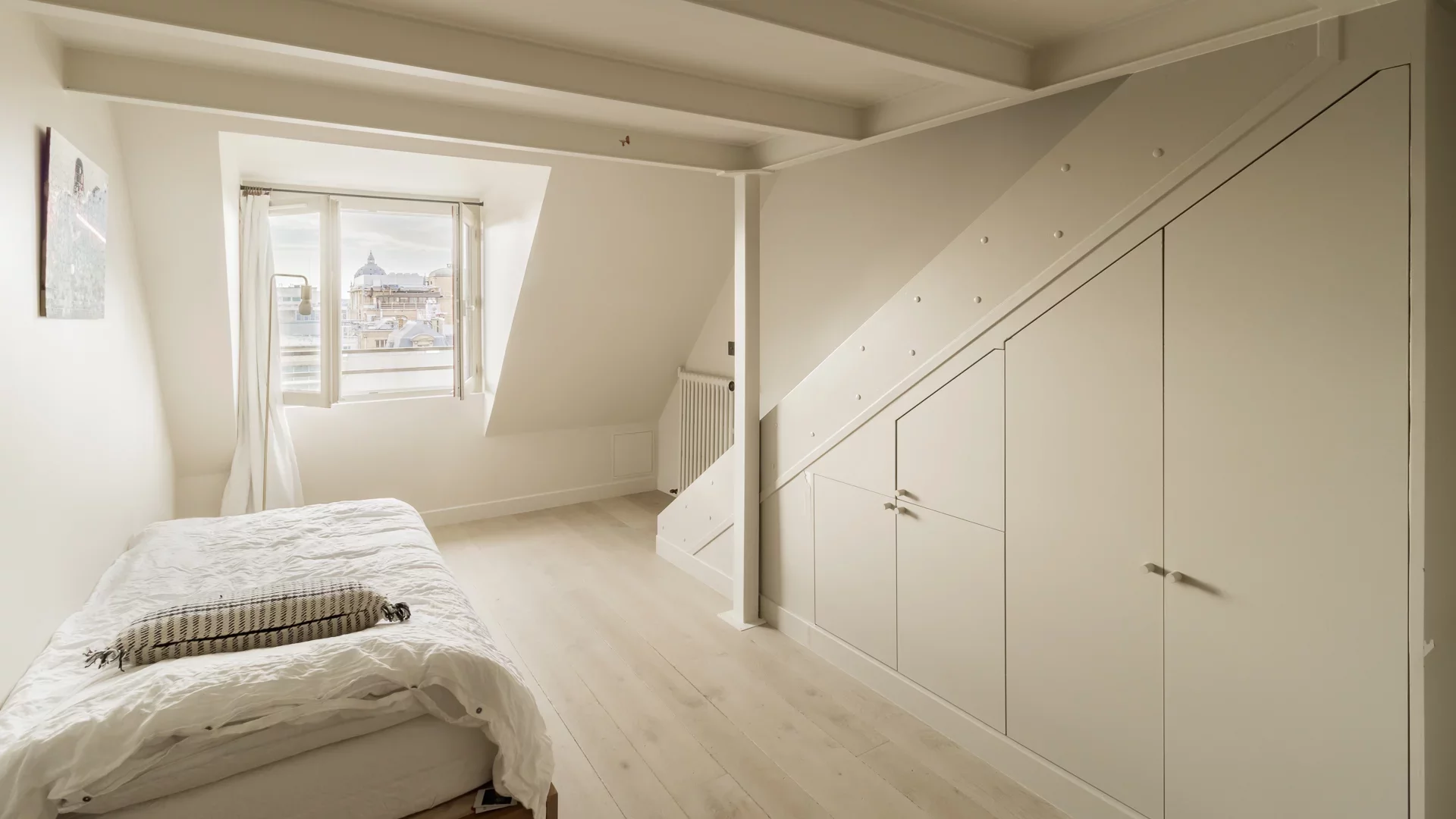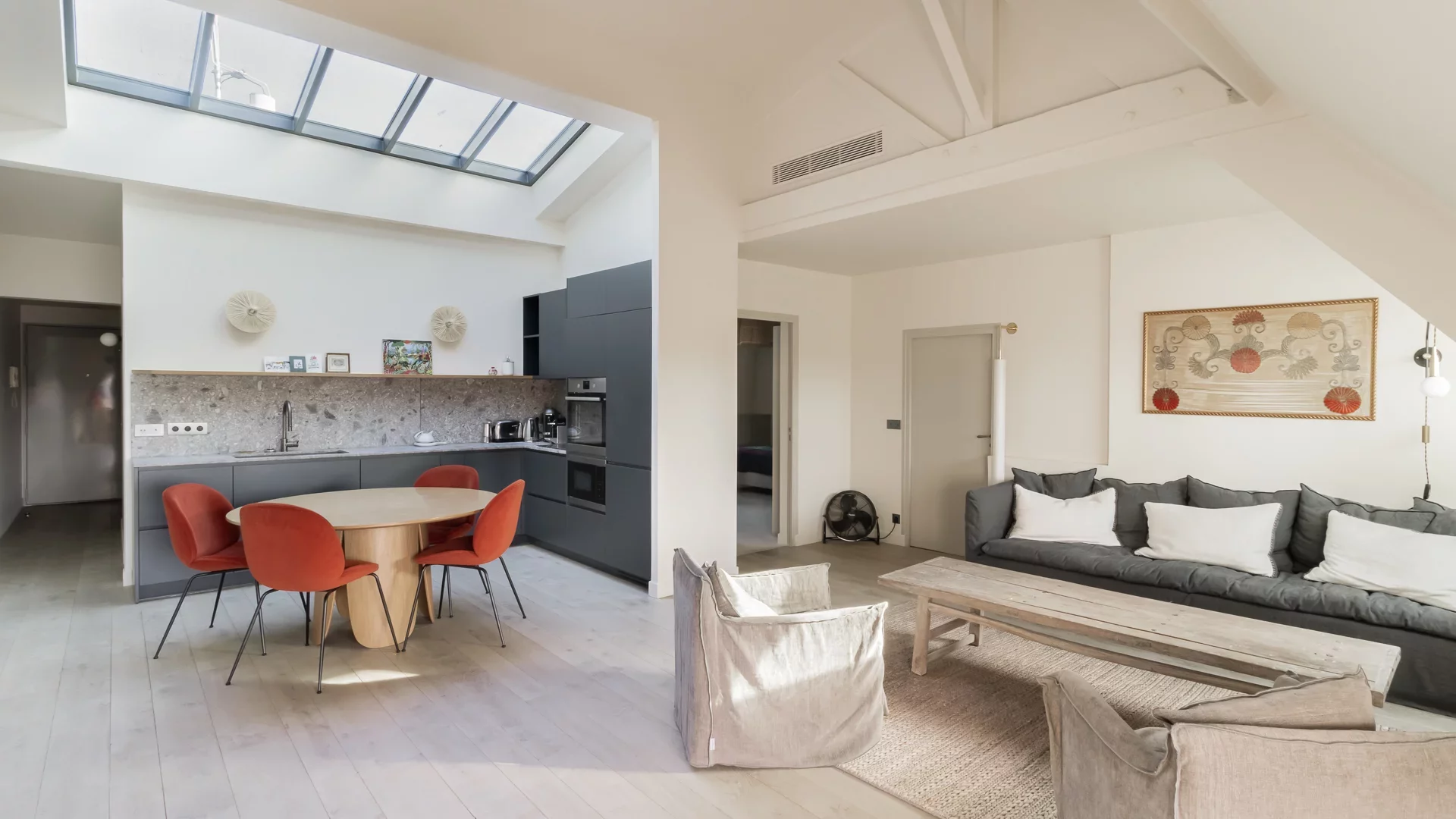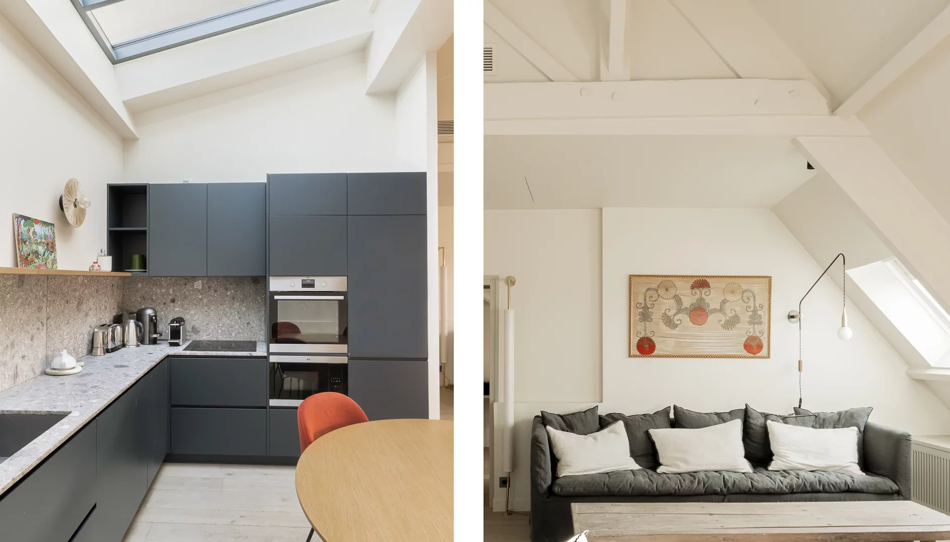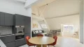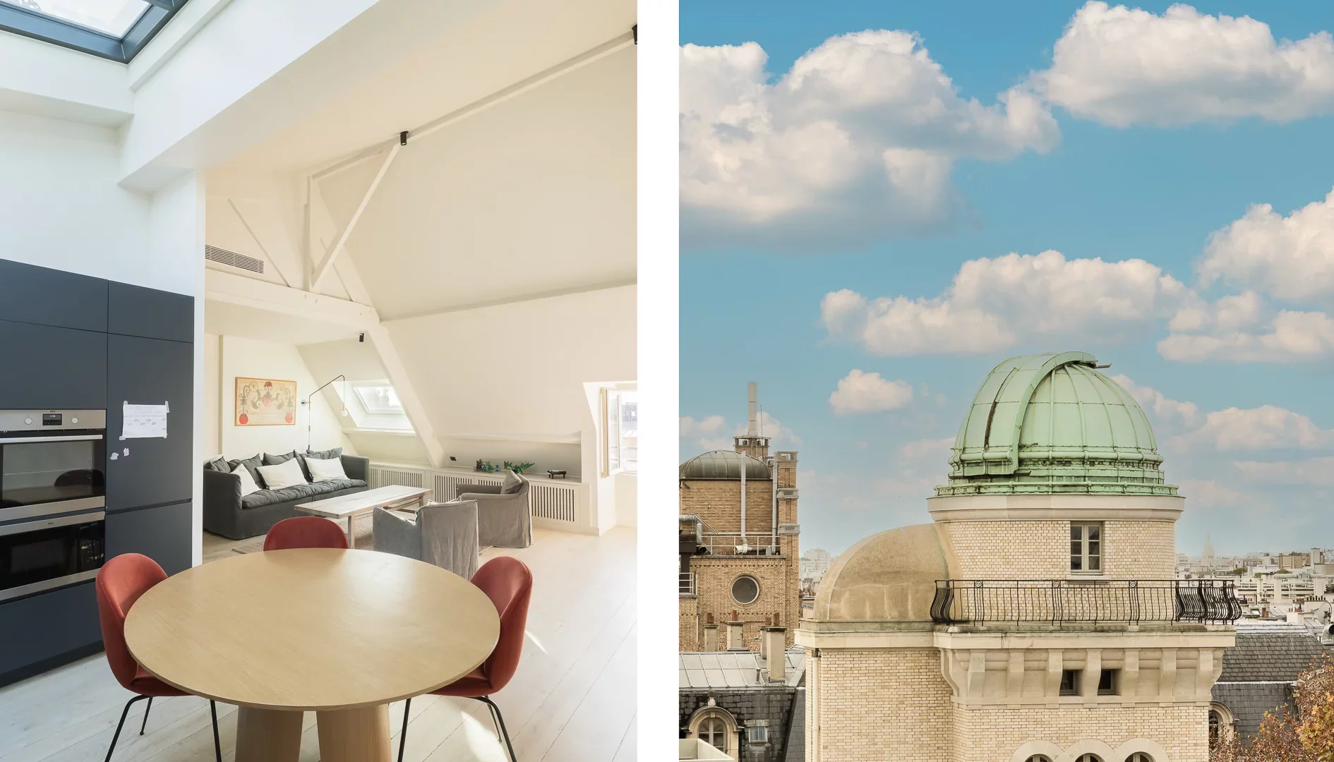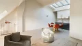 It comprises an entrance hall, laundry area and guest toilet, a splendid double living room with open, fully-equipped kitchen and unobstructed view of the sky, the rooftops of Paris and the Pantheon, a suite with bathroom featuring bath, shower and toilet, and a children's bedroom with mezzanine.