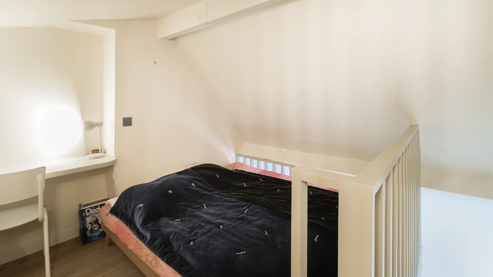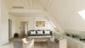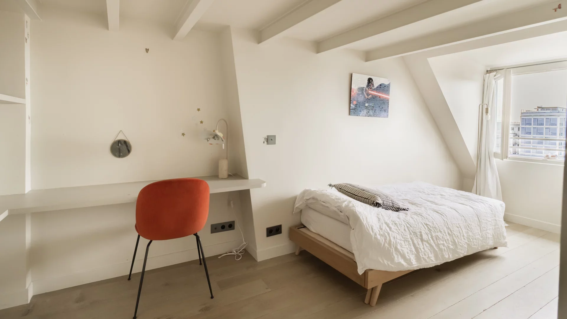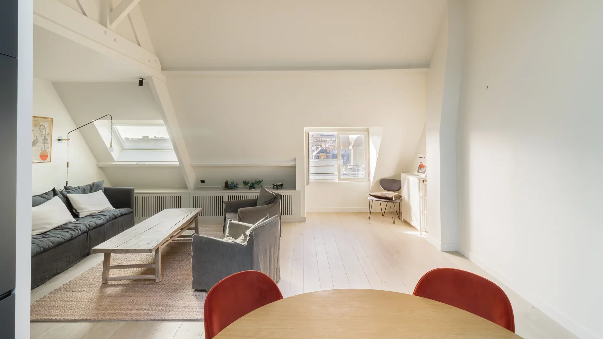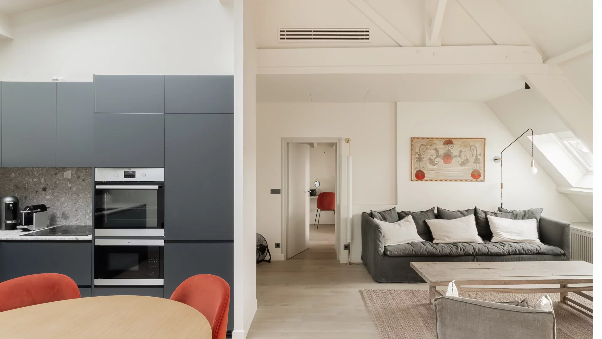It comprises an entrance hall, laundry area and guest toilet, a splendid double living room with open, fully-equipped kitchen and unobstructed view of the sky, the rooftops of Paris and the Pantheon, a suite with bathroom featuring bath, shower and toilet, and a children's bedroom with mezzanine.