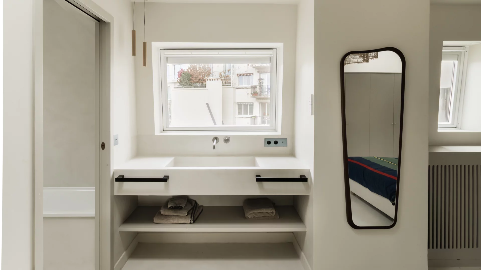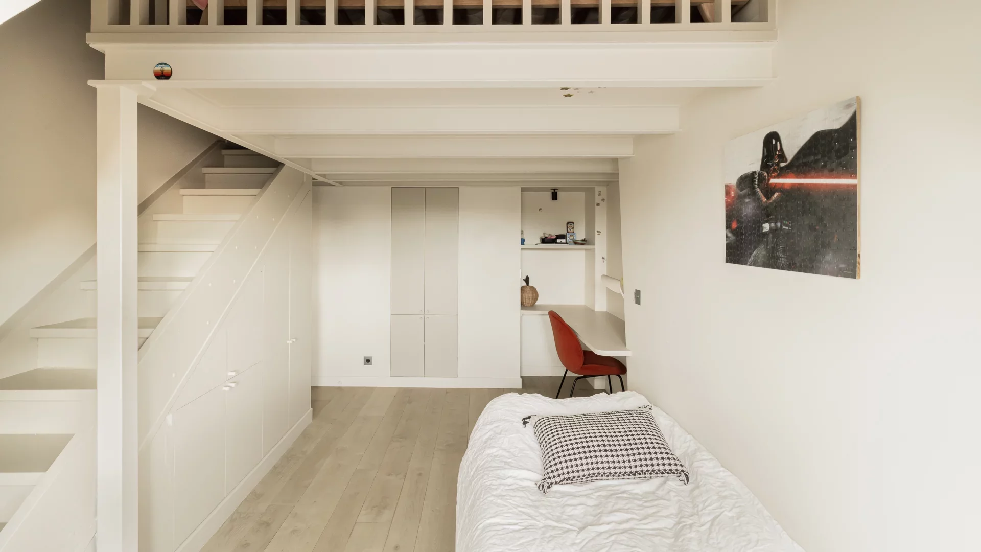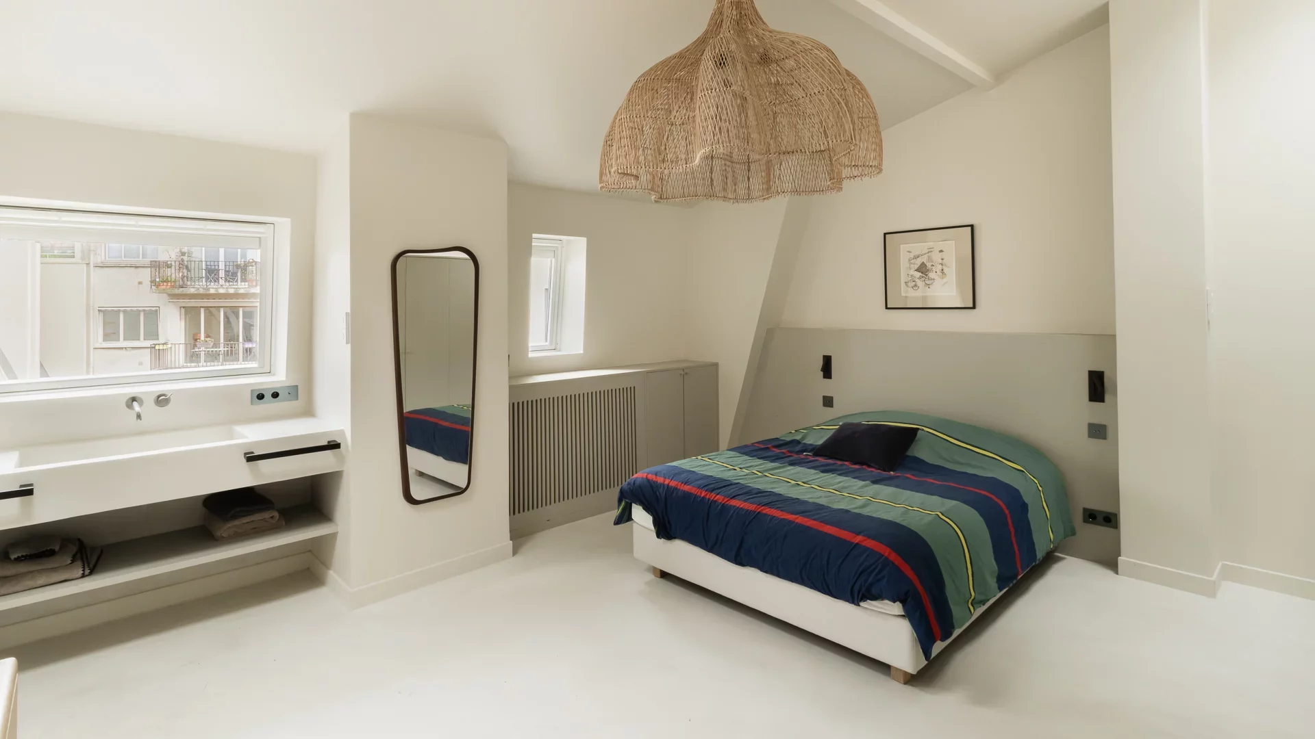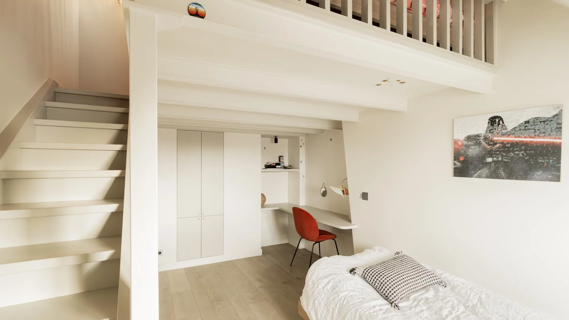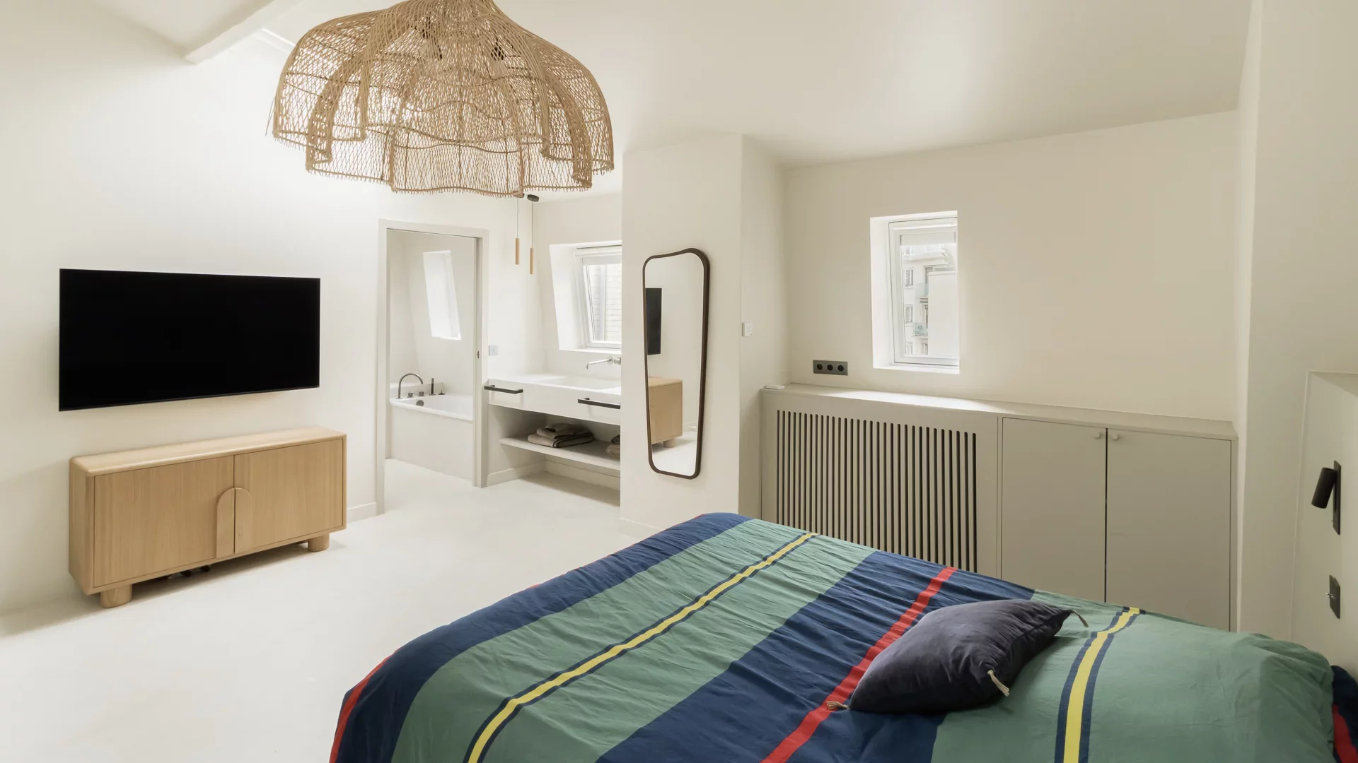 It comprises an entrance hall, laundry area and guest toilet, a splendid double living room with open, fully-equipped kitchen and unobstructed view of the sky, the rooftops of Paris and the Pantheon, a suite with bathroom featuring bath, shower and toilet, and a children's bedroom with mezzanine.