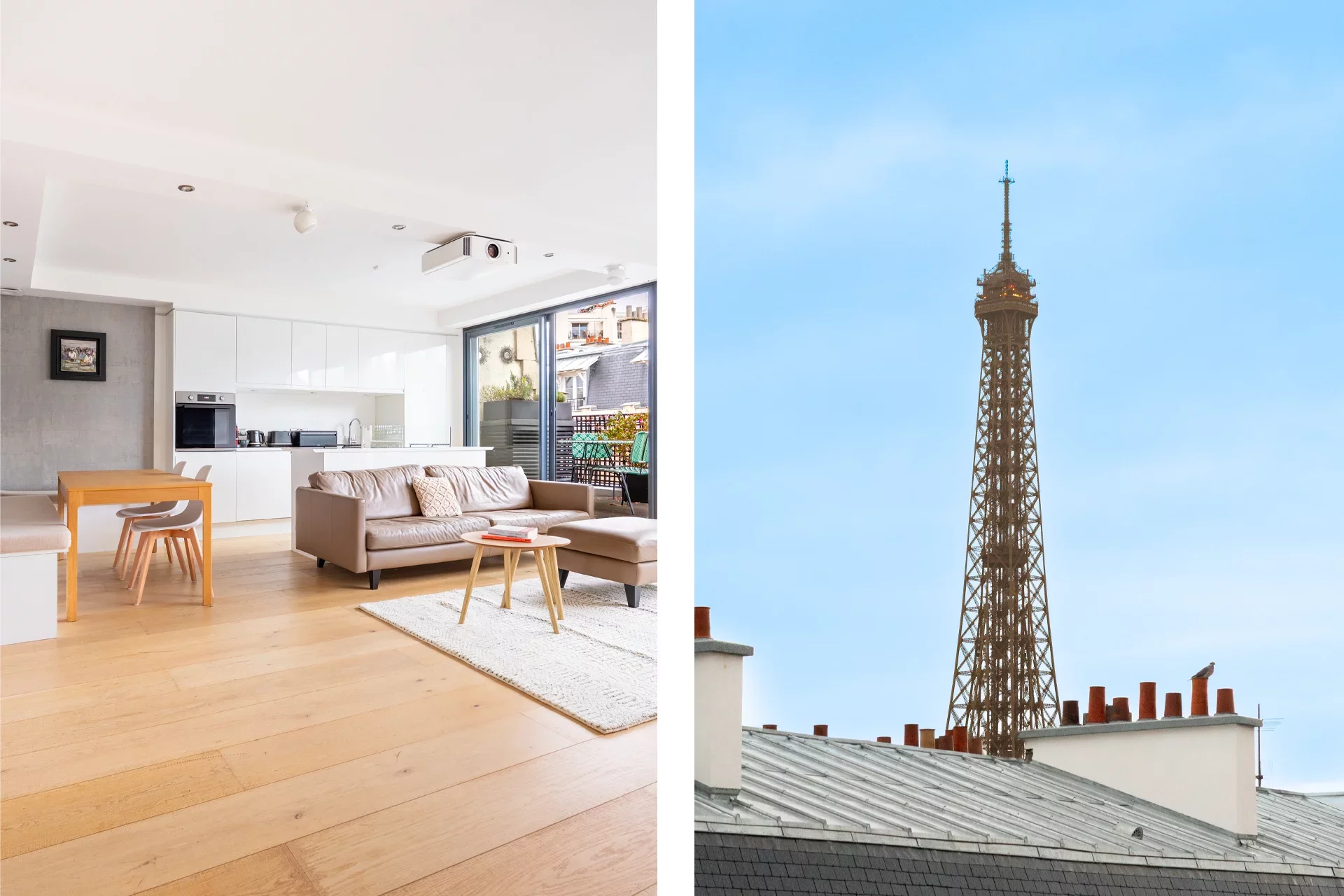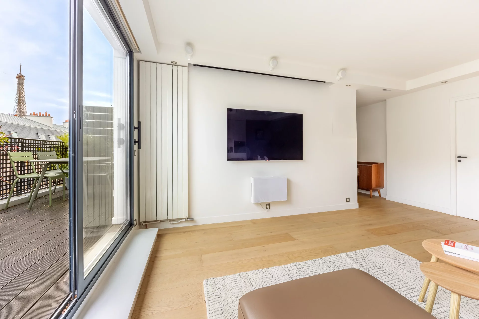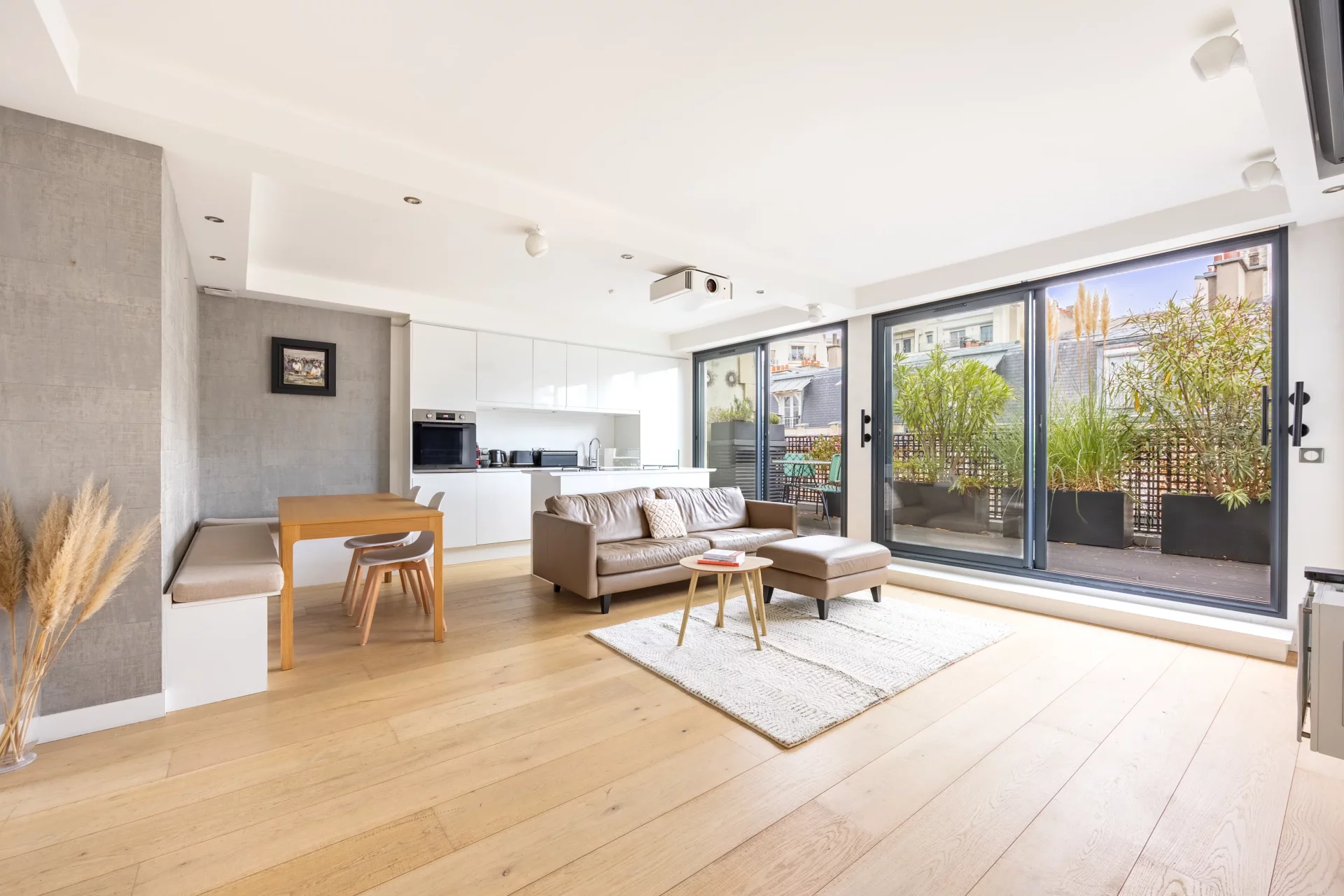 It comprises an entrance hall, a light-filled living room opening onto a 20m² private ground-level terrace with Eiffel Tower views, a fitted and equipped open-plan kitchen, a bespoke dining room and a lounge with integrated overhead projector.