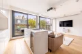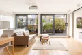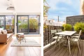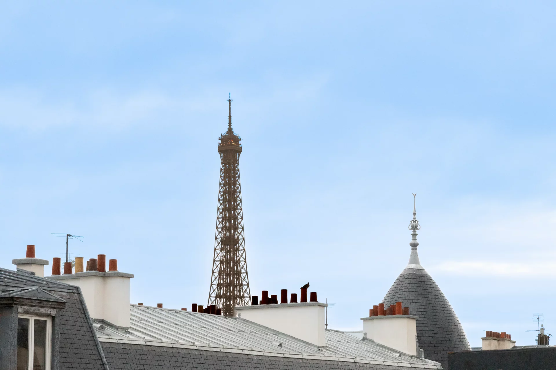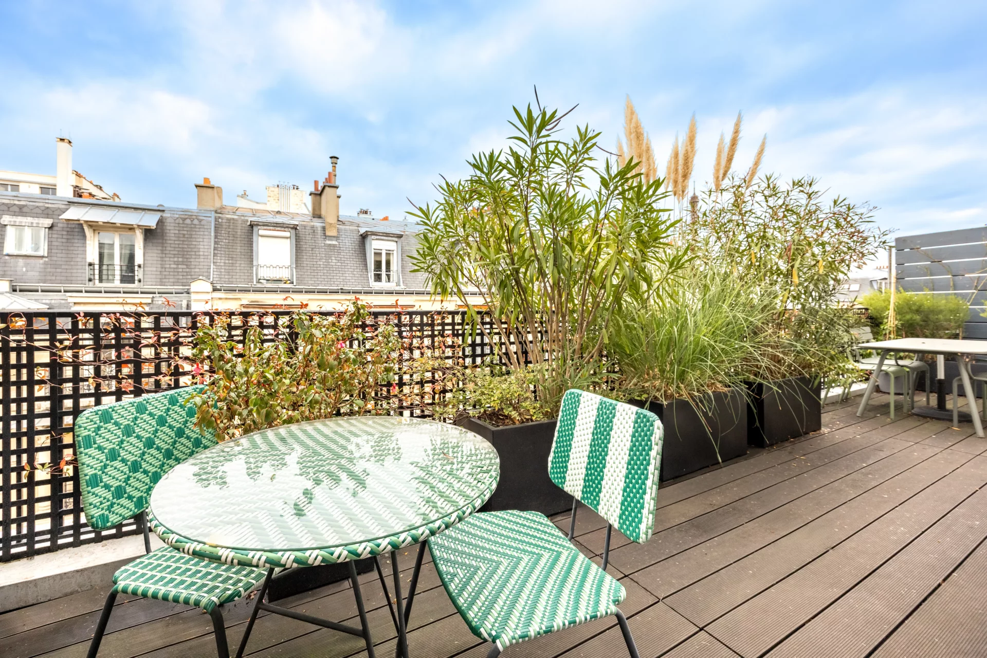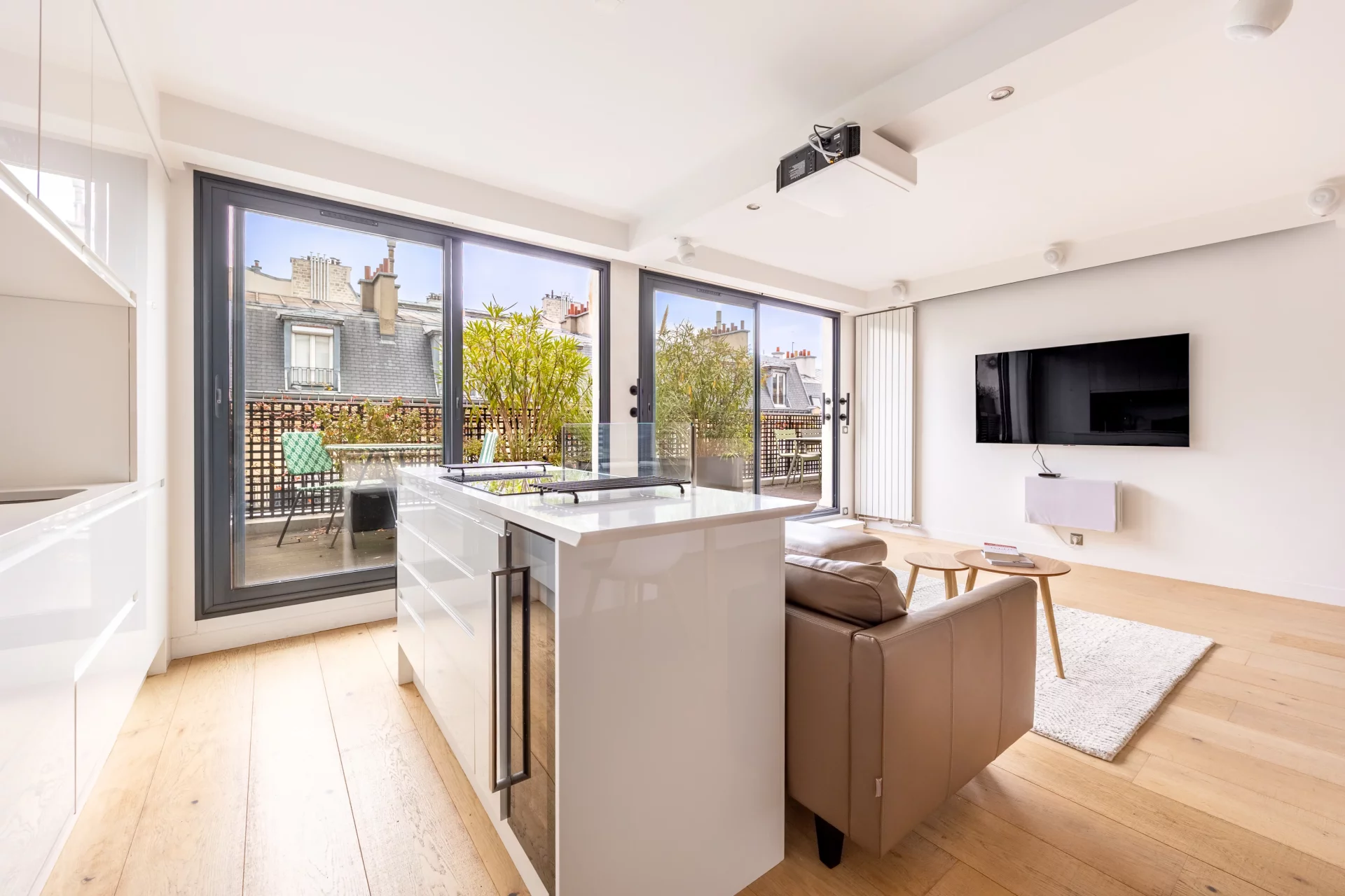 It comprises an entrance hall, a light-filled living room opening onto a 20m² private ground-level terrace with Eiffel Tower views, a fitted and equipped open-plan kitchen, a bespoke dining room and a lounge with integrated overhead projector.