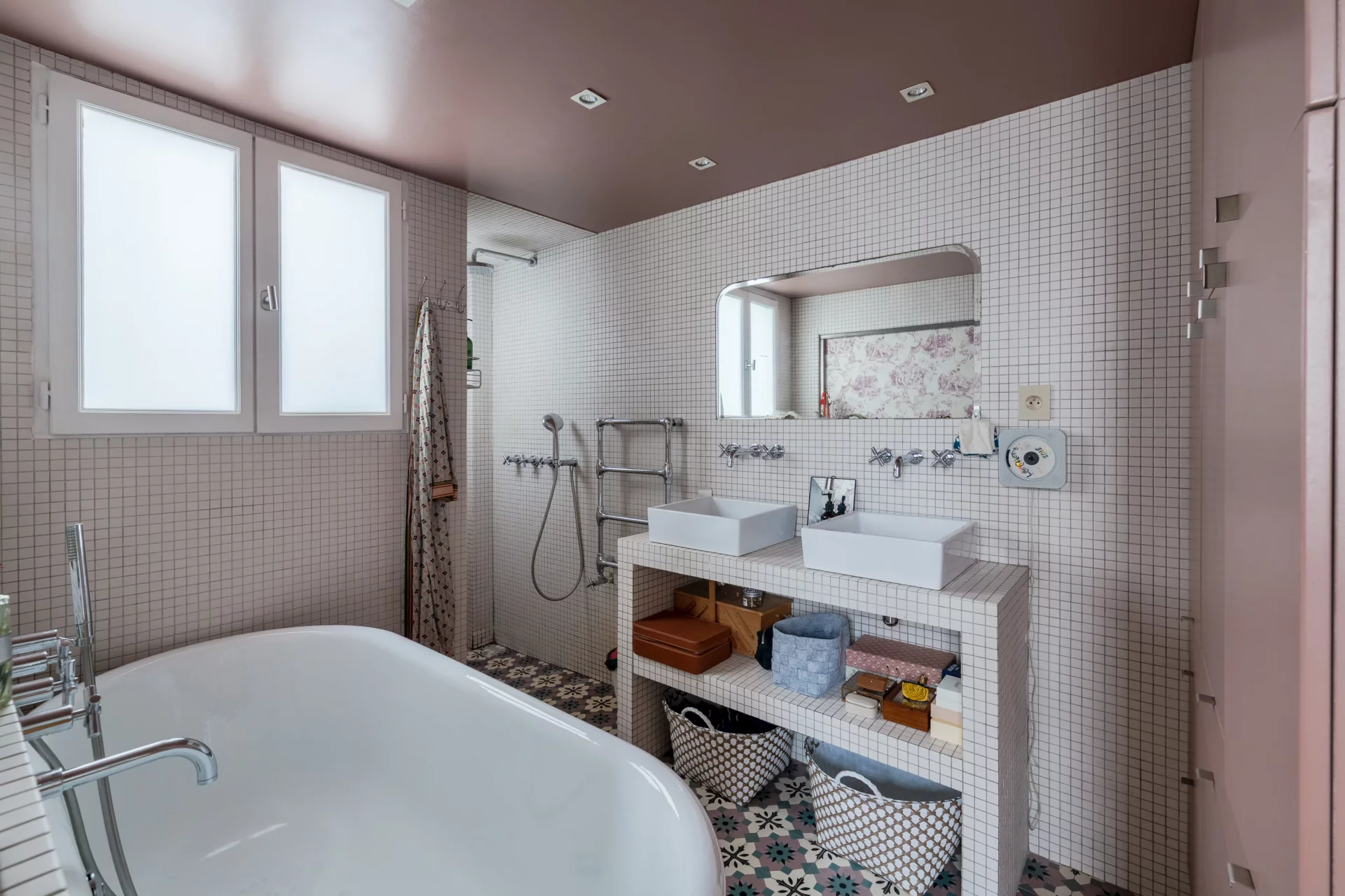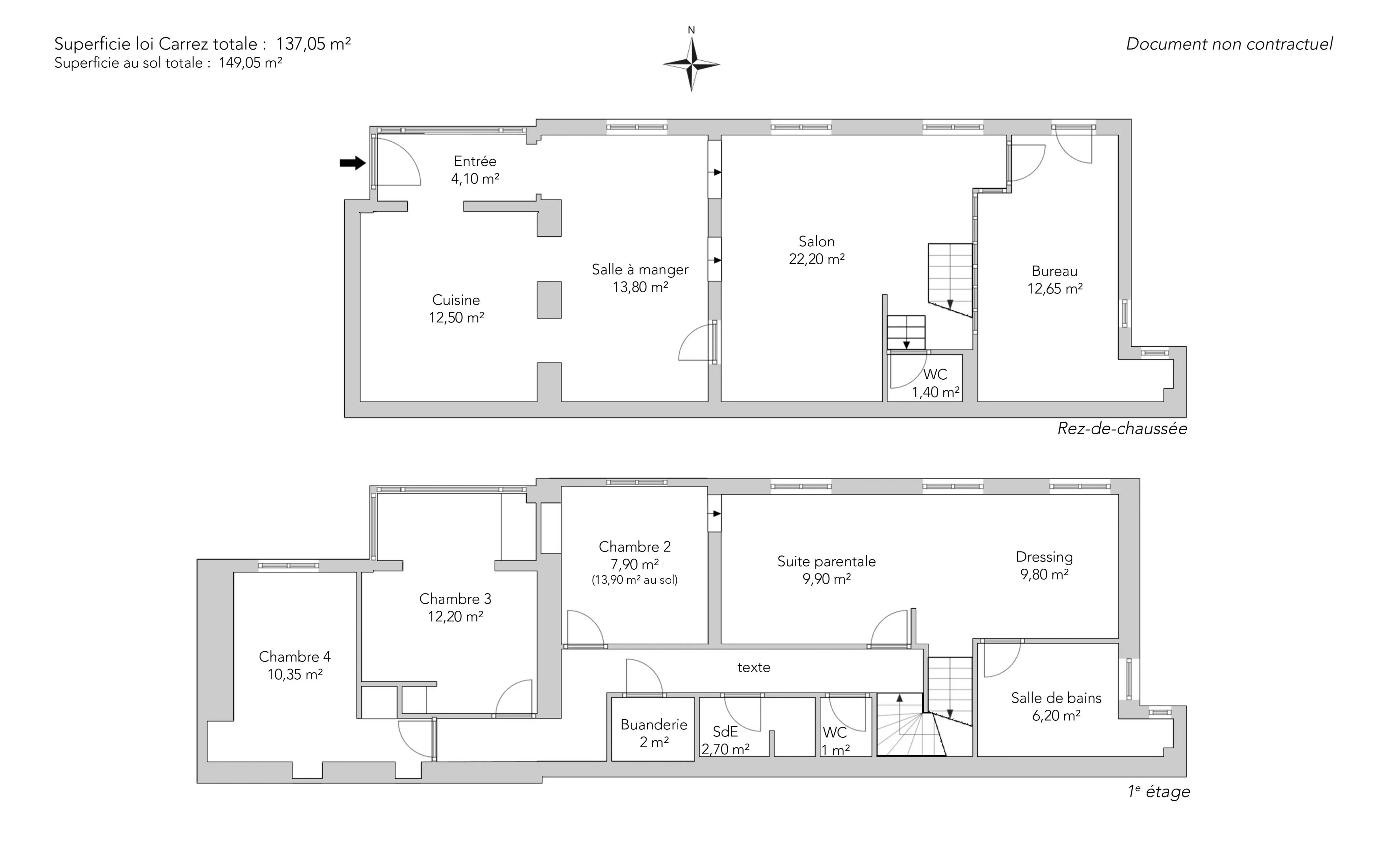 The first level (65sqm) includes a comfortable eat-in kitchen, a dining room/library with a functional ceramic stove, and a lovely living room extended by the study. This office is also accessible from a second entrance (ideal for a liberal profession). Separate toilet.
