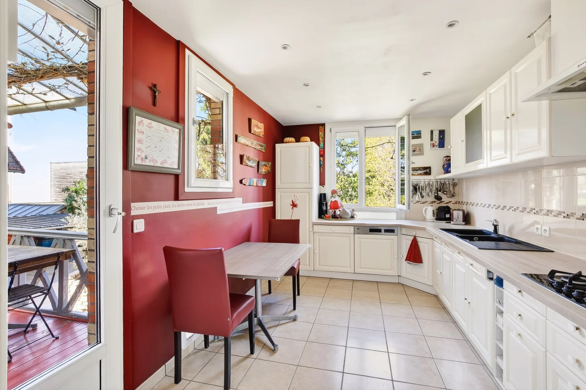 The ground floor includes a spacious living room and a bright dining room, a fully equipped independent eat-in kitchen, and direct access to a terrace extended by the garden.