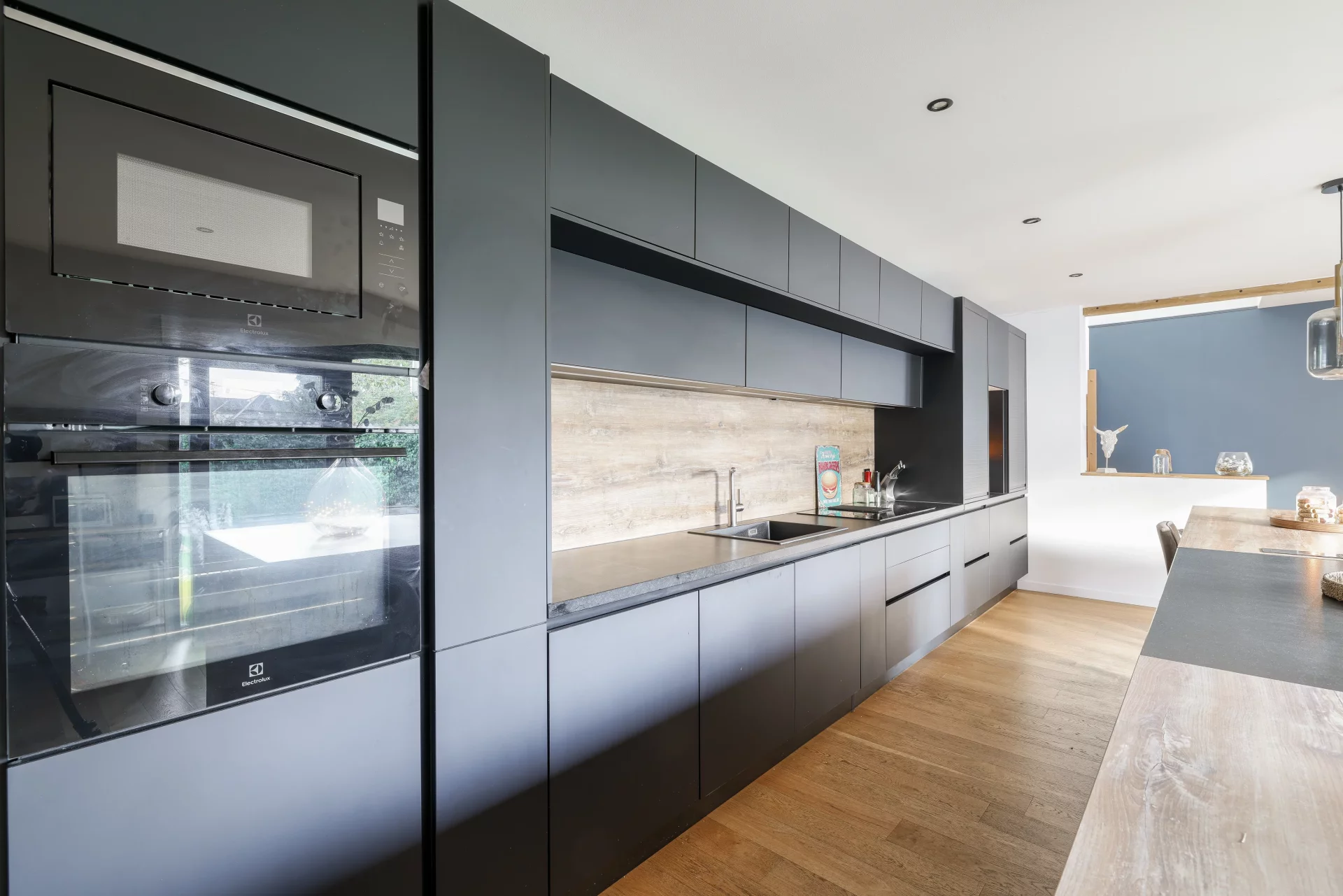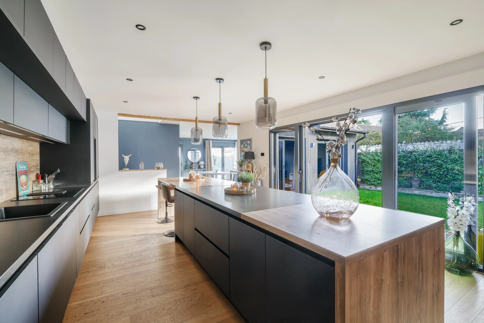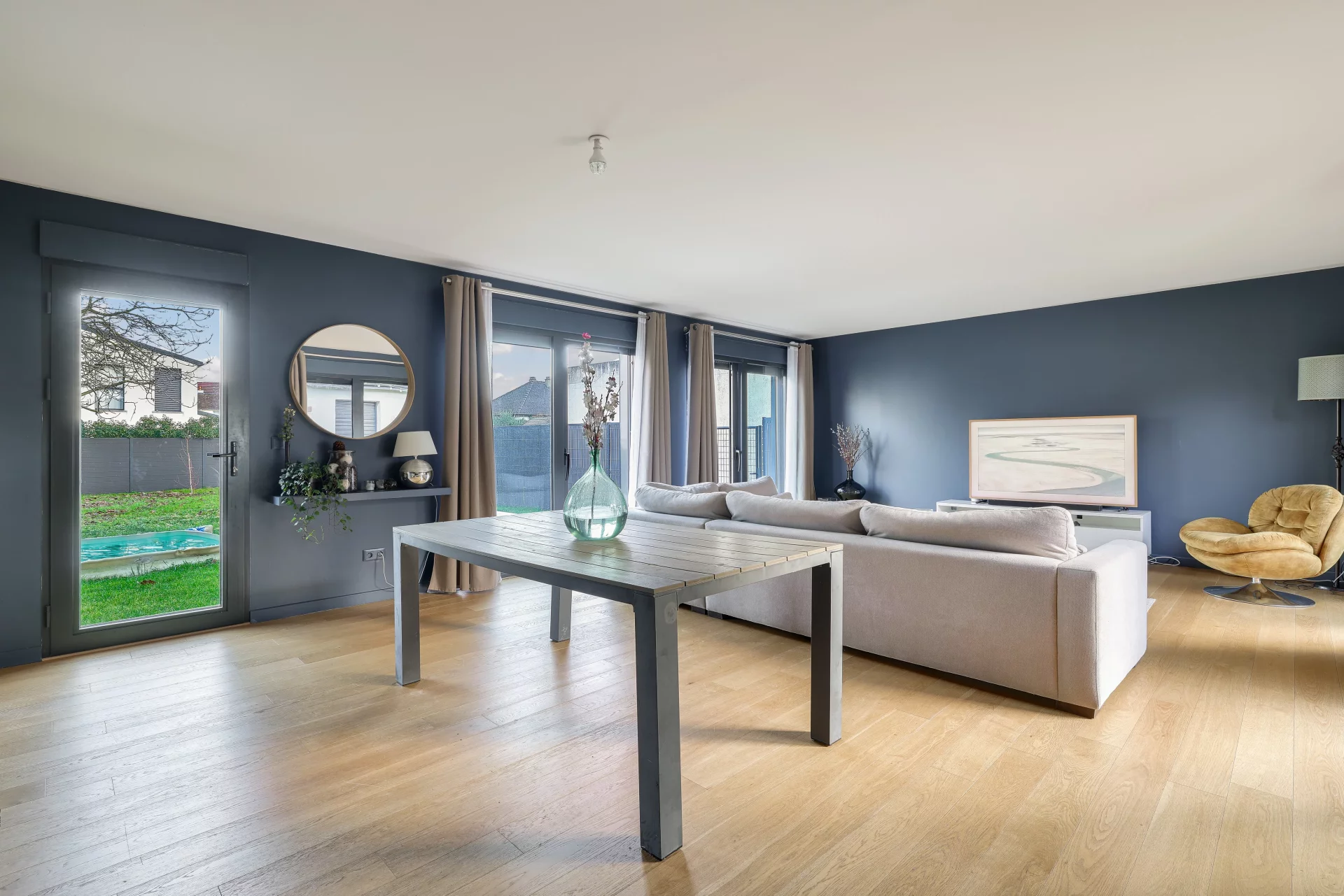 The contemporary section is the heart of the home, providing a natural transition between the different spaces. It houses a convivial kitchen extended by a scullery with laundry facilities, creating a fluid junction between the children's area and the reception rooms. The generous living room, bathed in light thanks to its ideal exposure, opens onto the garden and swimming pool.