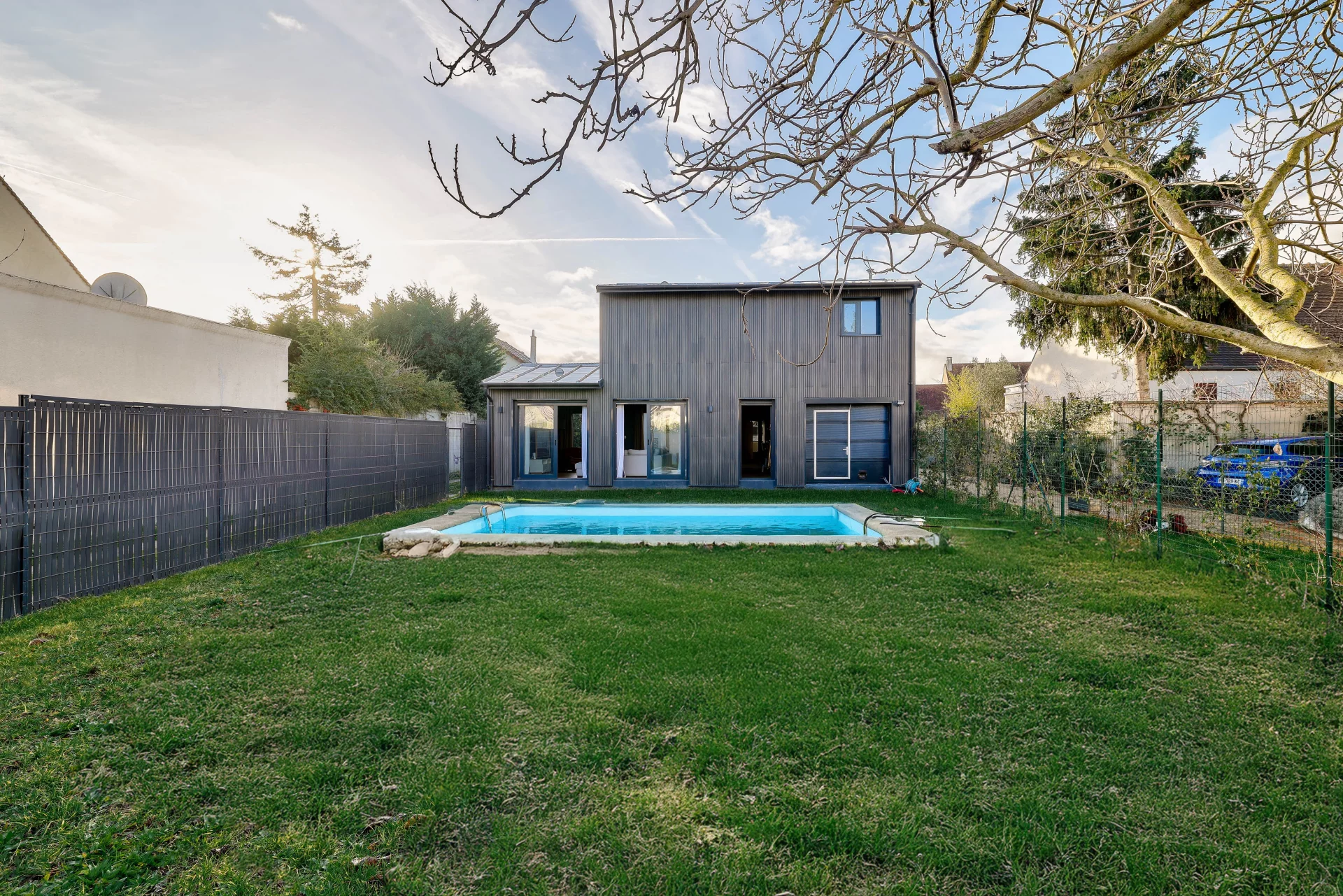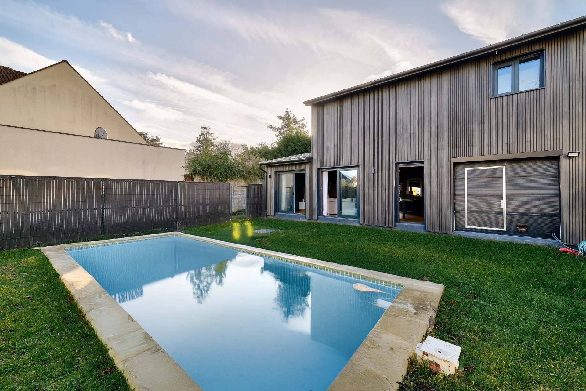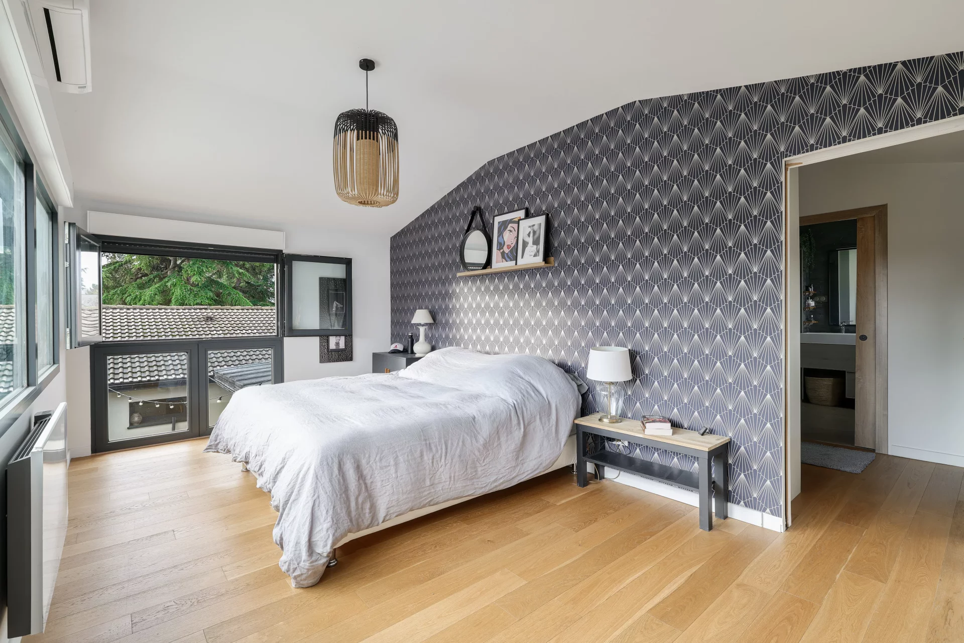 Set on an 874sqm wooded plot, it offers generous, perfectly organized outdoor spaces, including parking at the entrance, a garden for children, a patio-style lawn and a vast garden directly adjoining the living room.