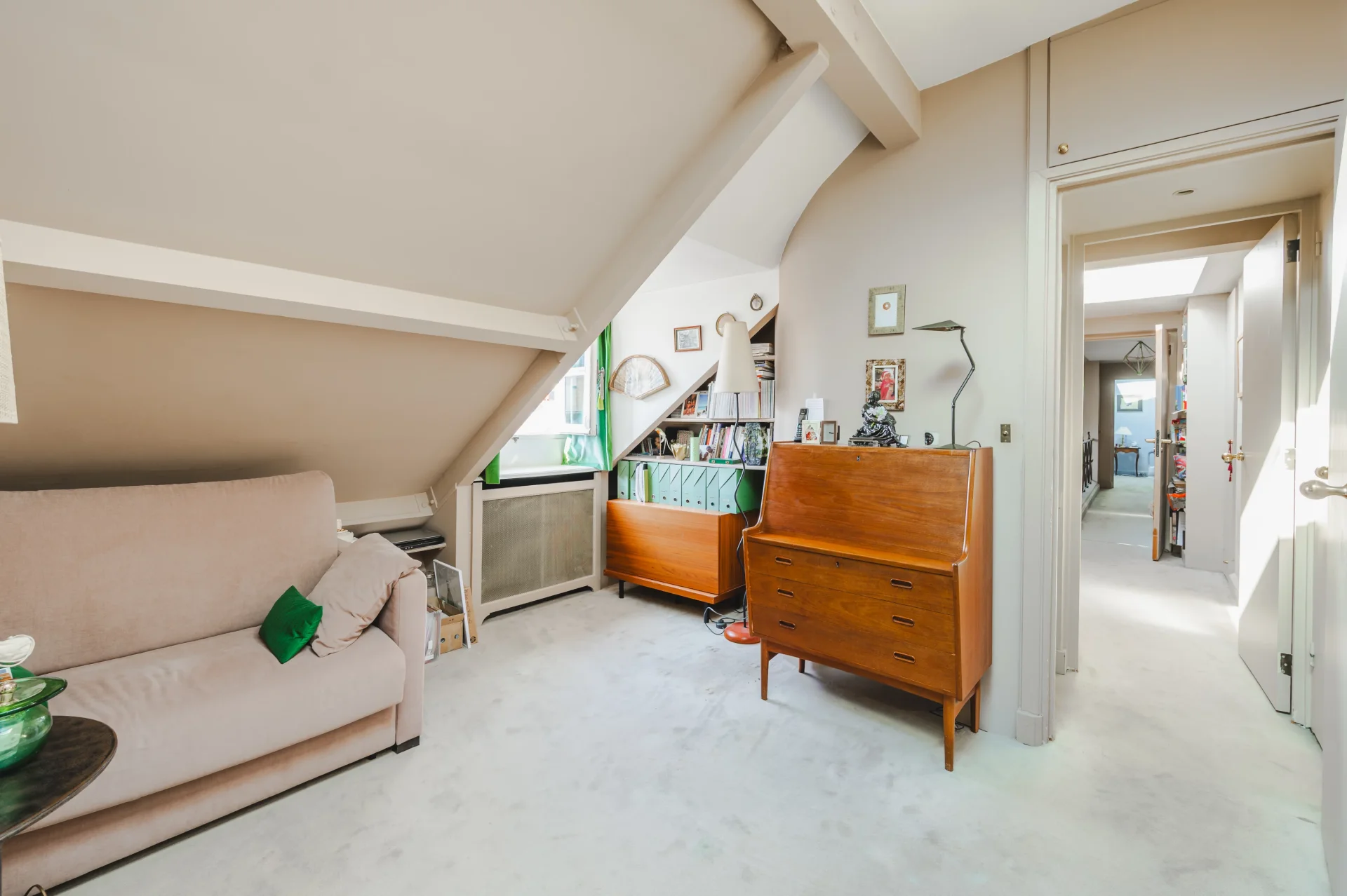 On the first level, the entrance opens onto a vast living room featuring a functional fireplace and a remarkable ceiling height of 4.65m to the ridge. A separate kitchen completes the space, as does a first bedroom with its own bathroom and separate toilet.