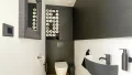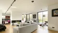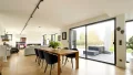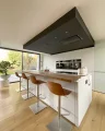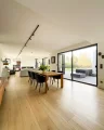 The first floor features a vast living space of around 100m², with clean lines and meticulous finishes, enhanced by solid oak parquet flooring. The living room, dining room and kitchen benefit from large, full-height SP10 windows, offering exceptional luminosity and perfect continuity between inside and outside. The ensemble comprises an elegant living room with panoramic fireplace, a cinema area, a convivial dining room and a fully-equipped custom LEICHT kitchen, featuring a natural stone central island and a dining area designed for moments of sharing.