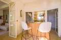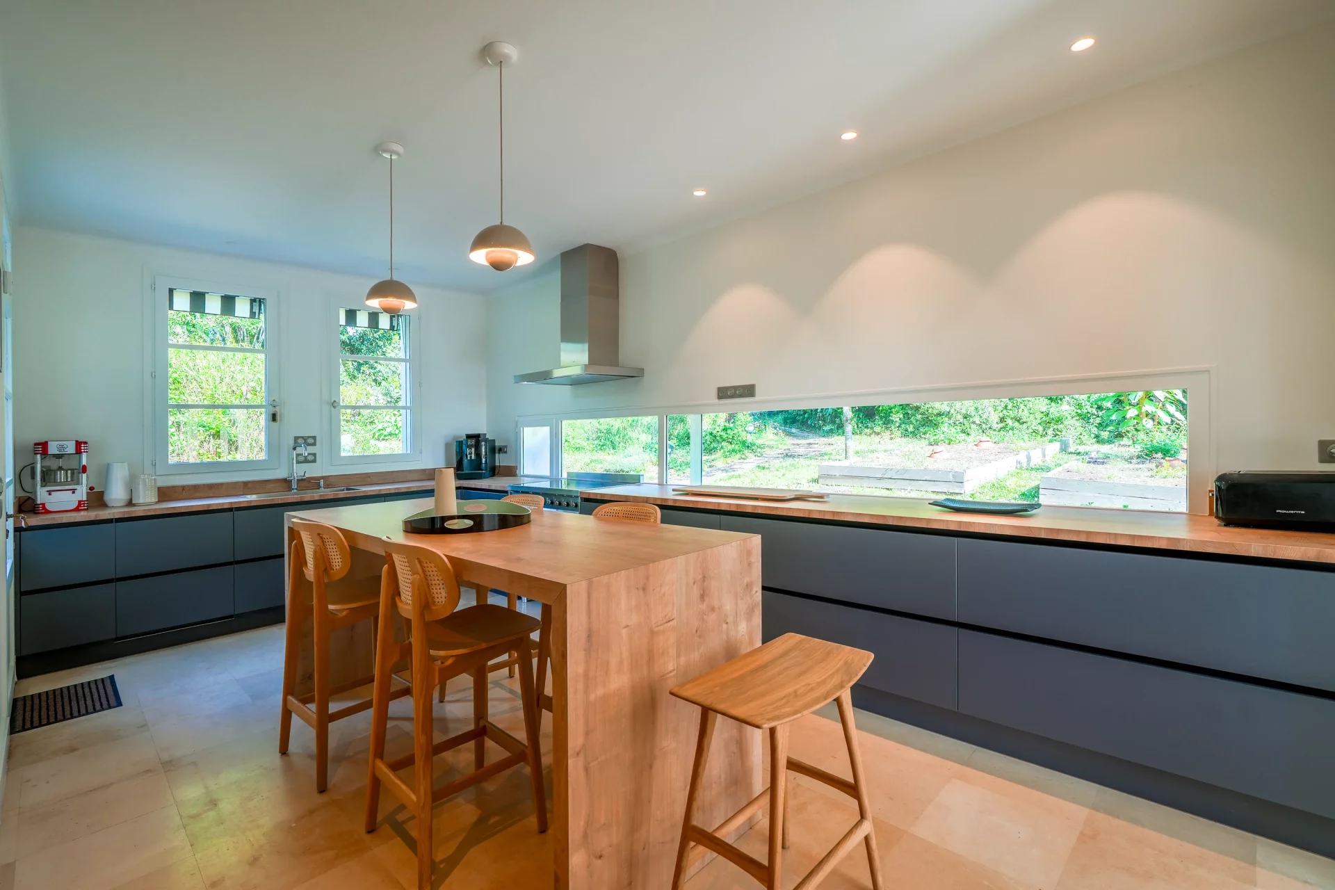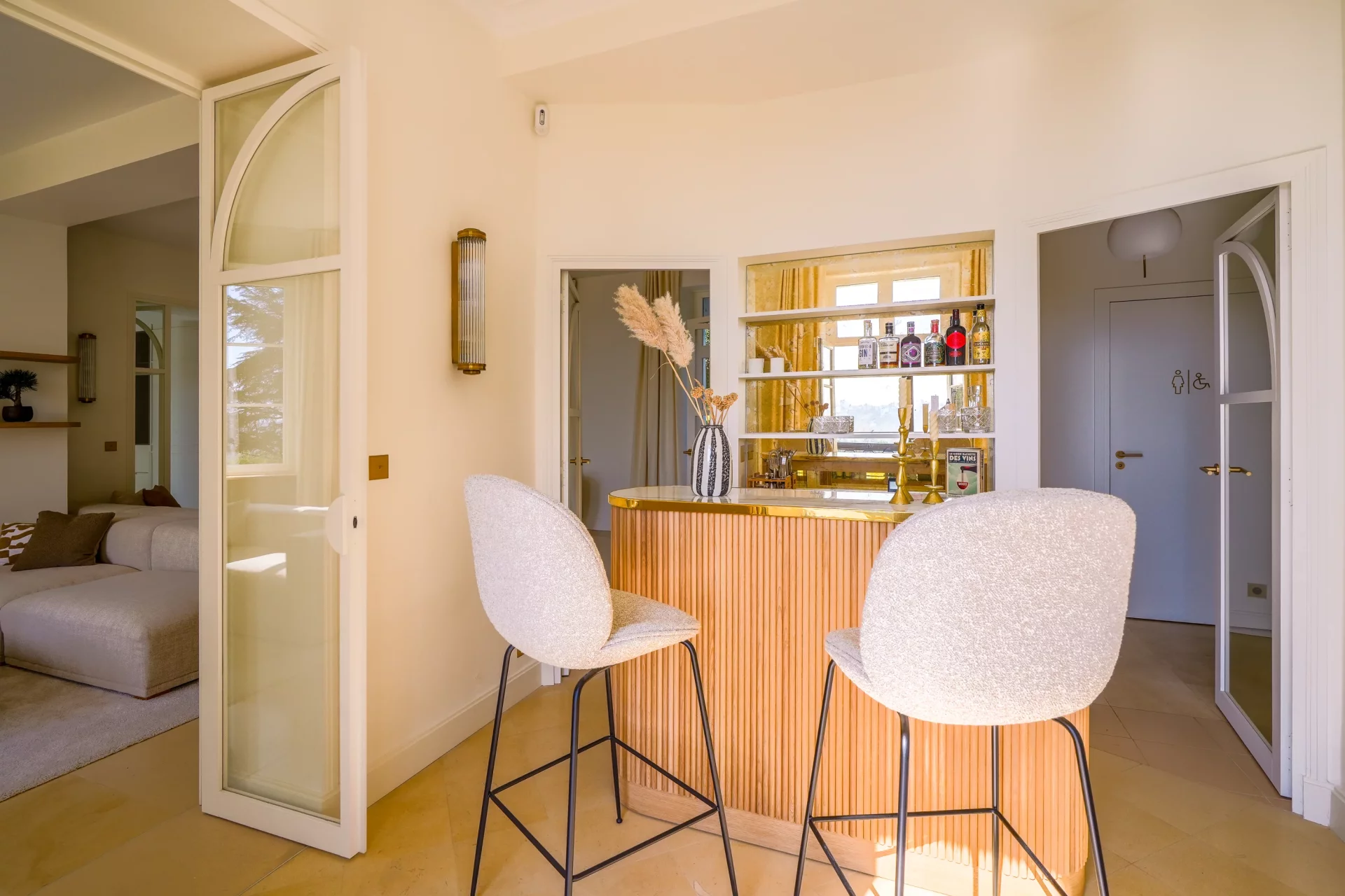 The ground floor, entirely accessible to mobility standards, comprises 170 square metres of reception rooms including an entrance hall with cloakroom and guest WC, a fitted and equipped kitchen opening onto a dining room, a bar area with direct access to the terrace steps and terrace, and a double-aspect drawing room with fireplace. The private wing houses a master suite comprising bedroom, shower room and WC.