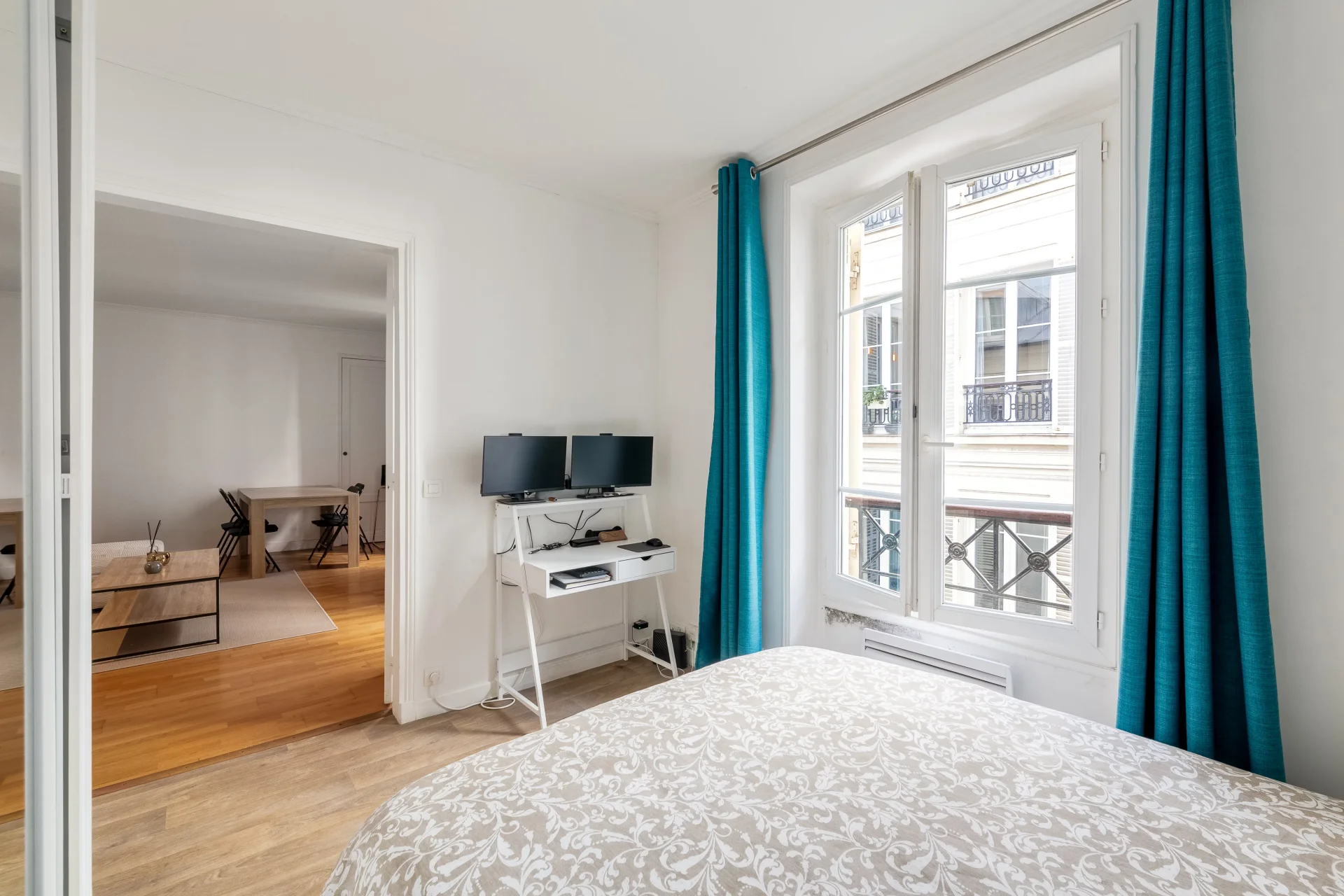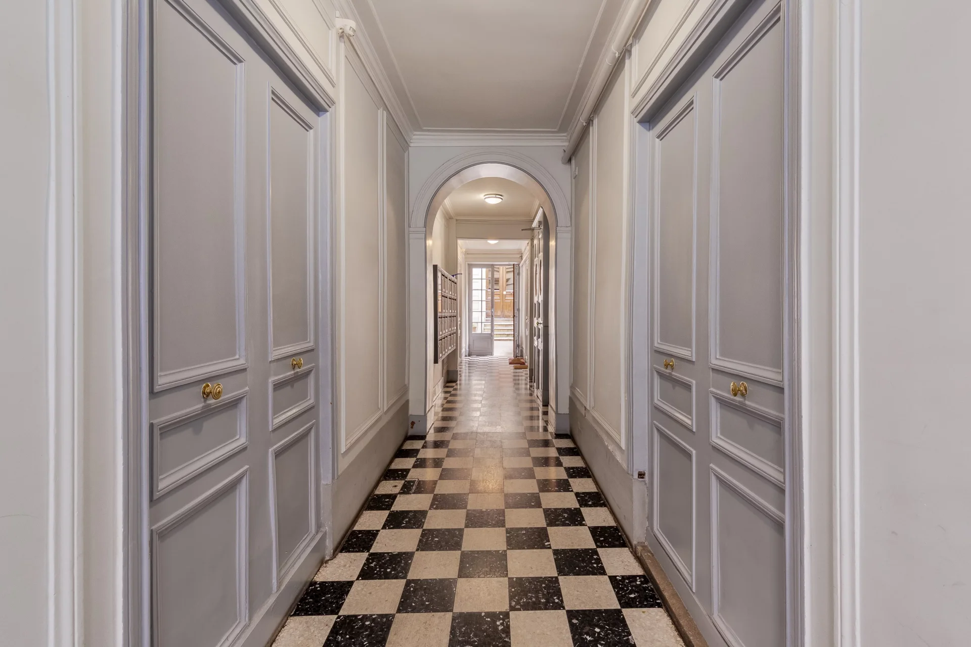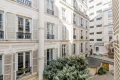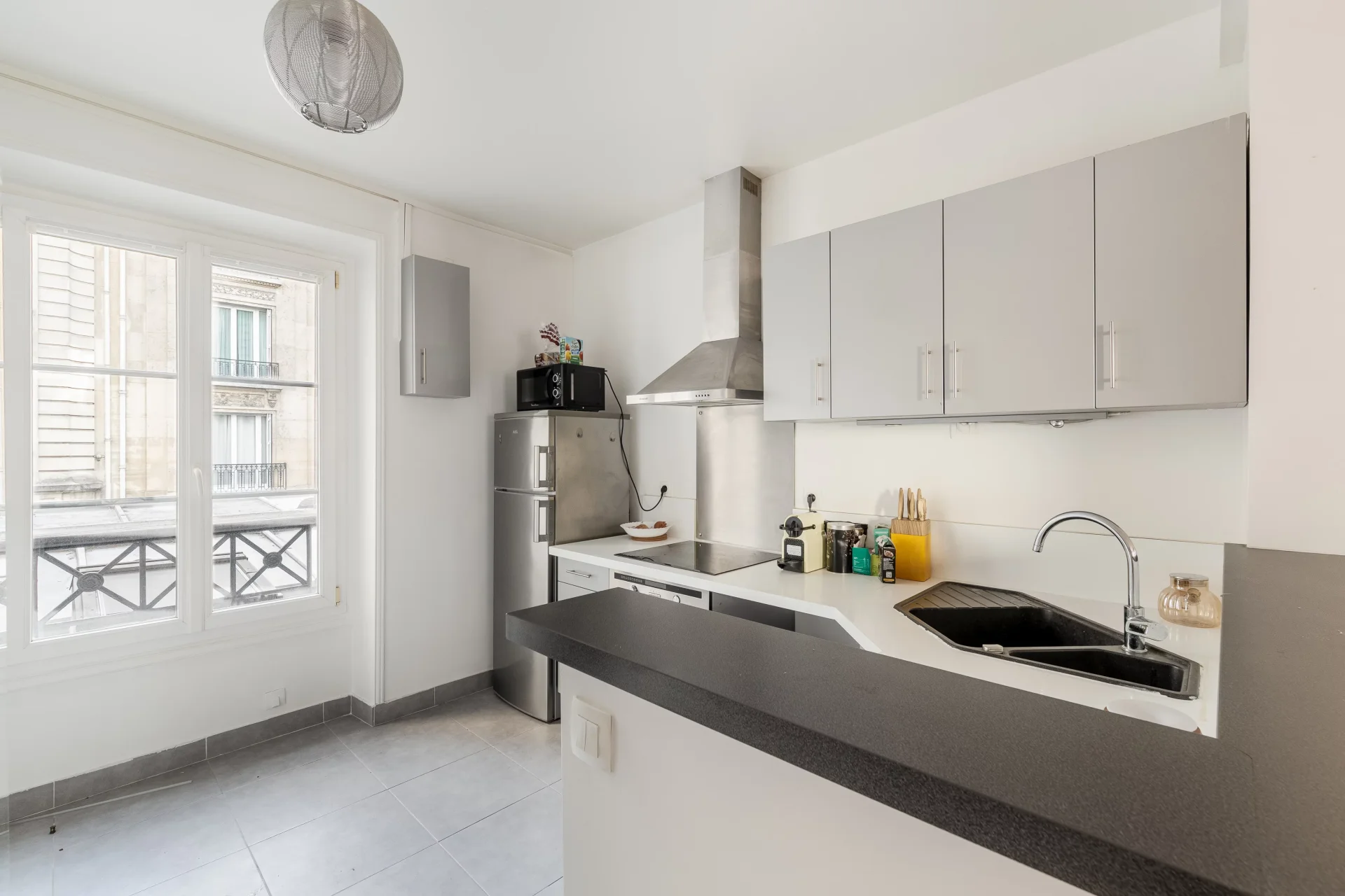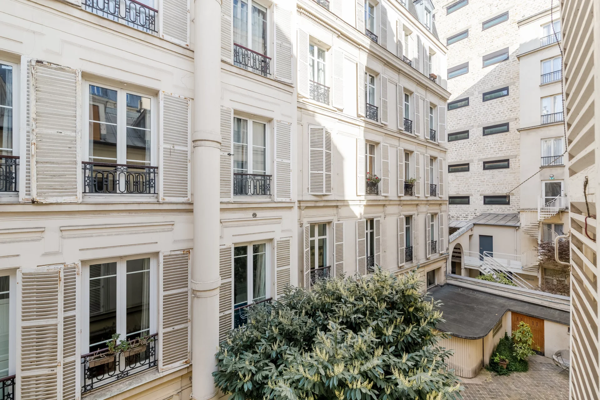 Fully renovated, the property includes an entrance leading to an open equipped kitchen, a living room overlooking the building's leafy courtyard, two bedrooms, a bathroom with toilets, and a laundry area.