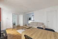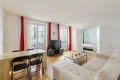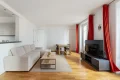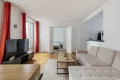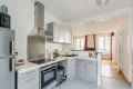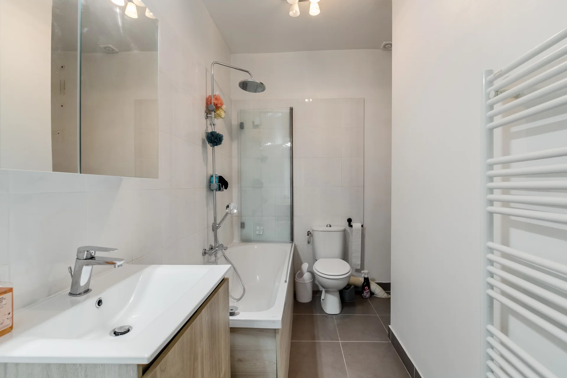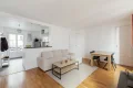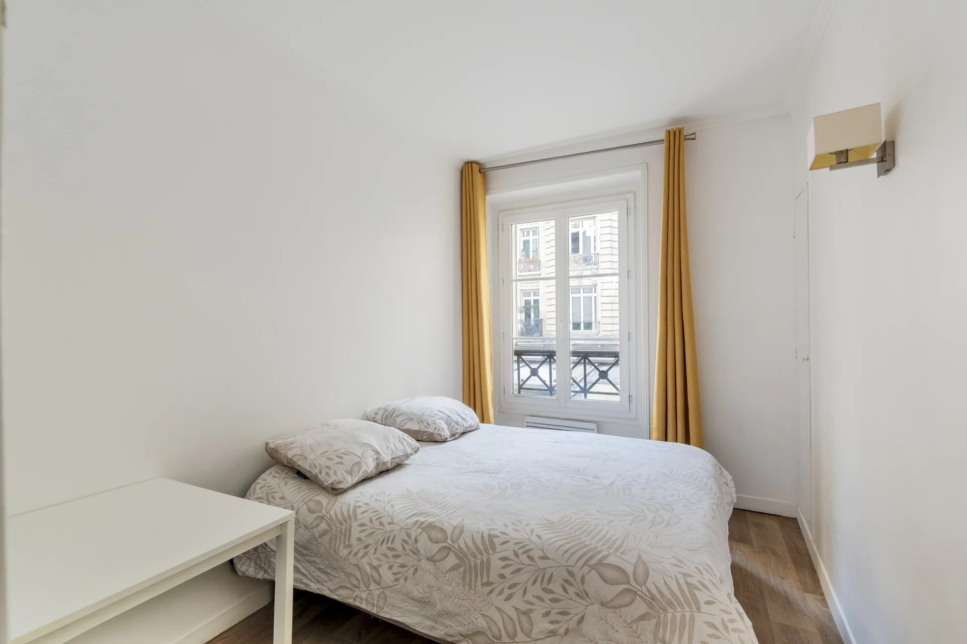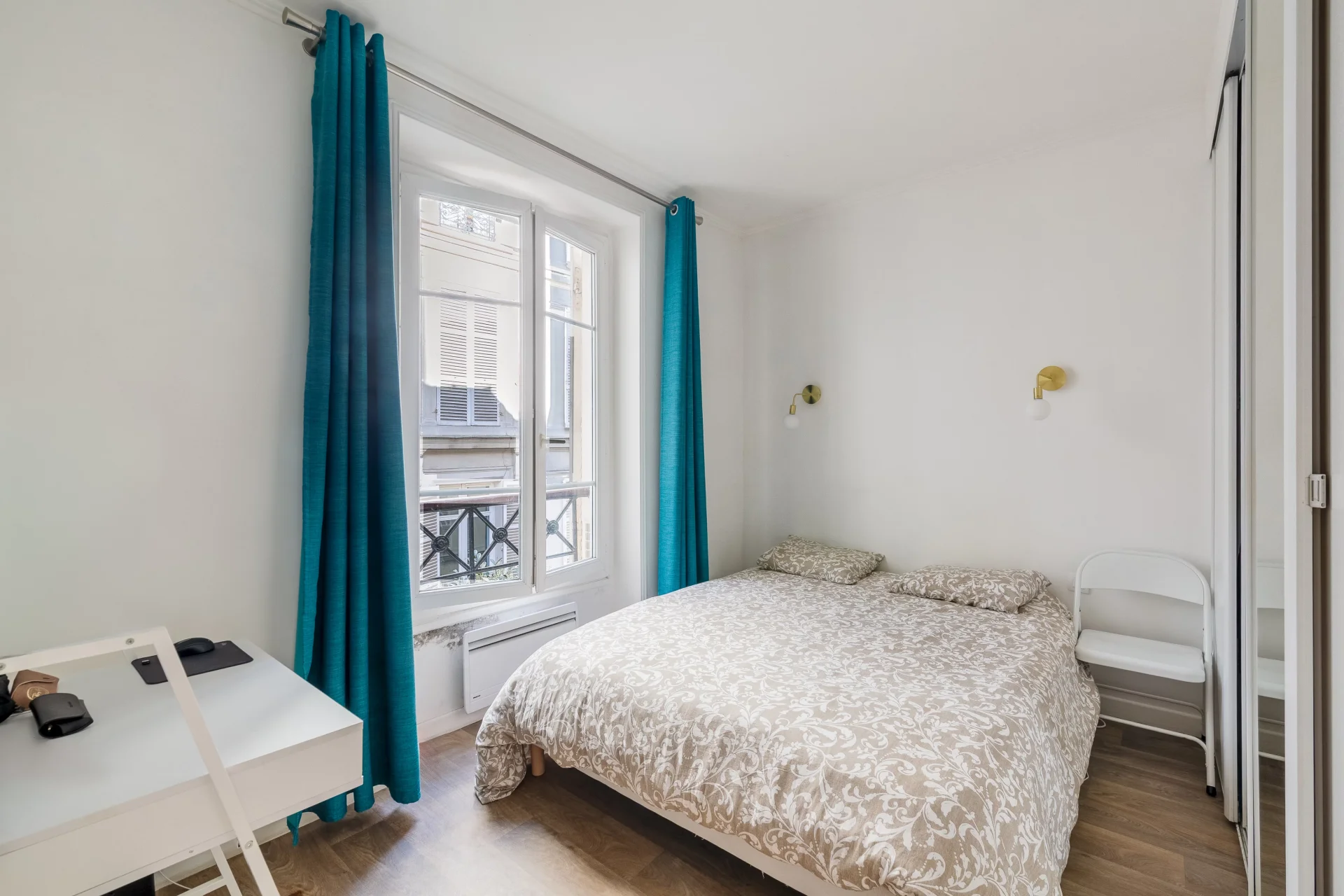 Fully renovated, the property includes an entrance leading to an open equipped kitchen, a living room overlooking the building's leafy courtyard, two bedrooms, a bathroom with toilets, and a laundry area.