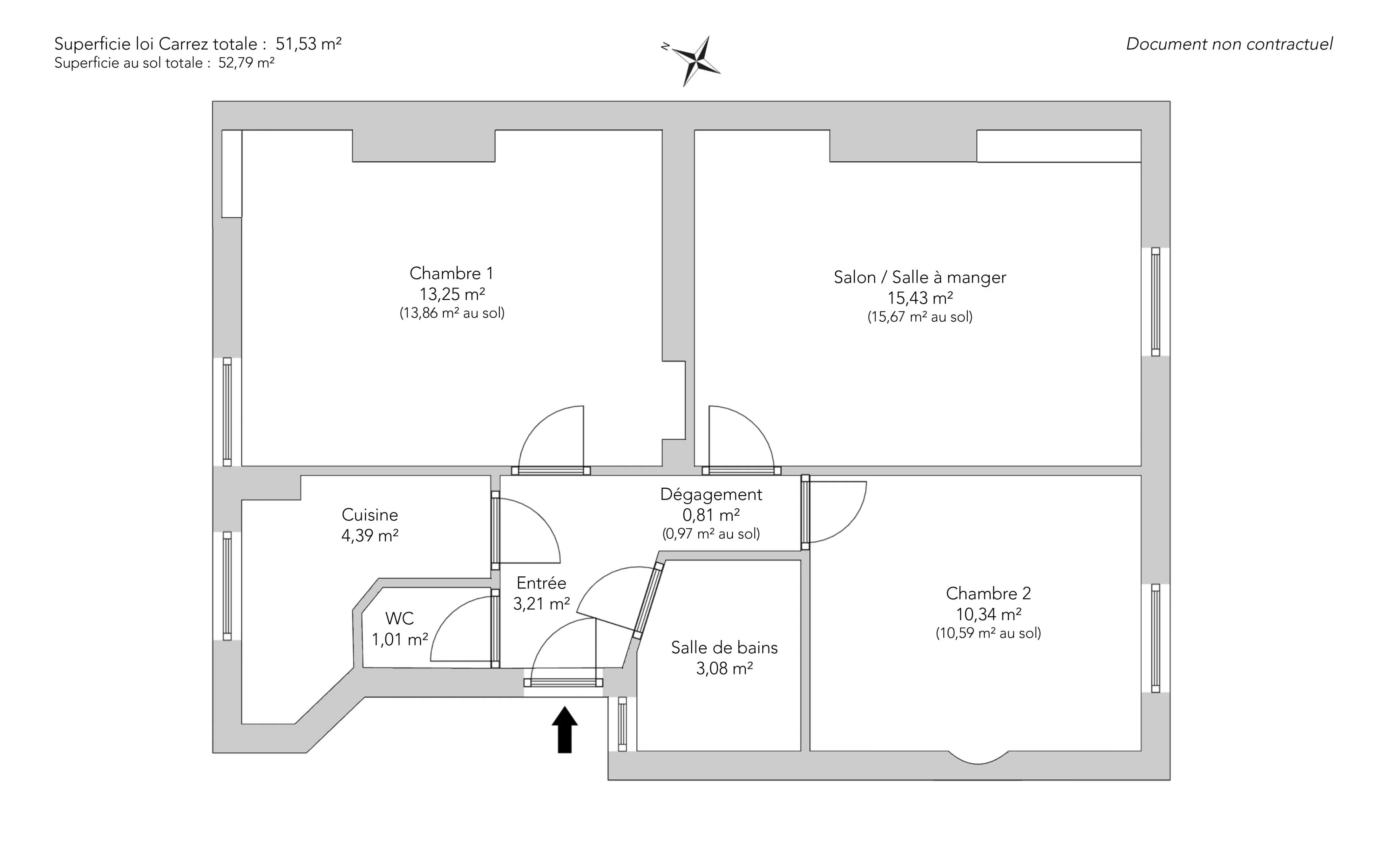 Its optimized star layout features an entrance hall, a pleasant south-facing living room, two bedrooms, a fitted kitchen, a bathroom and a separate toilet. The modular layout allows the apartment to be configured as a bedroom and a double living room.
