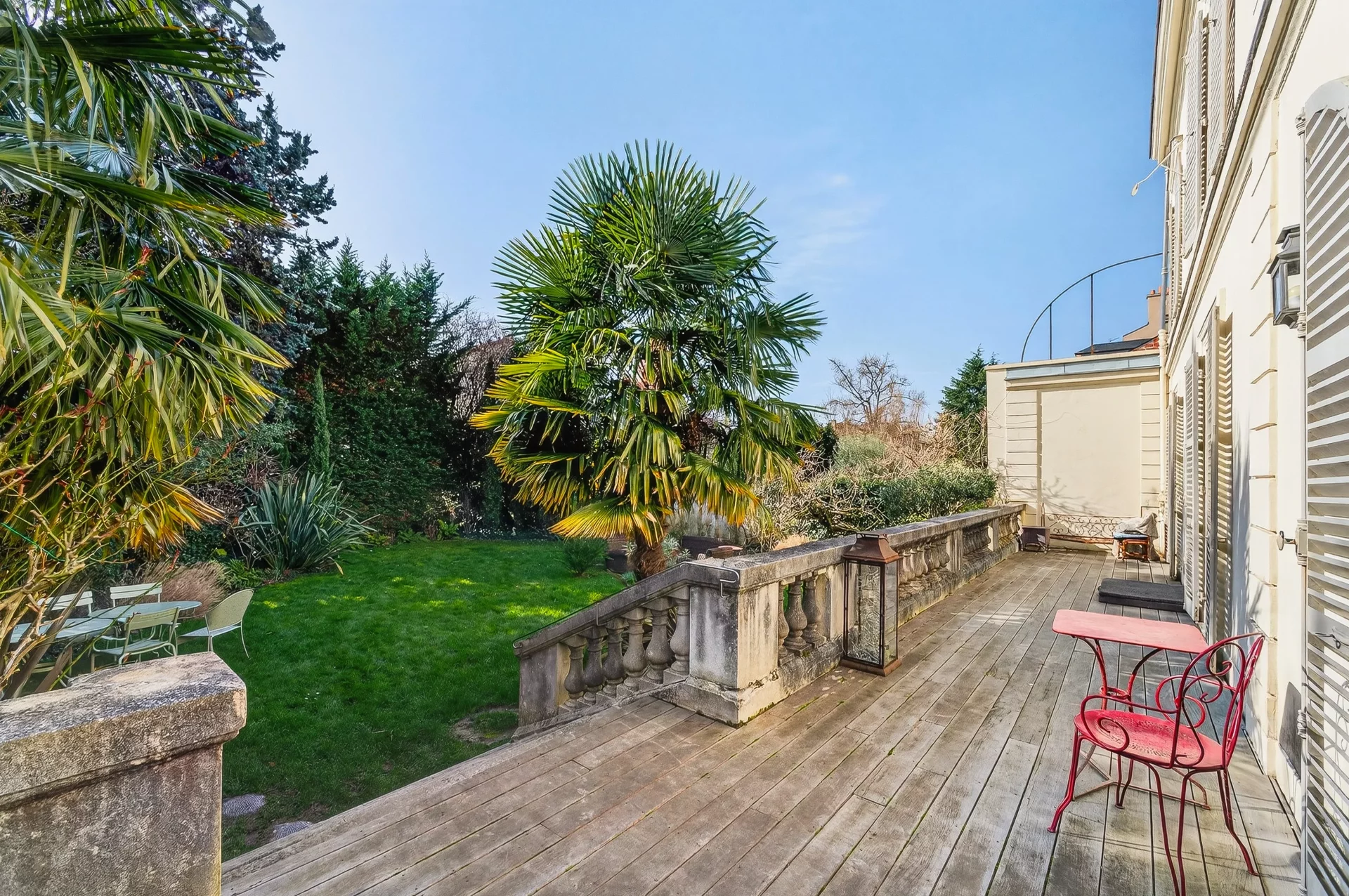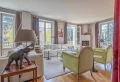 An entrance hall leads to the first floor, comprising a living room, two bedrooms, a kitchen with glass roof and a shower room. The whole opens directly onto the terrace and garden, creating a natural continuity between inside and outside. From both the house and the garden, the view of the dome of the Sainte-Jeanne-d'Arc church gives the ensemble a remarkable perspective and a true Versailles signature. This level can be fully integrated into the house, or remain appreciably independent, depending on lifestyle plans.
