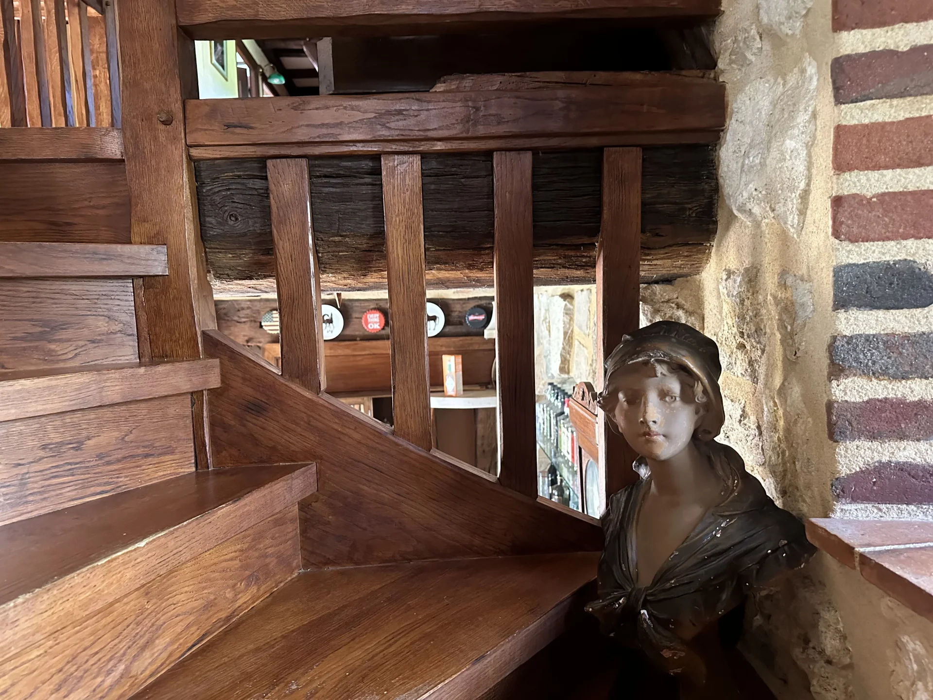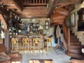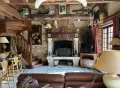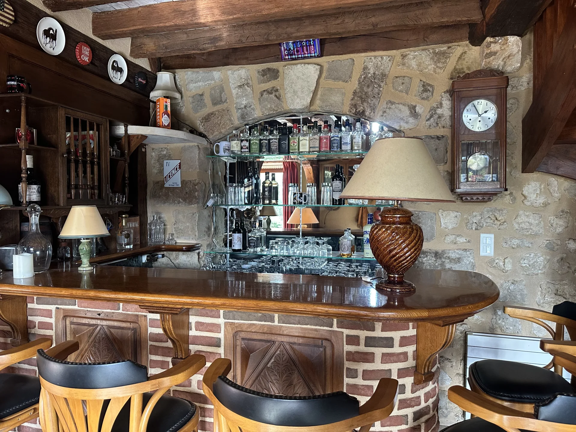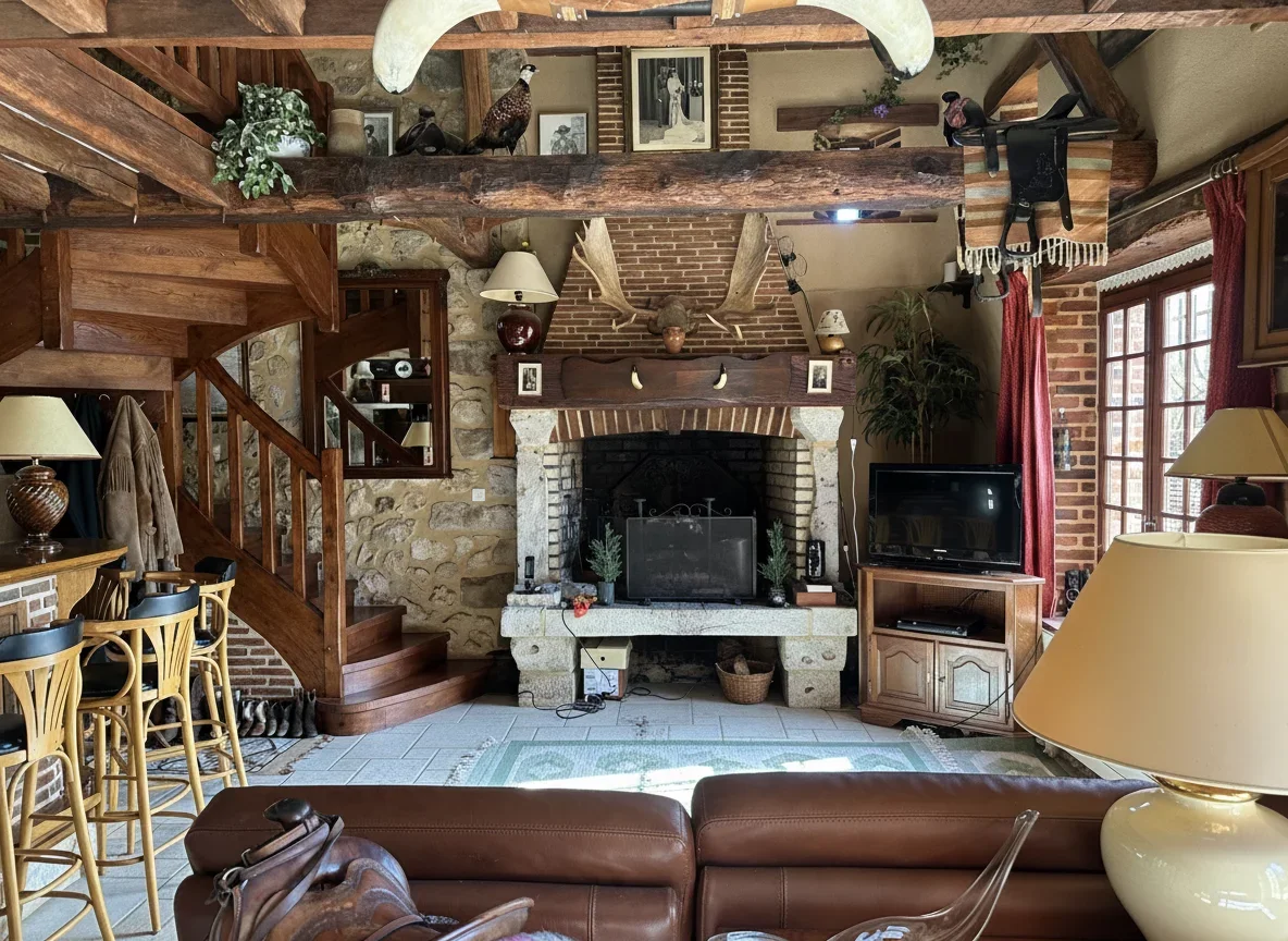 Le séjour cathédrale de 62m² impressionne par sa hauteur sous charpente, son bar intégré en pierre et brique et sa cheminée monumentale — une atmosphère chaleureuse et conviviale hors du commun.
