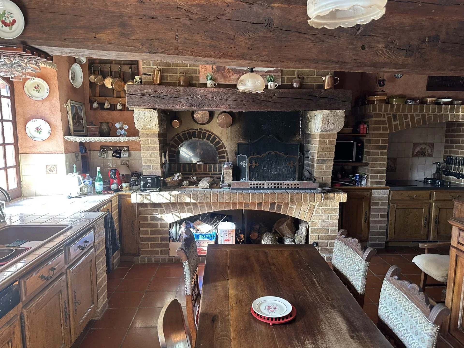 La cuisine équipée avec sa cheminée de cuisson fonctionnelle et son four à pain en brique invite à des moments de partage authentiques autour du feu.