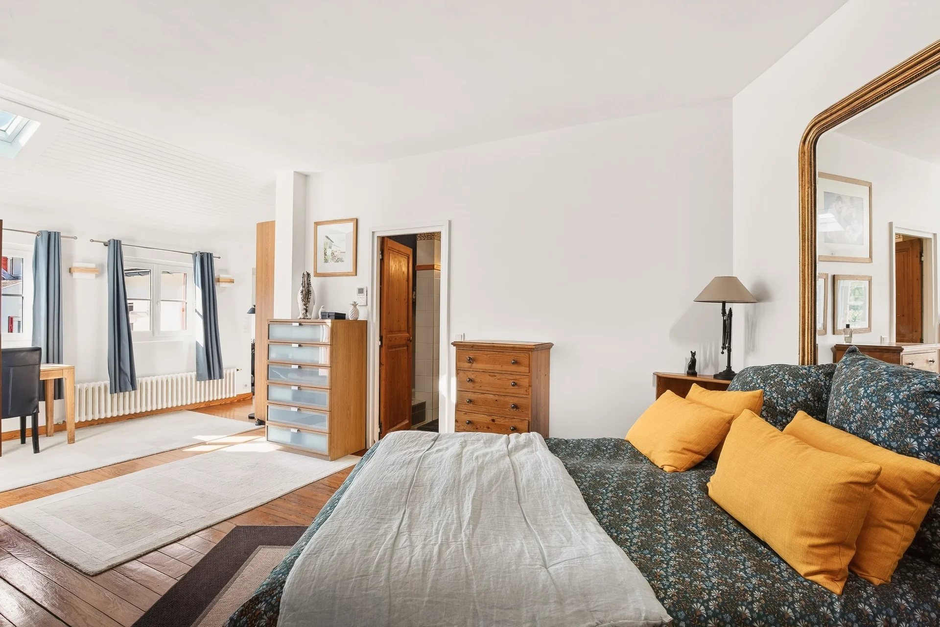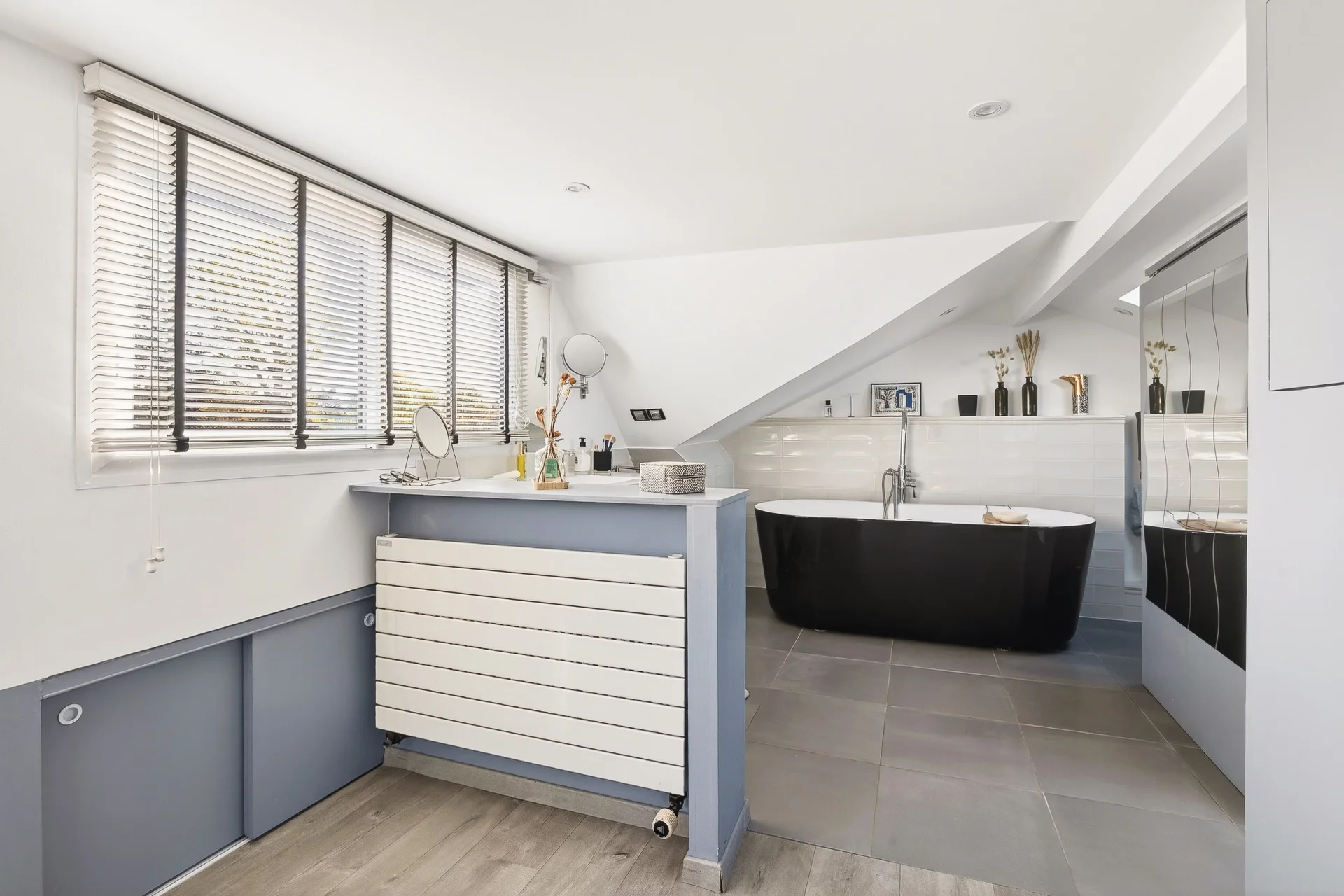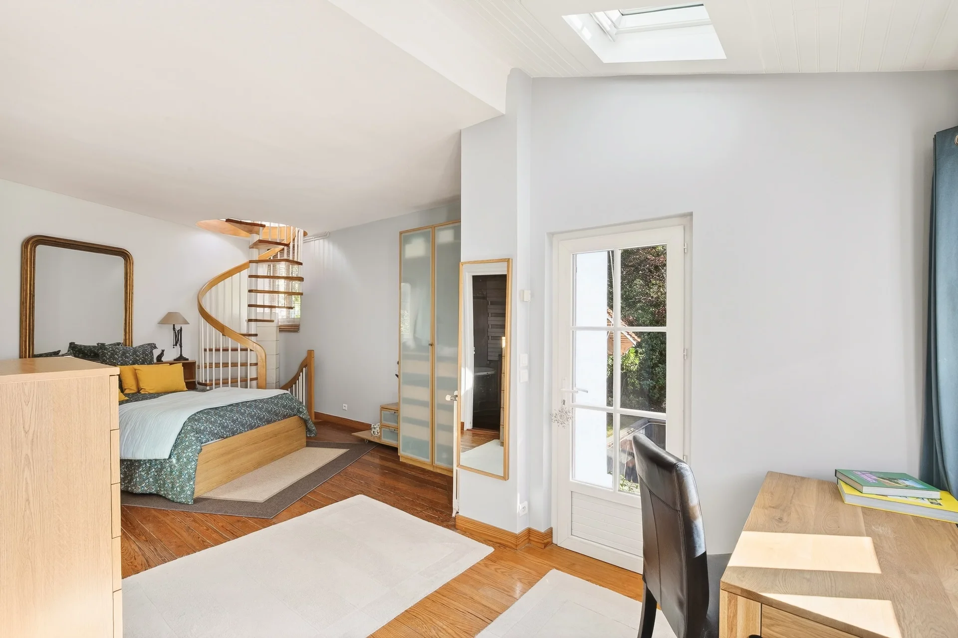 D’un côté, la suite parentale développe environ 30 m². Elle bénéficie d’un accès direct au jardin et comprend une salle de bains complète avec douche, baignoire et double vasque, un bureau sous combles ainsi qu’une pièce polyvalente de 12 m². L’ensemble forme un espace indépendant.