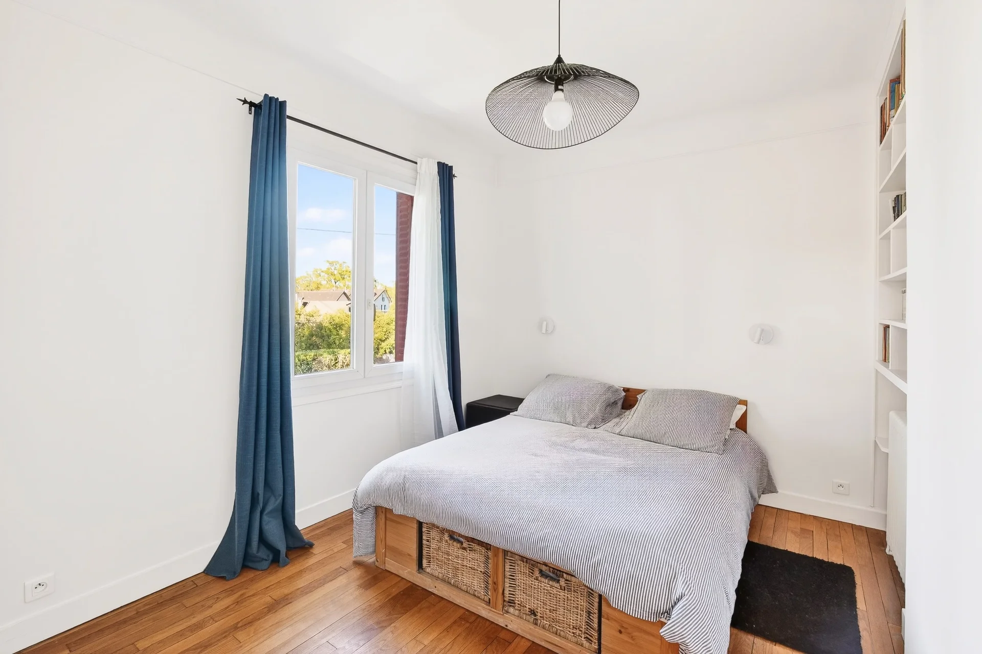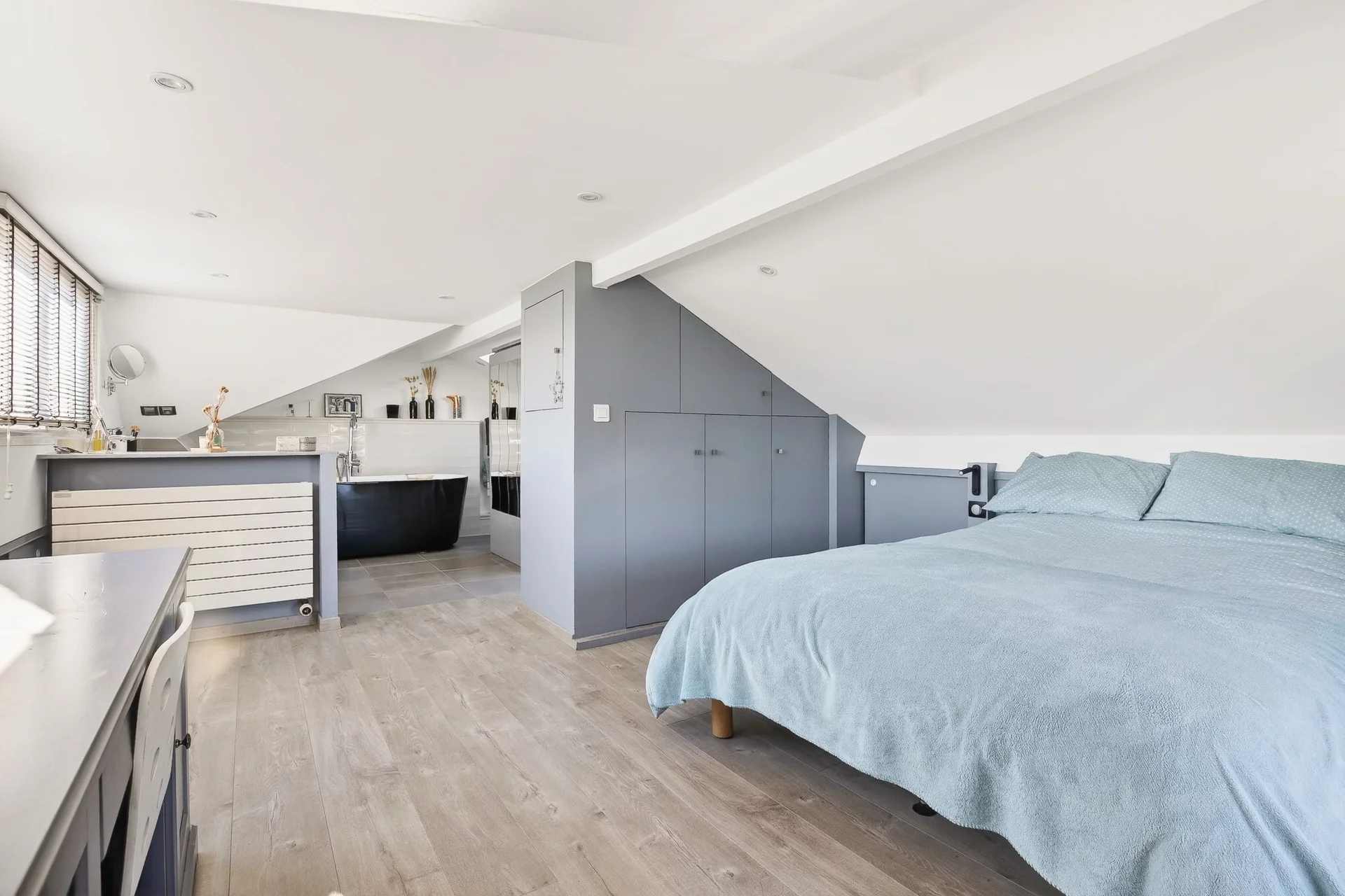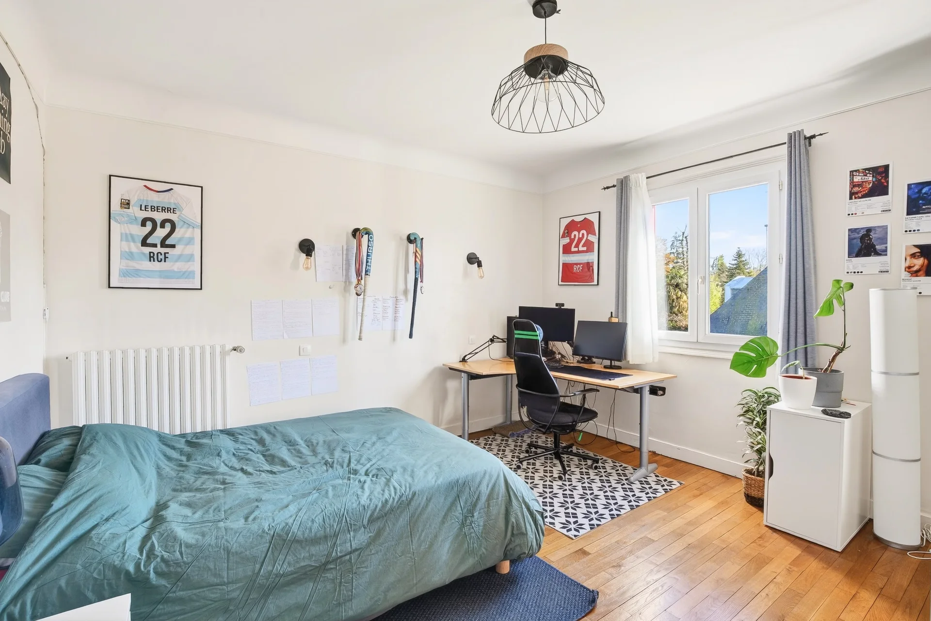 D’un côté, la suite parentale développe environ 30 m². Elle bénéficie d’un accès direct au jardin et comprend une salle de bains complète avec douche, baignoire et double vasque, un bureau sous combles ainsi qu’une pièce polyvalente de 12 m². L’ensemble forme un espace indépendant.
