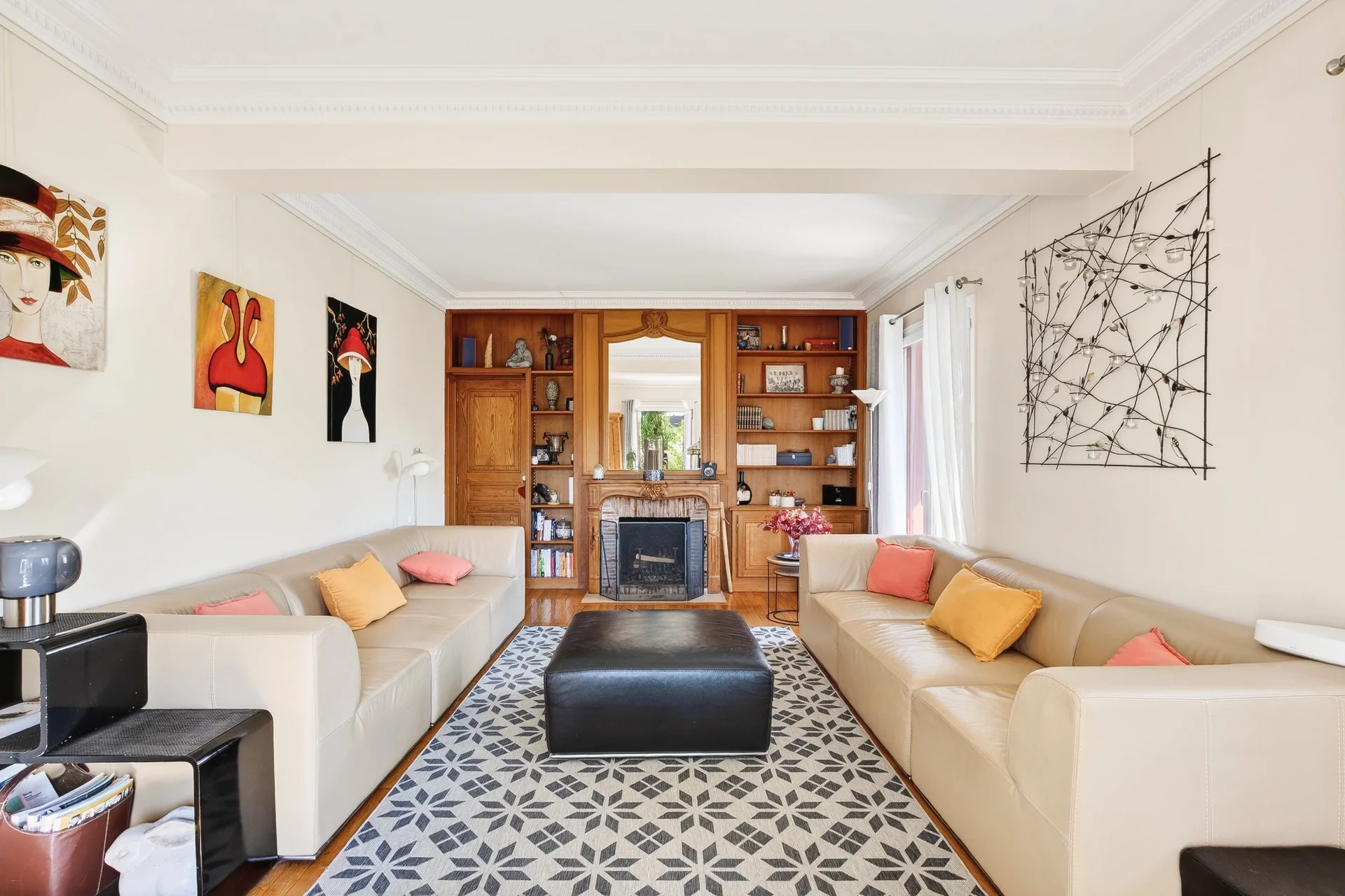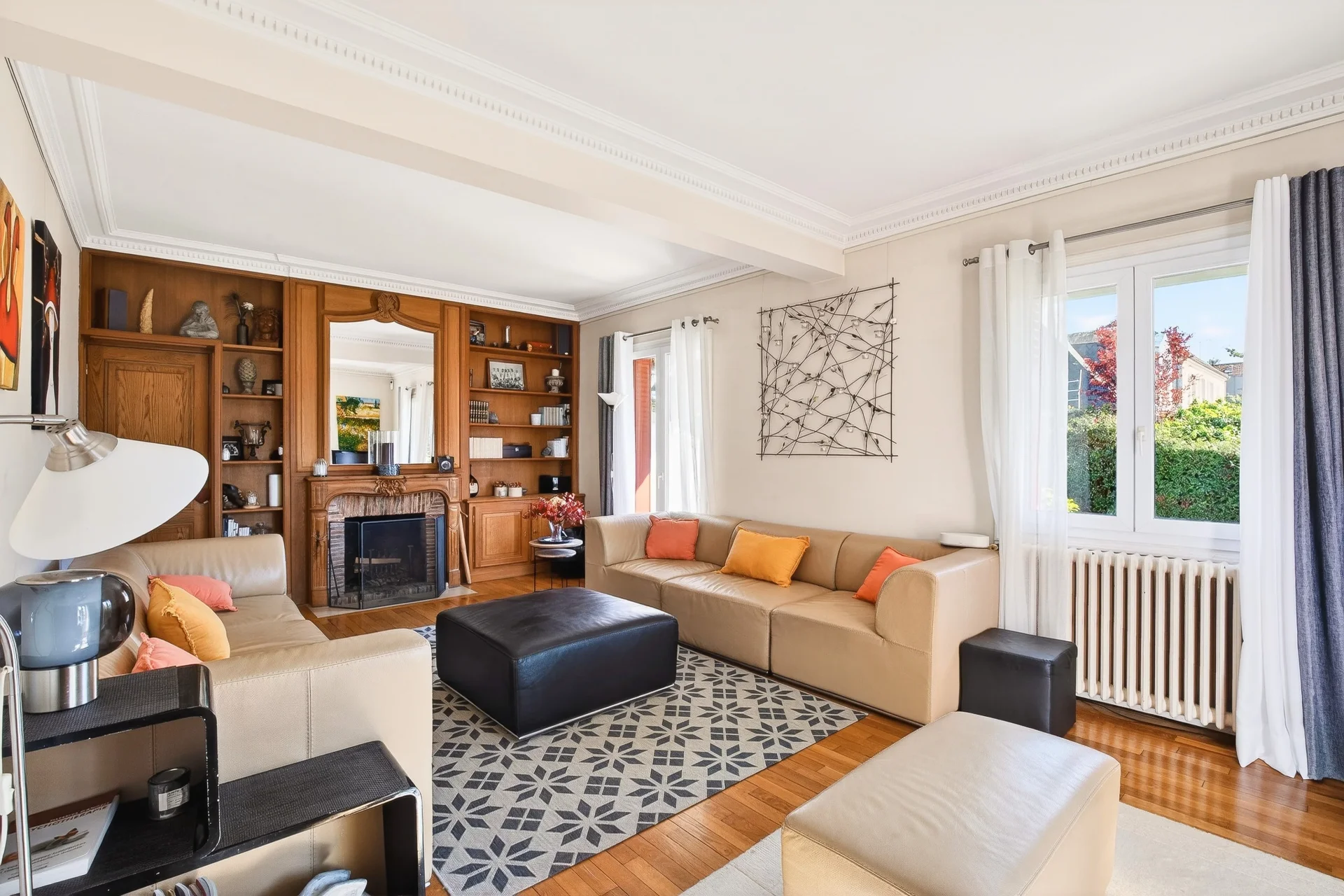 Le séjour, en double exposition sud et sud-ouest, en bénéficie dès le matin et tout au long de la journée. Une cheminée en chêne massif, parfaitement fonctionnelle, et une bibliothèque intégrée structurent l’espace et invitent à s’y installer durablement.