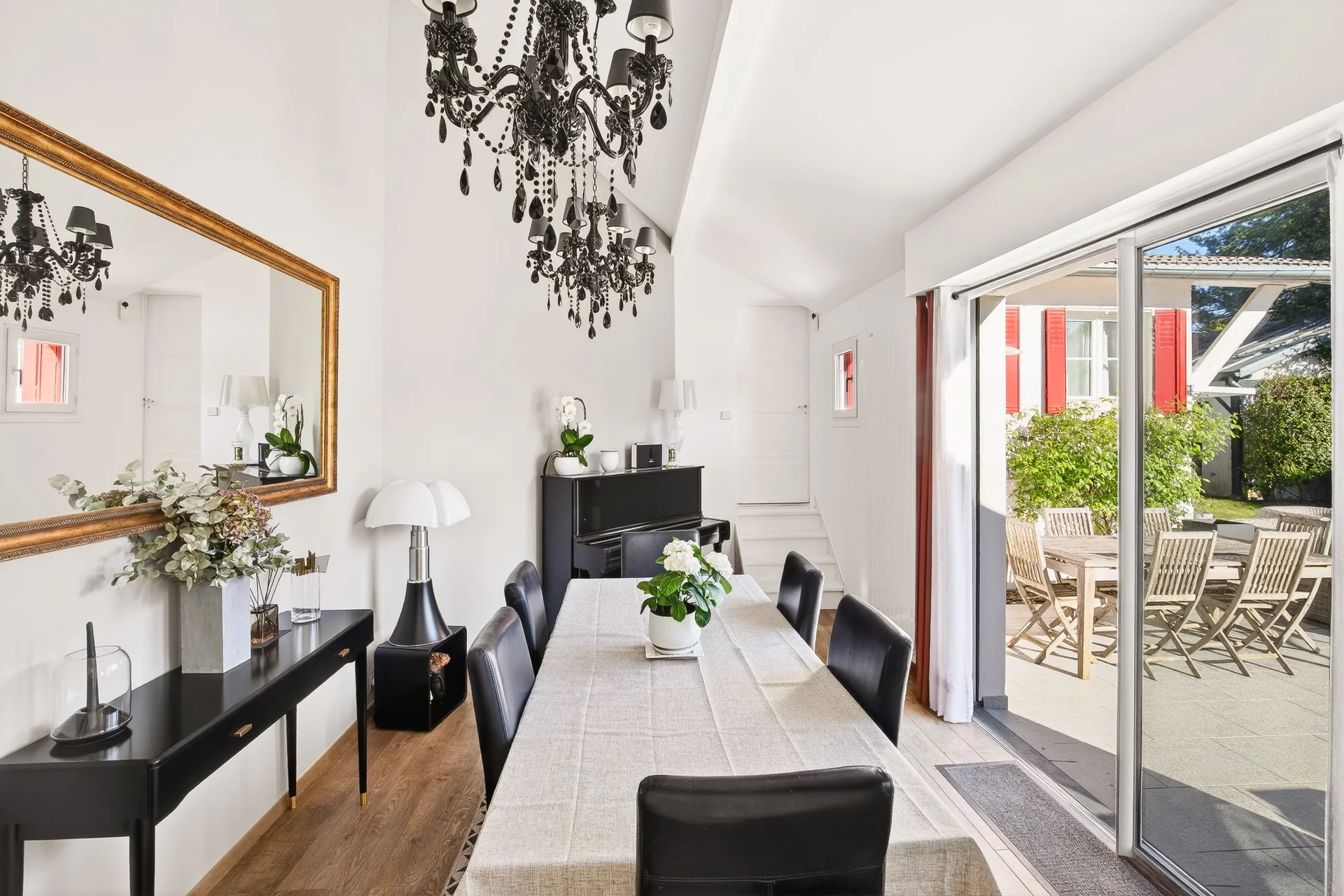 La salle à manger, d’une surface de 17 m² et exposée plein sud, s’ouvre directement sur une terrasse de plus de 50 m², de plain-pied. Elle prolonge naturellement les espaces de vie vers l’extérieur et permet d’organiser facilement des repas en terrasse ou des moments de détente autour de la piscine, rénovée en 2026 et exposée toute la journée.