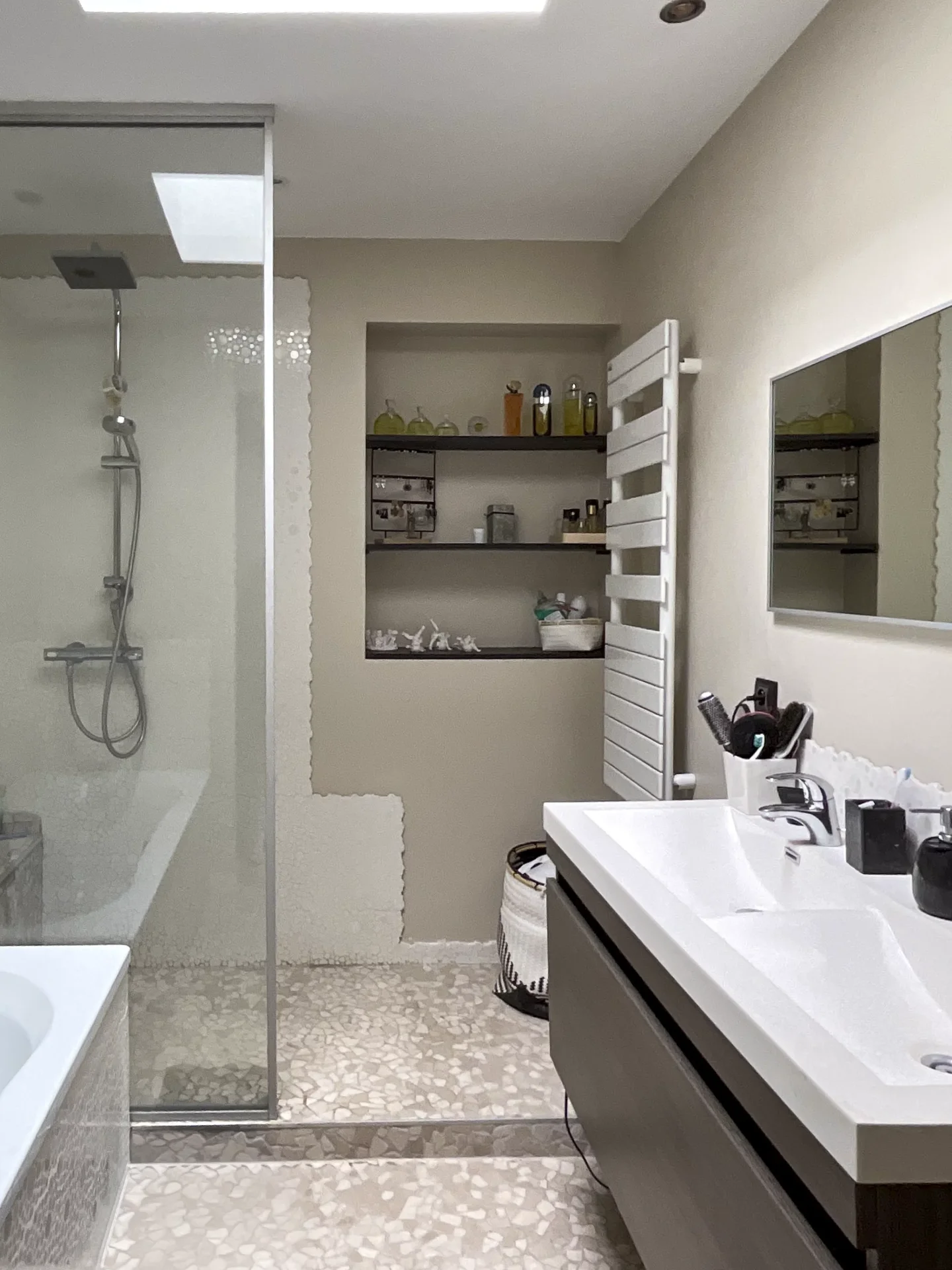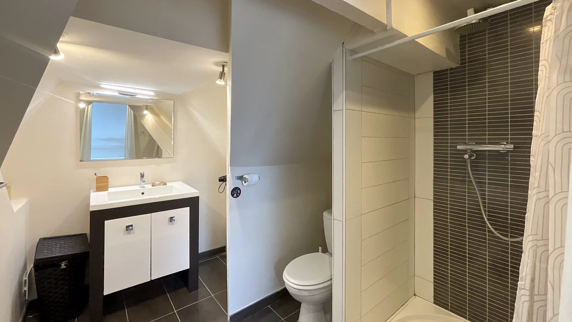 Upstairs, you will find two spacious bedrooms and a bathroom. The top level, converted under the eaves, includes a large landing currently used as an office, as well as a beautiful bedroom with a shower room. A large 18m² outbuilding and a secure parking space with an electric gate complete this property.
