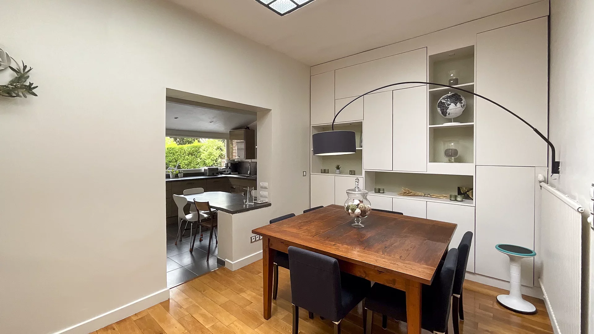 This family home stands out for its character and well-thought-out spaces. On the ground floor, a blue stone entrance hall equipped with storage and toilets leads to a cozy living room with solid wood flooring, fireplace, and bow window. This space opens onto an elegant dining room with a glass roof, a TV corner, and a large equipped kitchen directly overlooking the garden. A laundry room and a cellar complete this level.