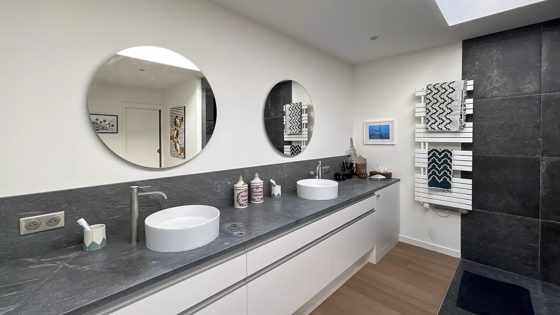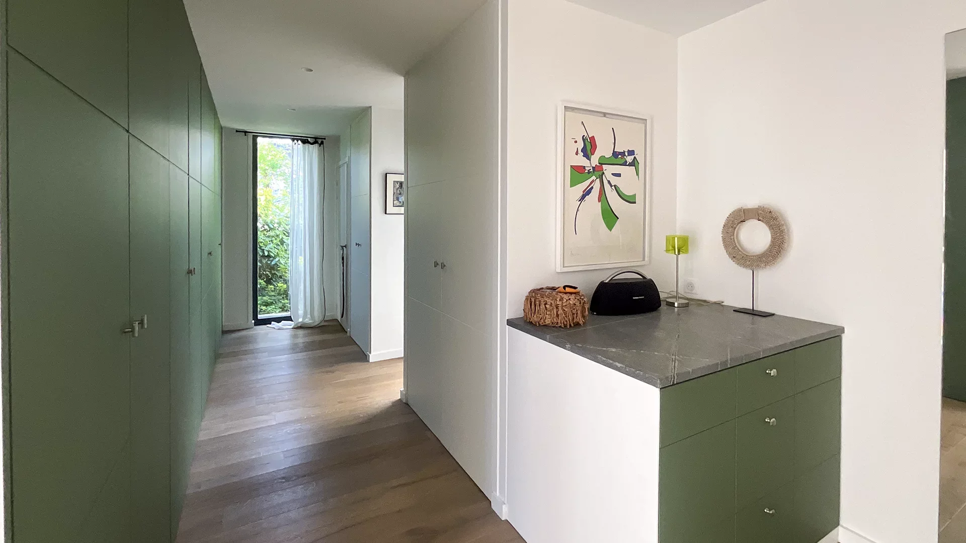 The ground floor continues with a superb master suite of over 60m² with a wonderful view of the garden, featuring a custom dressing room, private bathroom and toilets, then an office, laundry room, and a walk-in closet with toilets.