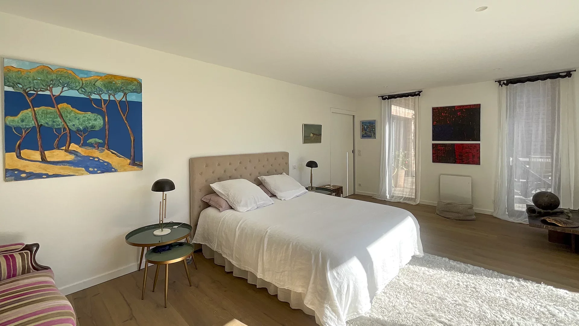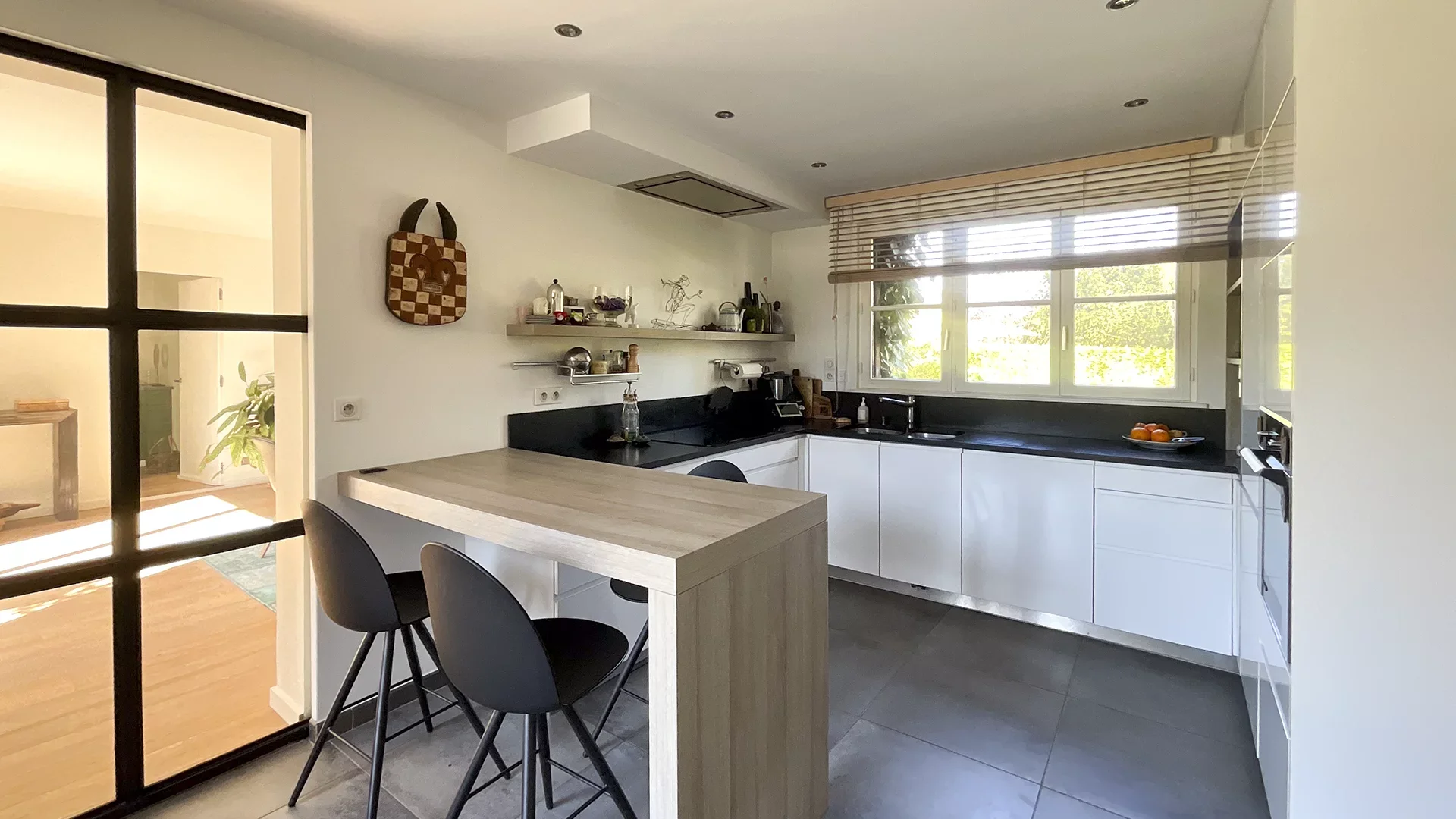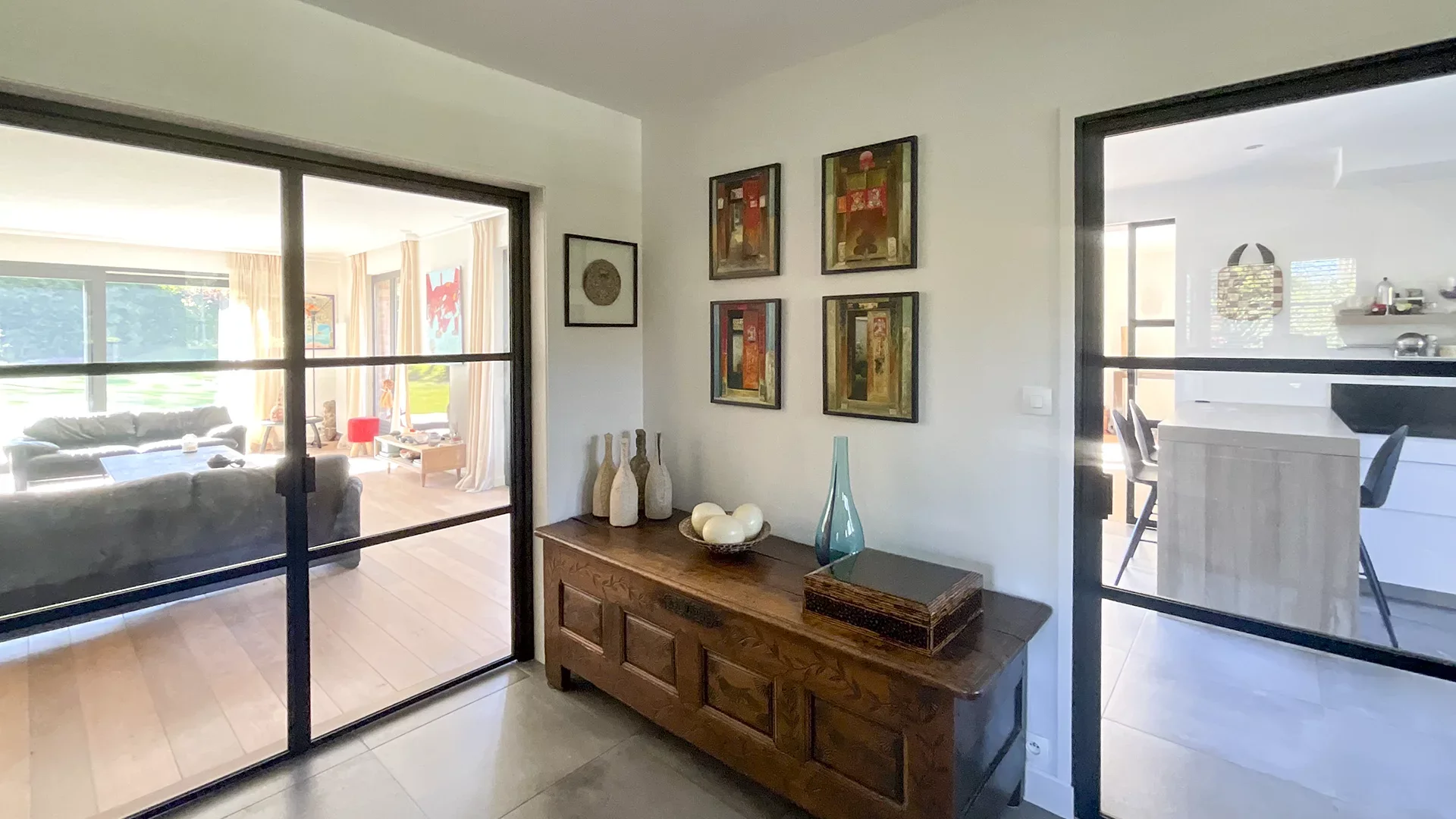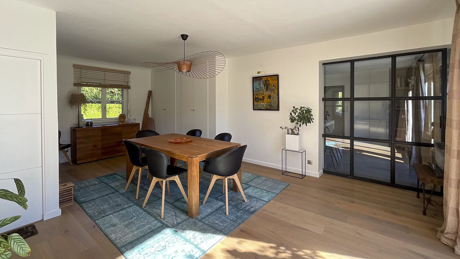 The entrance leads to a large and bright living room with a wood fire fireplace, then a fitted kitchen, and a large dining room; these three living areas (88m² in total) have several direct access points to the terrace without overlooking neighbors.