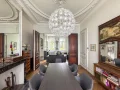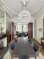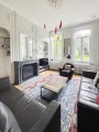 Upon entering, the double distribution leads to a magnificent double living room of 43m², highlighted by an ancient parquet, a fireplace, delicate moldings, and a high ceiling, providing a refined reception area.