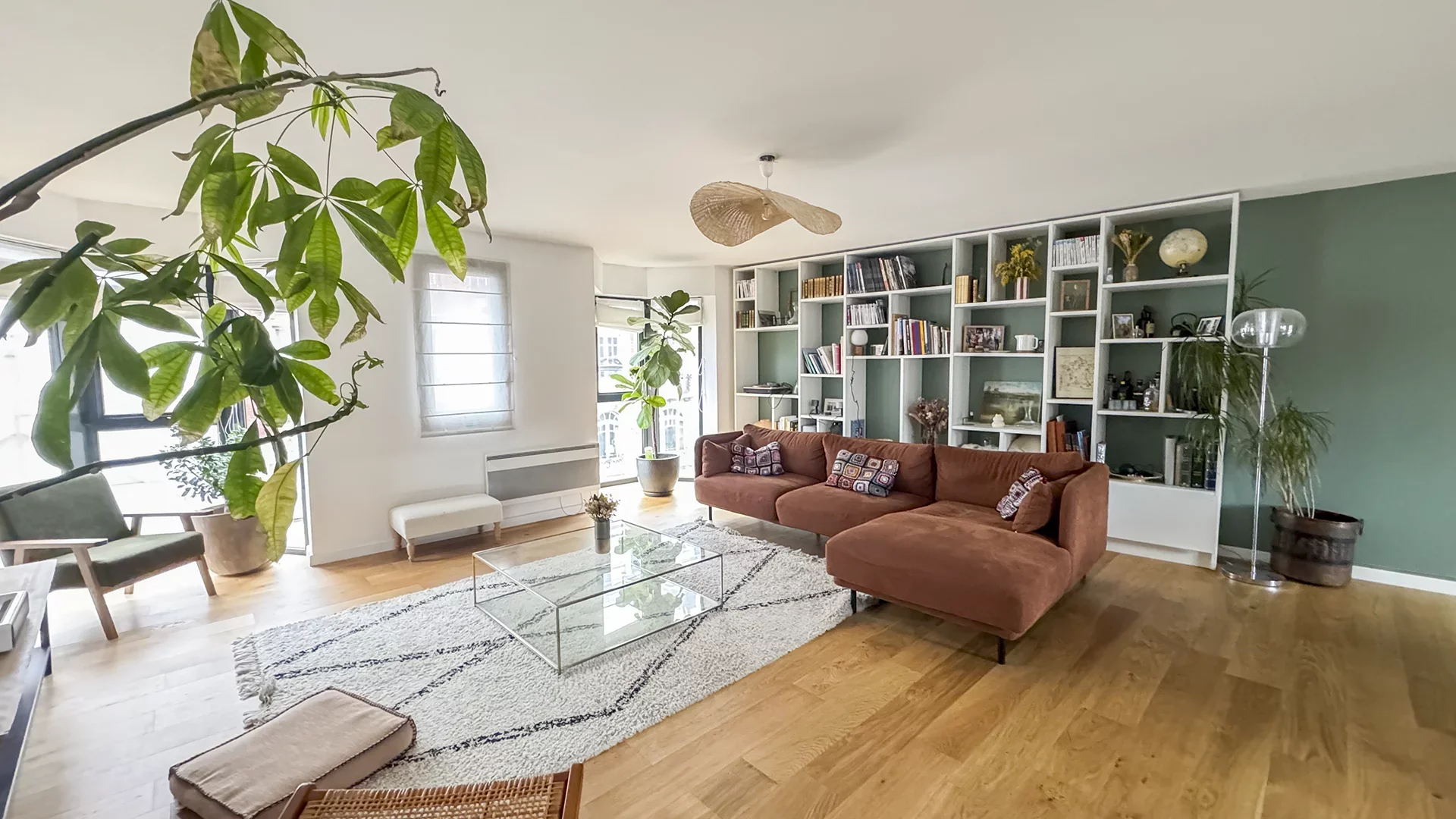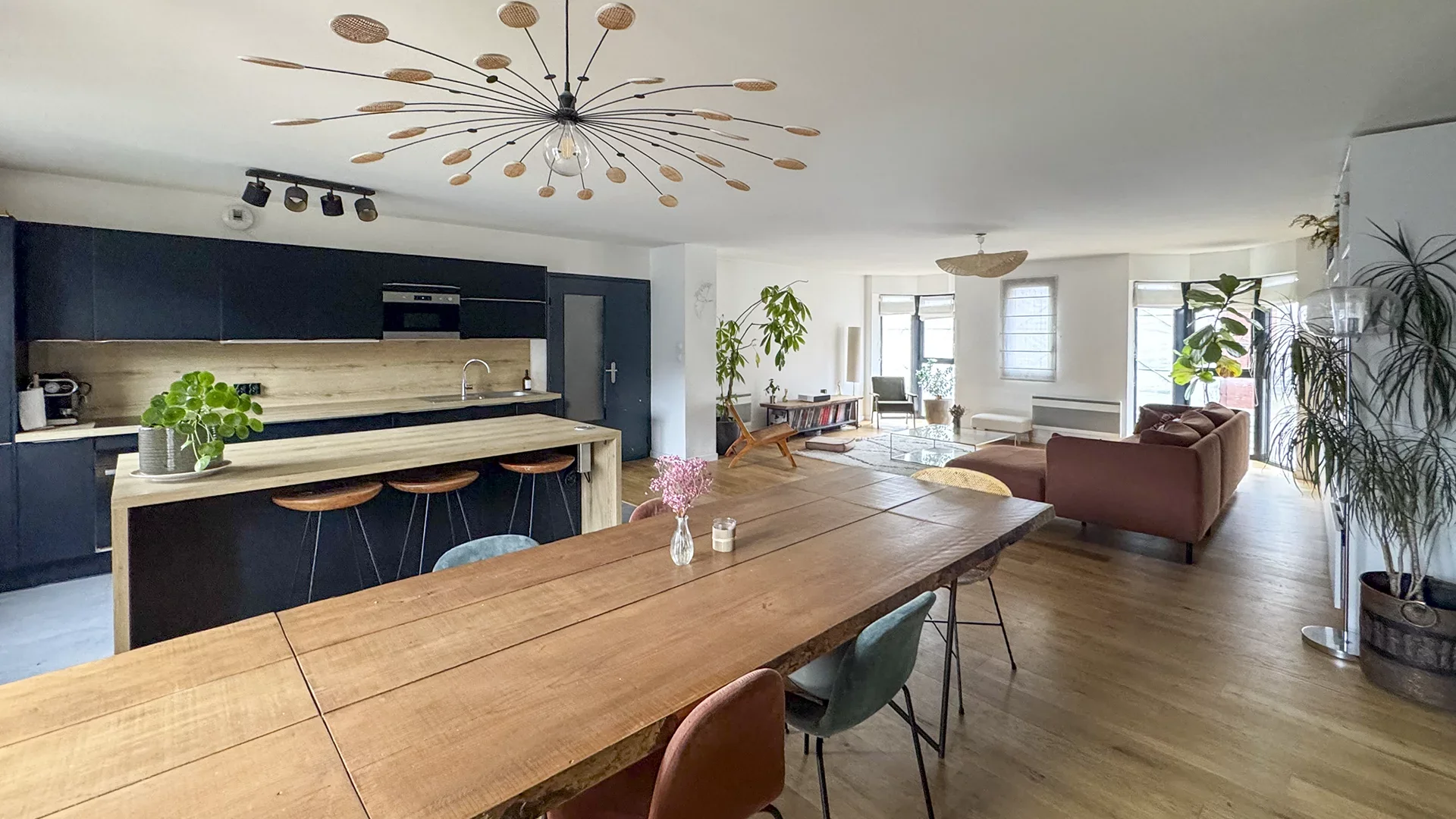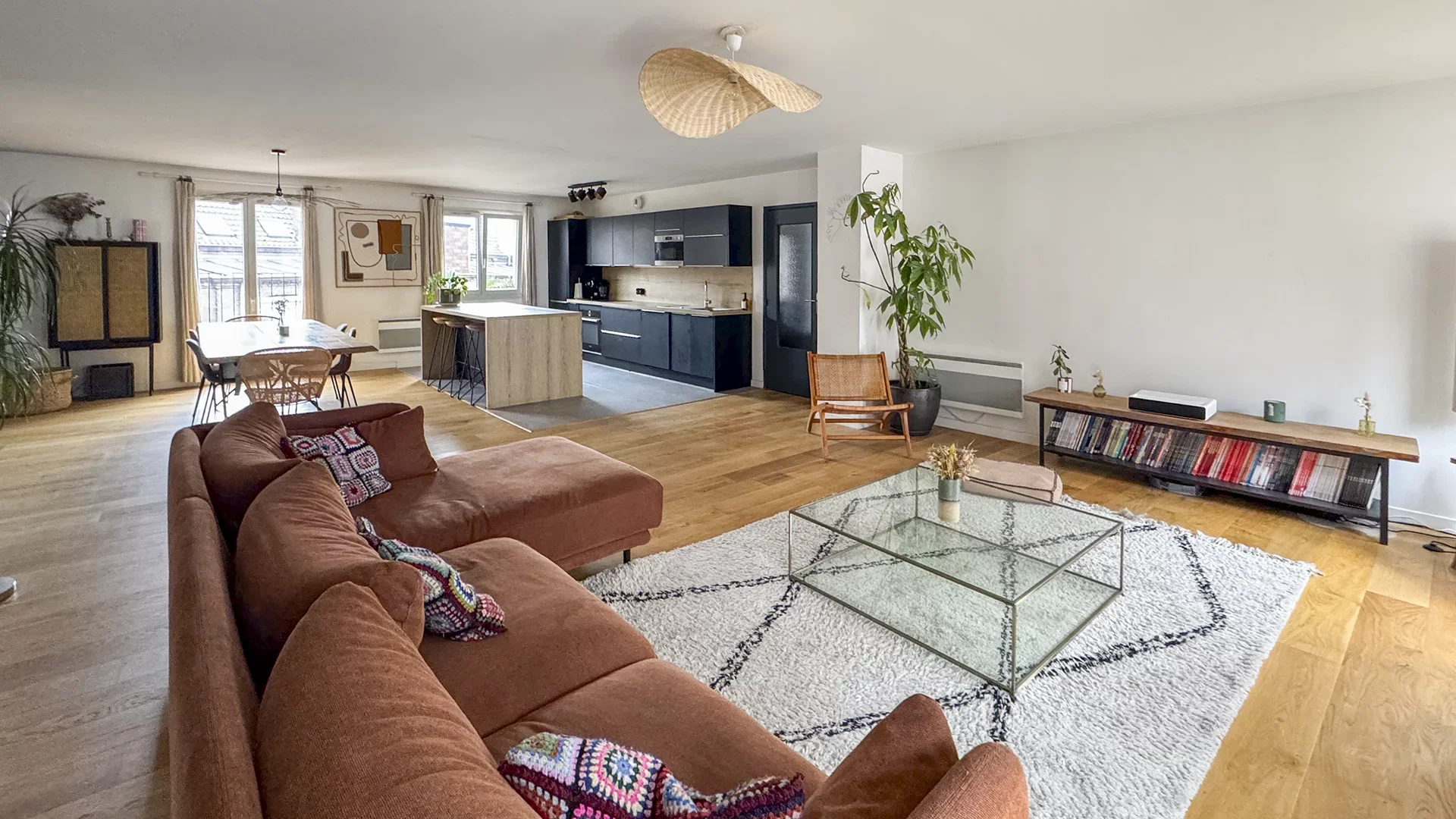 From the entrance, a hall welcomes you and leads to a spacious 63m² crossing living room, flooded with light, offering magnificent volumes. This reception space opens onto a fully equipped open kitchen, combining conviviality and modernity.