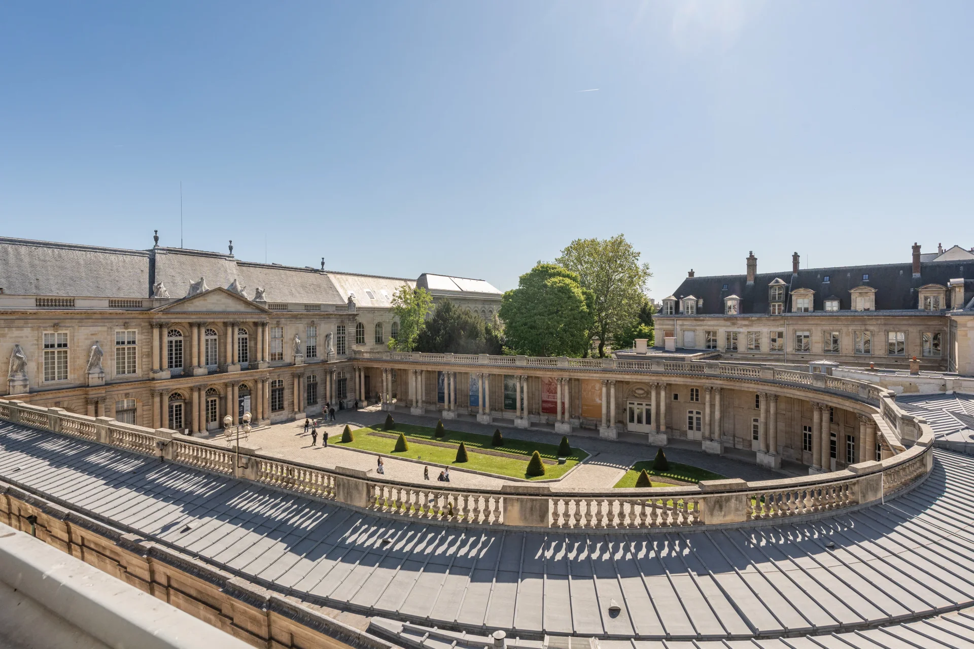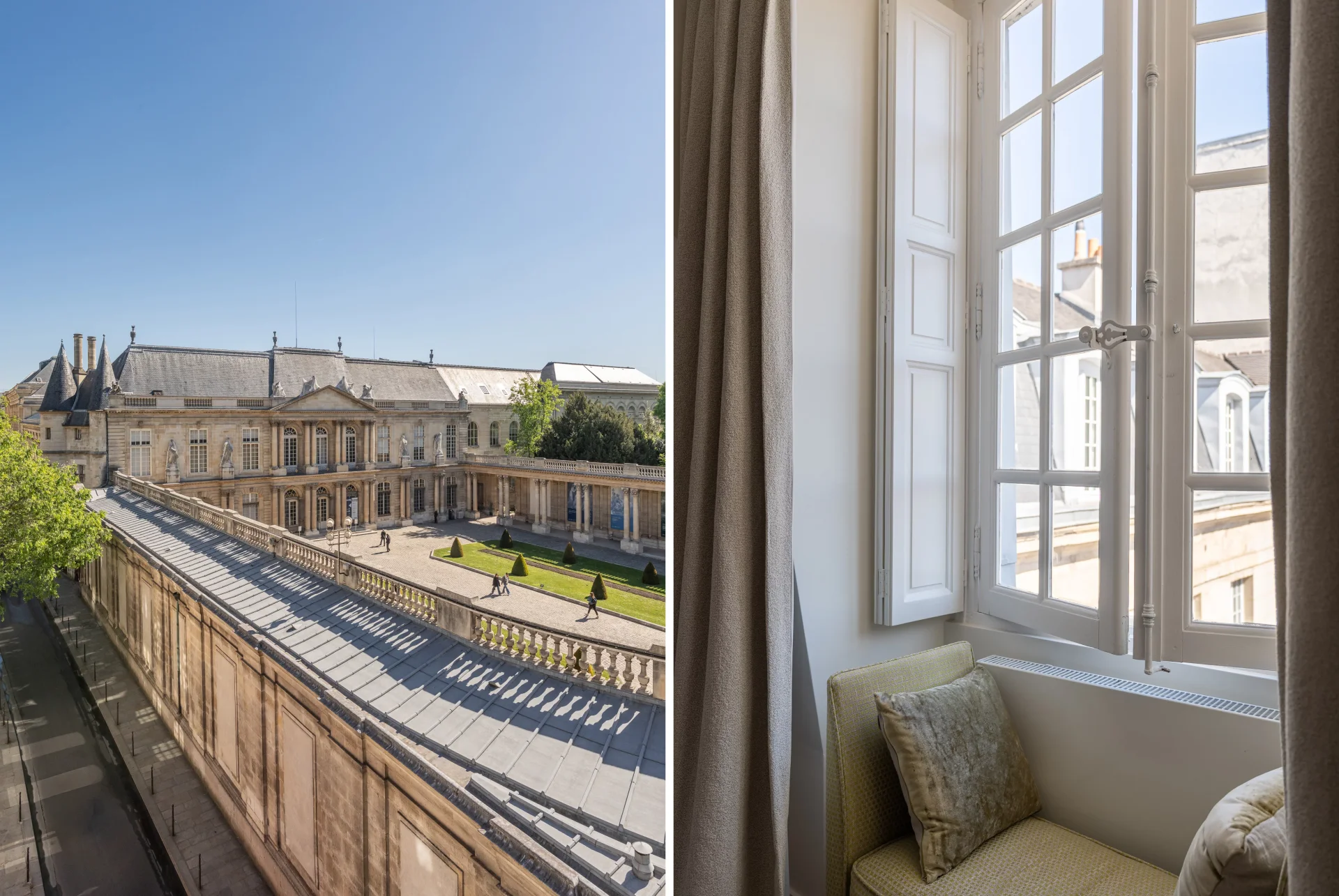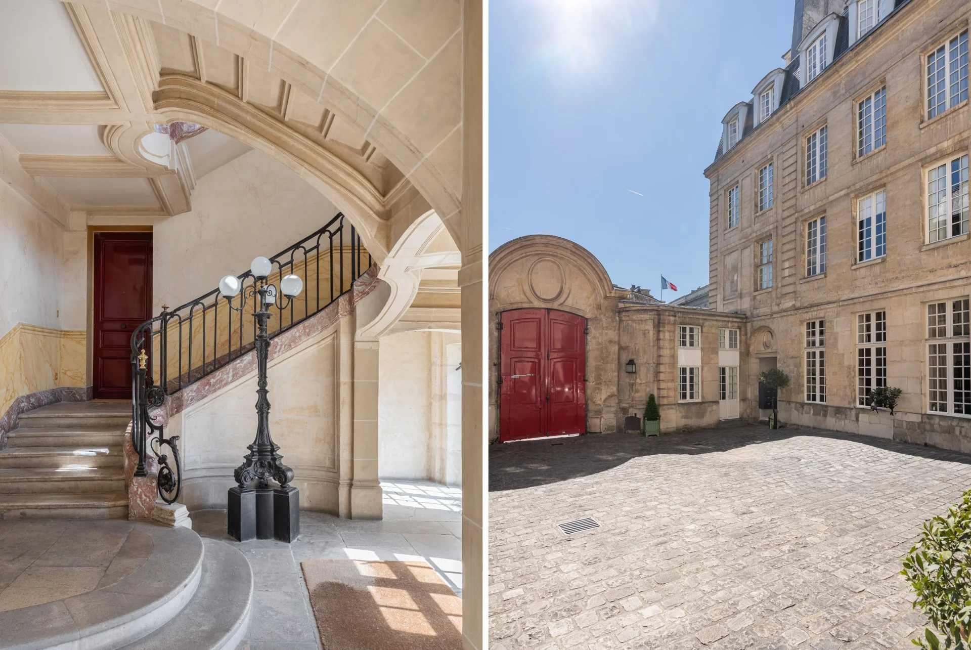 It consists of an entrance, a large reception overlooking the Cour d'Honneur and the gardens of the National Archives, a fully equipped open-plan kitchen, a master bedroom with dressing room and en-suite shower room, a second bedroom with en-suite bathroom, an office (or third bedroom), a shower room, and a laundry room.
