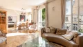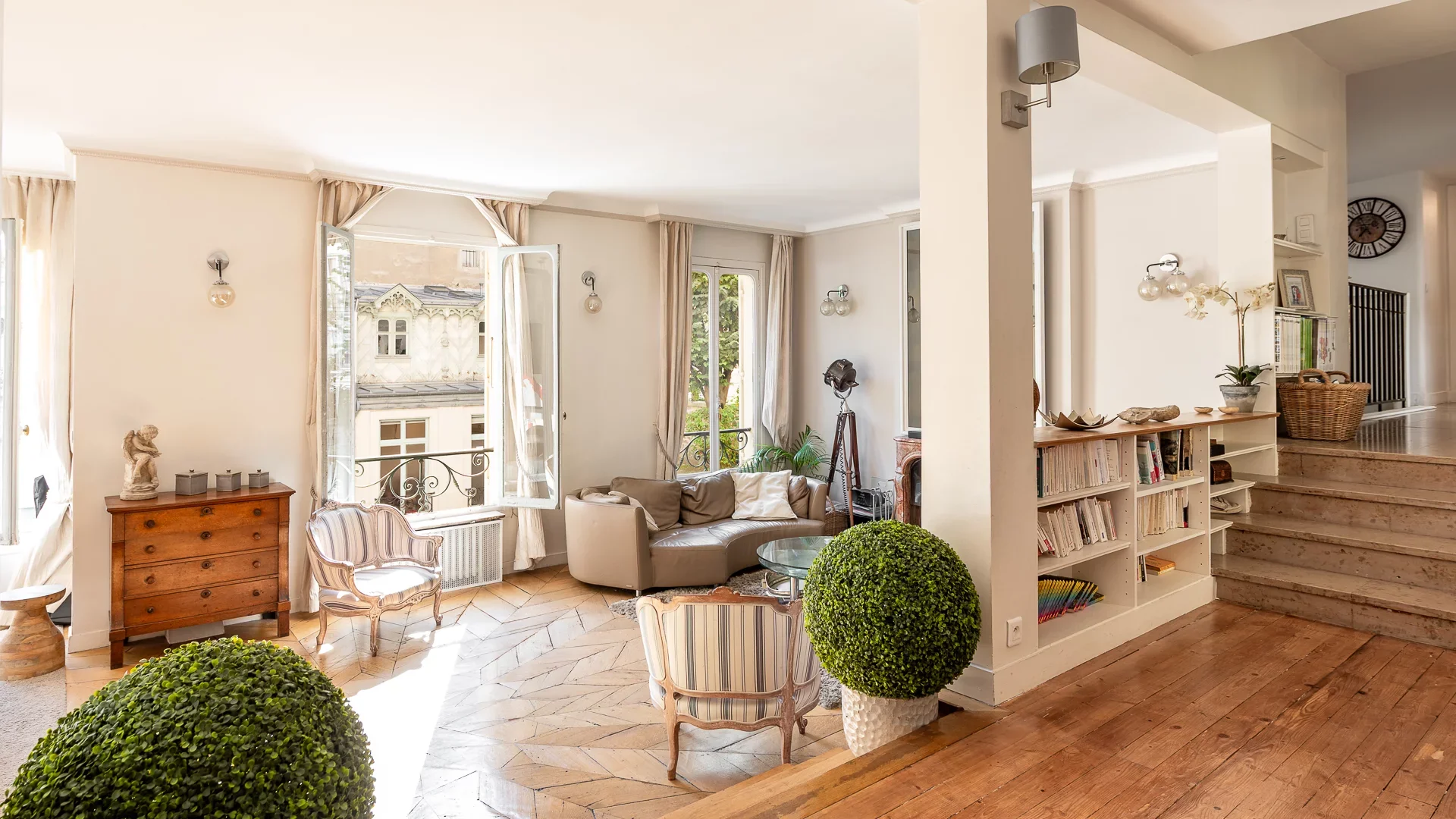 Il s’ouvre sur un vaste double séjour de 50m² baigné de lumière et doté d’une belle cheminée fonctionnelle, d’un parquet en marqueterie rare, d’une belle hauteur sous plafond de trois mètres et de vues dégagées exceptionnelles sur un jardin remarquable.