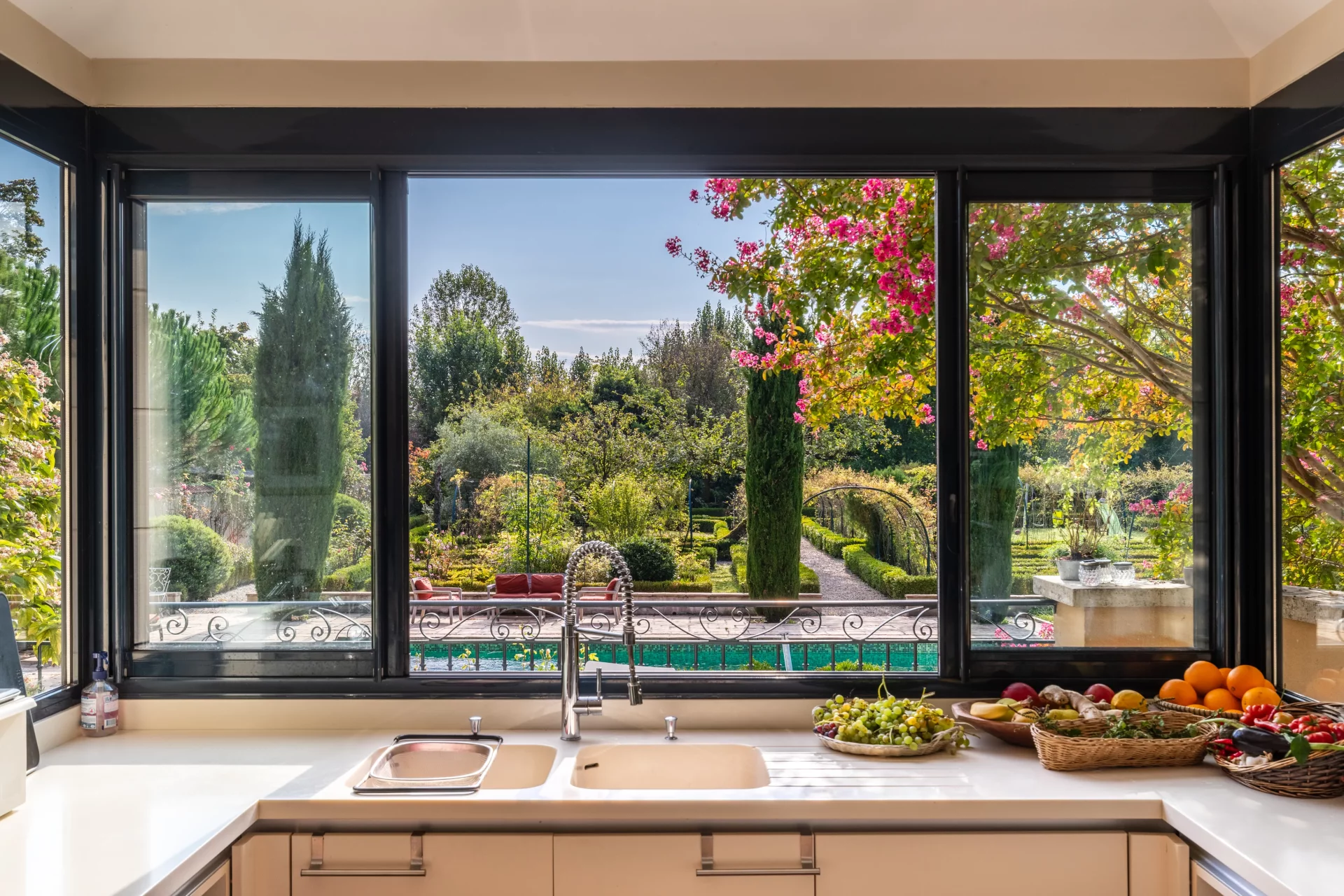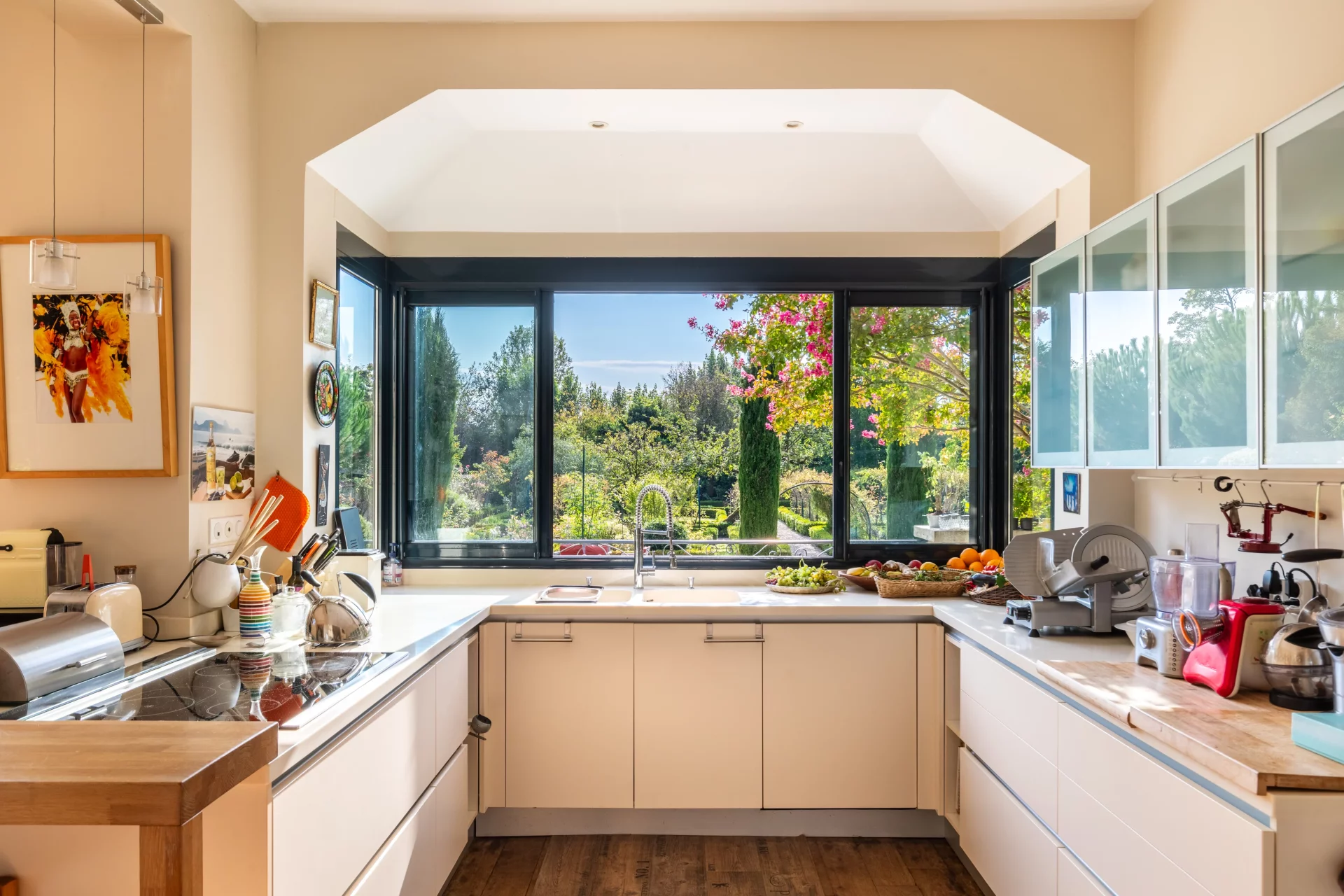 Le rez-de-chaussée accueille les espaces de réception: un hall d’entrée, un séjour avec cheminée et une salle à manger lumineuse. La cuisine familiale, entièrement équipée, donne accès à une terrasse surplombant une magnifique piscine en mosaïque de 15 mètres de long.